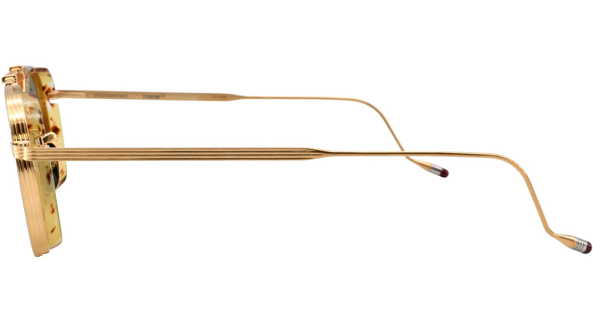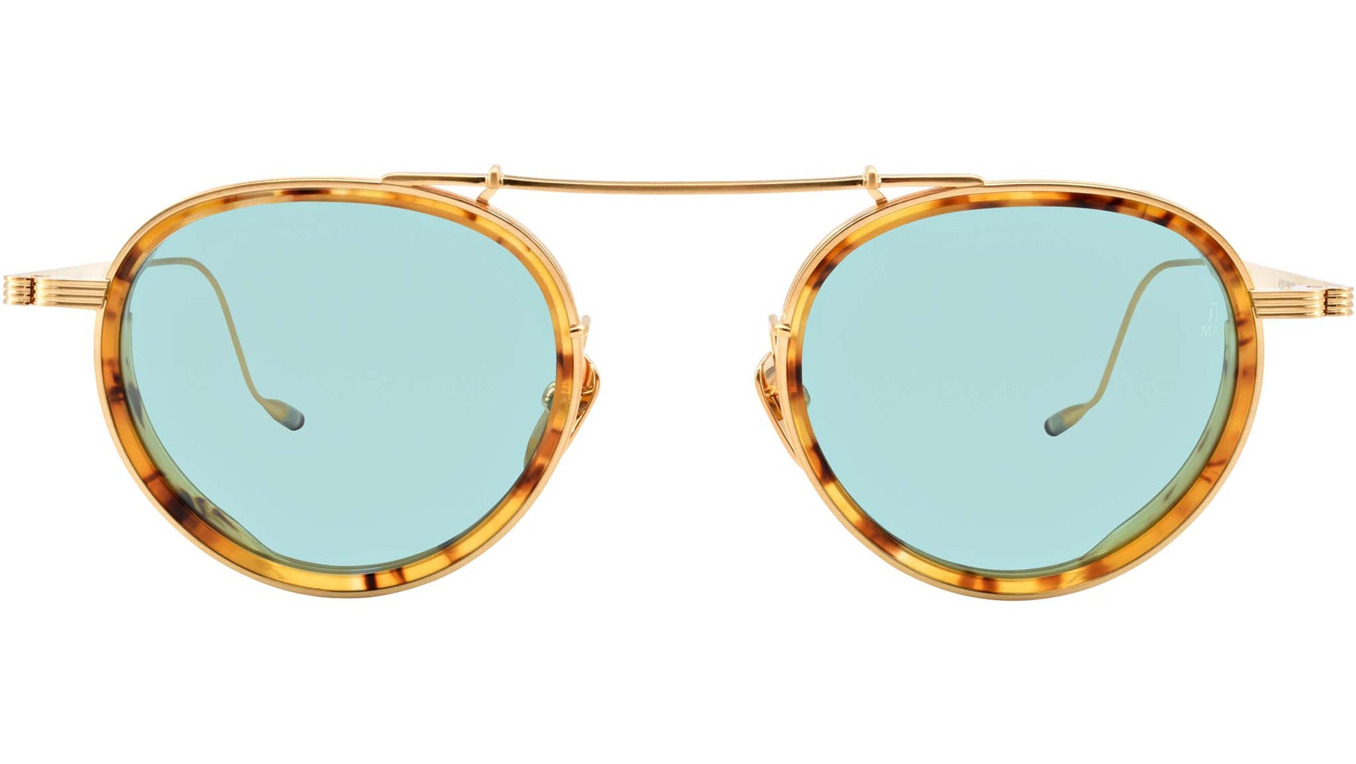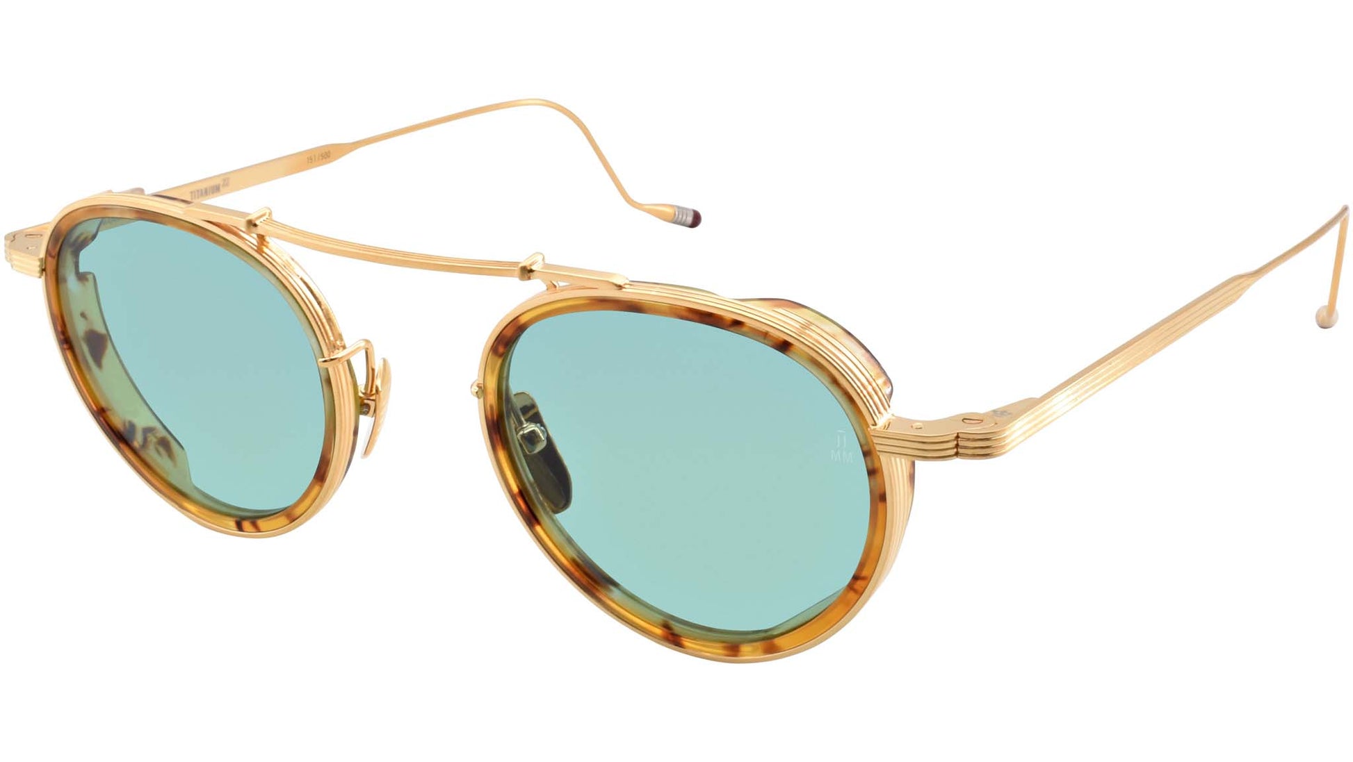 This pair features a light gold 100% beta titanium frame with green lenses, a light gold hairline hinge with burgundy epoxy temple tips, and a vintage tort acetate eyerim insert for a classic aesthetic. It's fitted with custom nose pads engraved with the logo, and the viridian CR-39 base lenses have an anti-reflective treatment on the reverse side for clear vision.