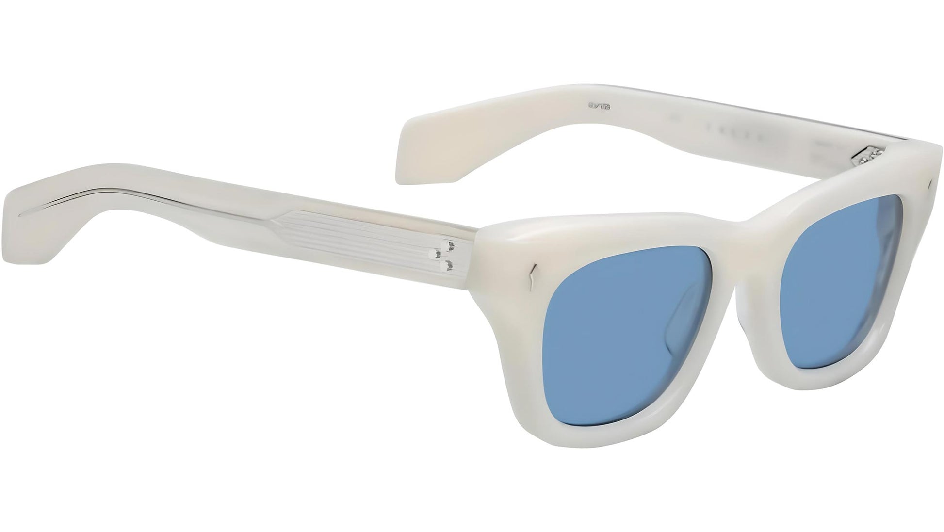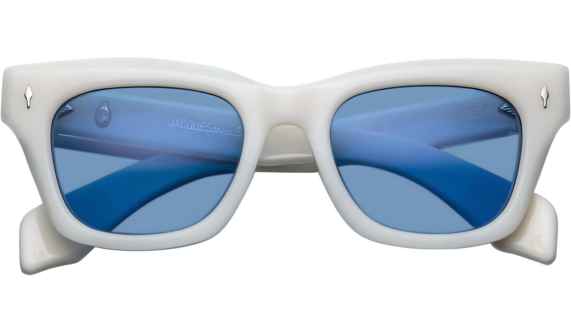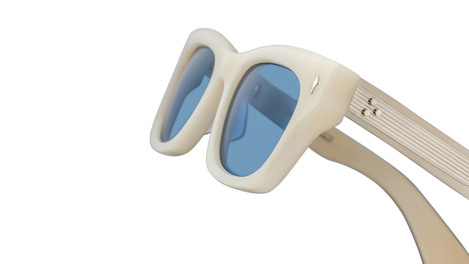 White 10mm cured cellulose acetate frame with custom double-laminated acetate temples and blue lenses. Silver arrowhead front pin, exposed silver wire core with custom hairline engraving, and silver tension-secured custom 7-barrel hinge. Blue CR-39 6 base lenses with backside anti-reflective treatment ensure clarity and comfort. Frame shape: square. Provides 100% UV protection.