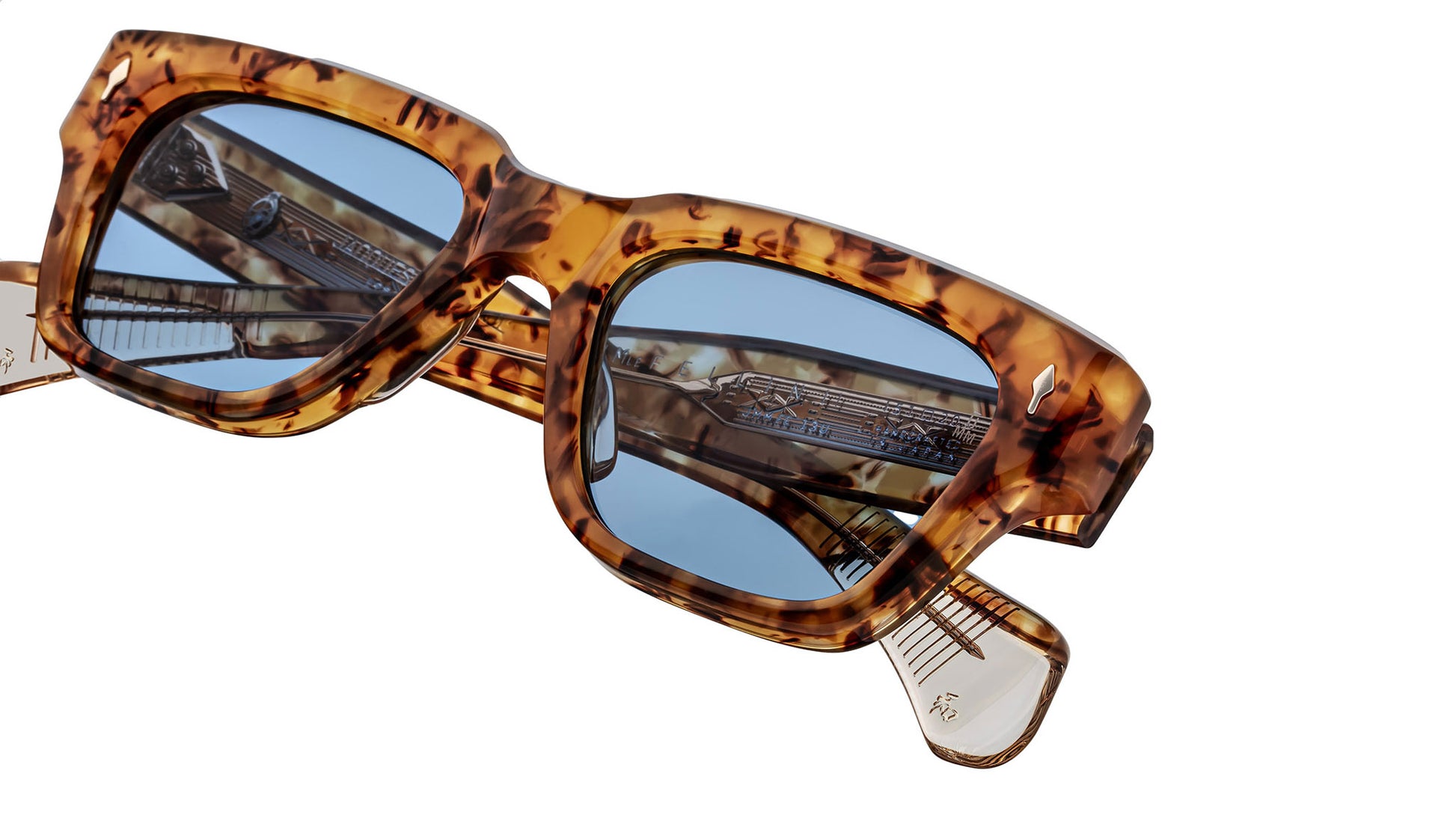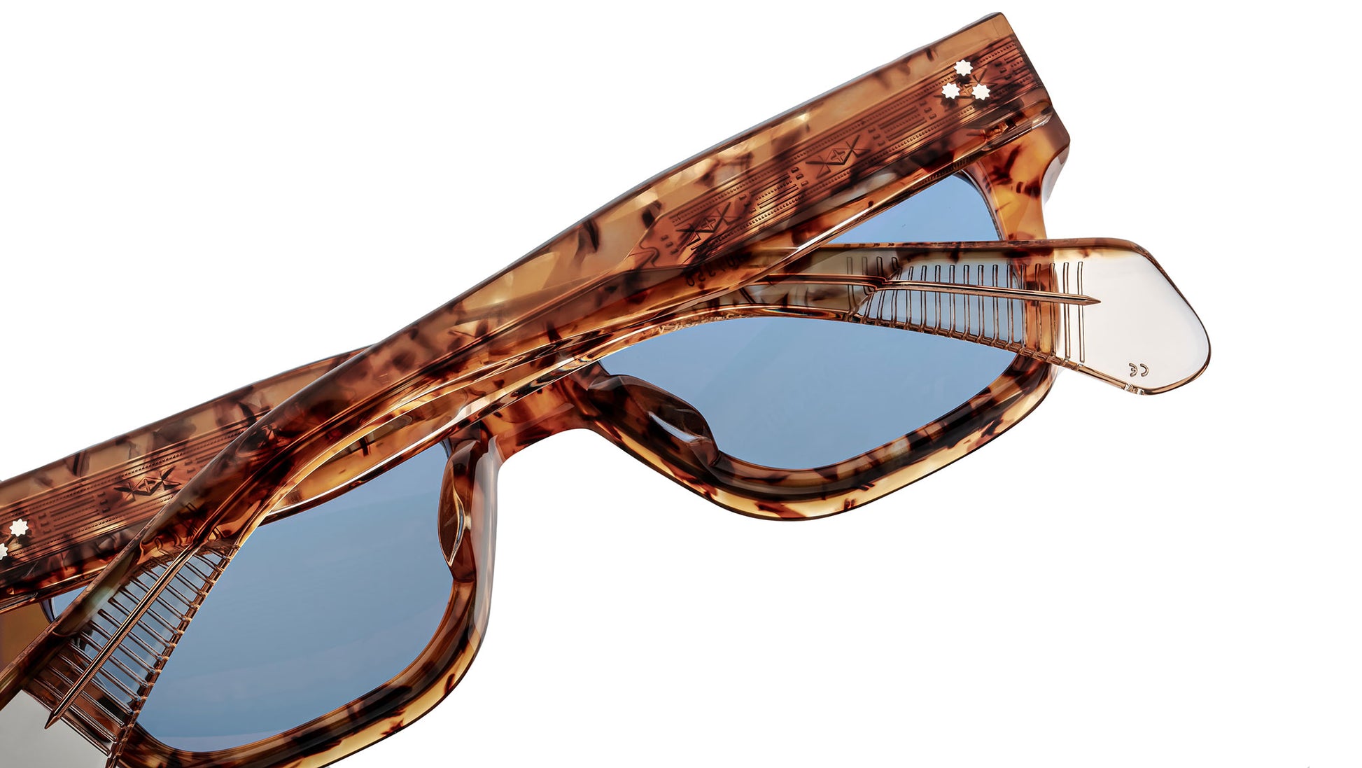 Havana 10mm cured cellulose acetate frame with custom double-laminated acetate temples and blue lenses. Light gold signature arrowhead front pin, hidden outer temple light gold wirecore with custom hairline engraving, light gold tension-secured custom 9-barrel hinge with light gold spur-shaped rivets, Cerulean CR-39 4-base lenses with backside anti-reflective treatment.