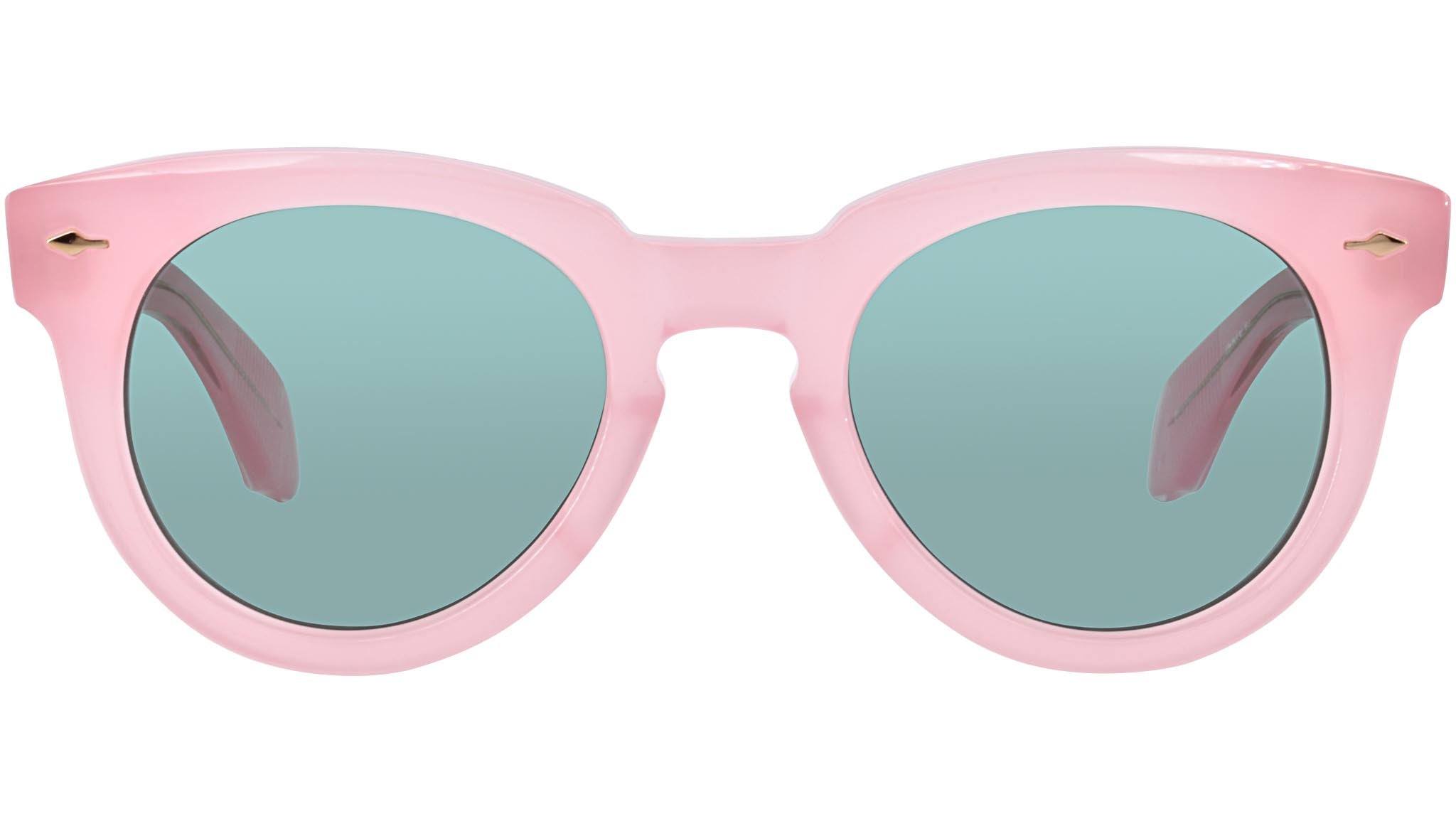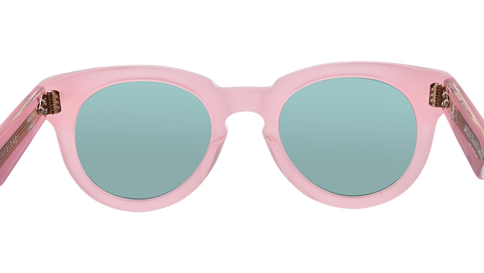 The return of an original style from our debut season--well-balanced, unisex glasses with a modified Panto shape, keyhole nose design, and exposed wirecore temples with signature embellishments. Pink 10mm cured cellulose acetate frame with custom double laminated temples featuring precious metal hardware and green lenses. Light gold arrowhead front pin. Hidden light gold wirecore with custom hairline engraving. Light gold tension-secured custom 7 barrel hinge. Seagreen CR-39 4 base lens with backside anti-reflective treatment. 100% UV protection.