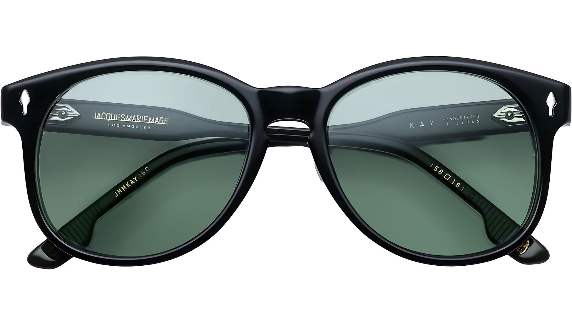Black 10mm cured cellulose acetate frame with custom double-laminated acetate temples, accented by sterling silver precious metal hardware and fern green glass lenses. Features include a sterling silver signature arrowhead front pin, exposed Vauxhall wirecore, and a silver tension-secured custom 5-barrel hairline hinge. The 4-base lenses offer a backside anti-reflective treatment, delivering 100% UV protection. Frame total width: mm.