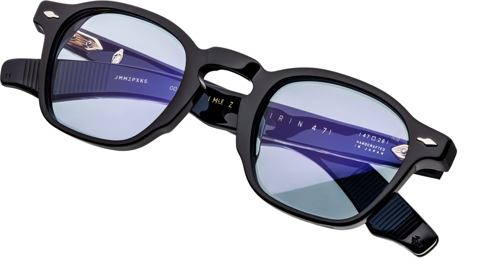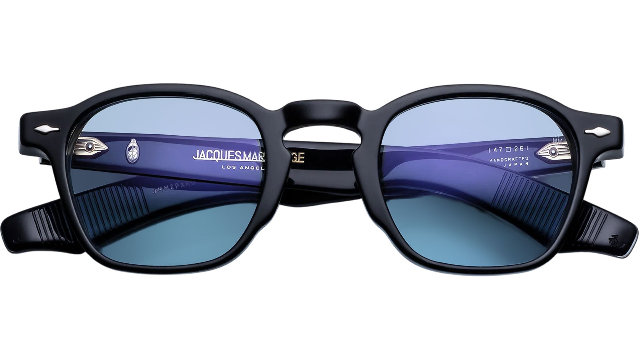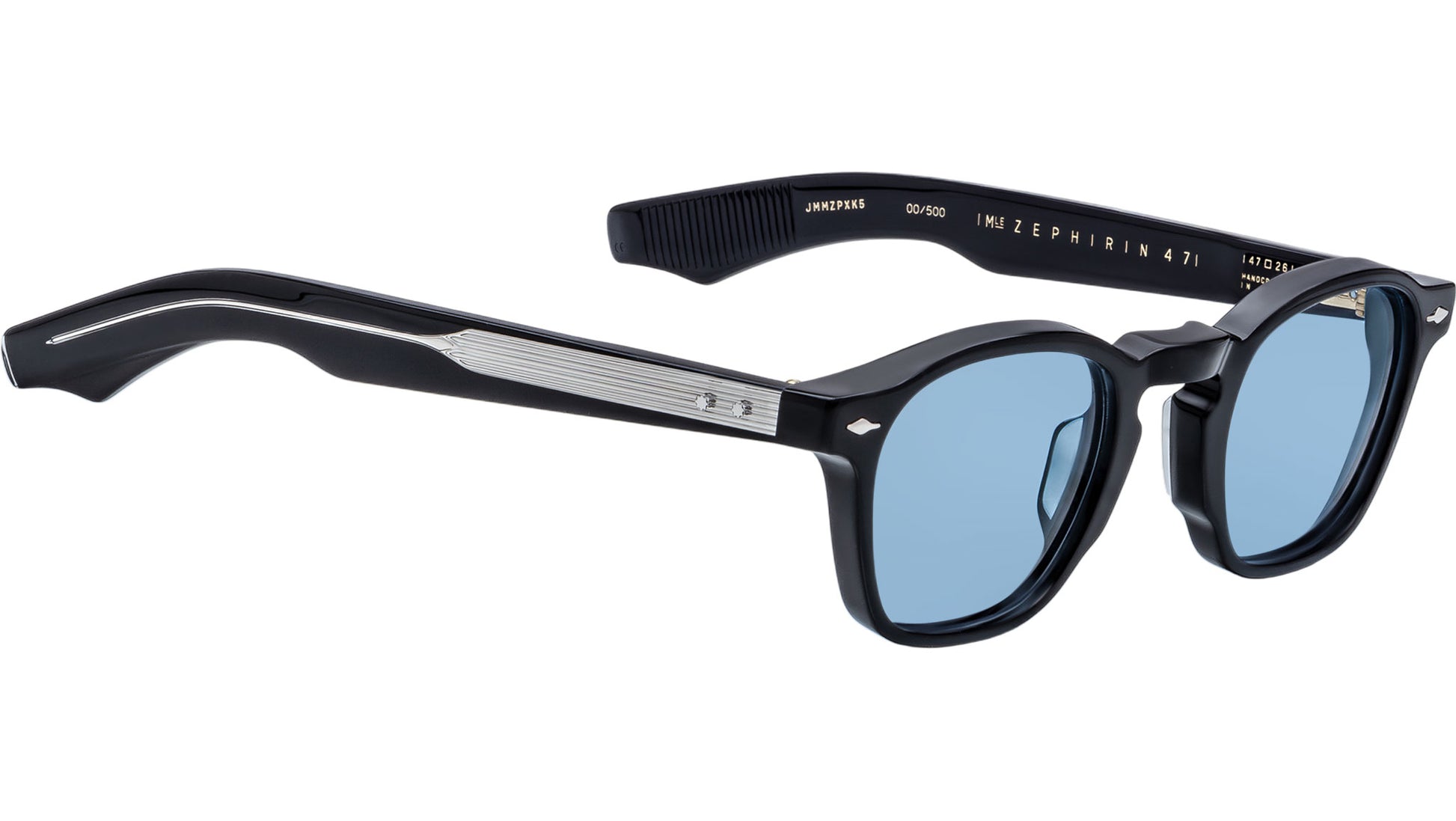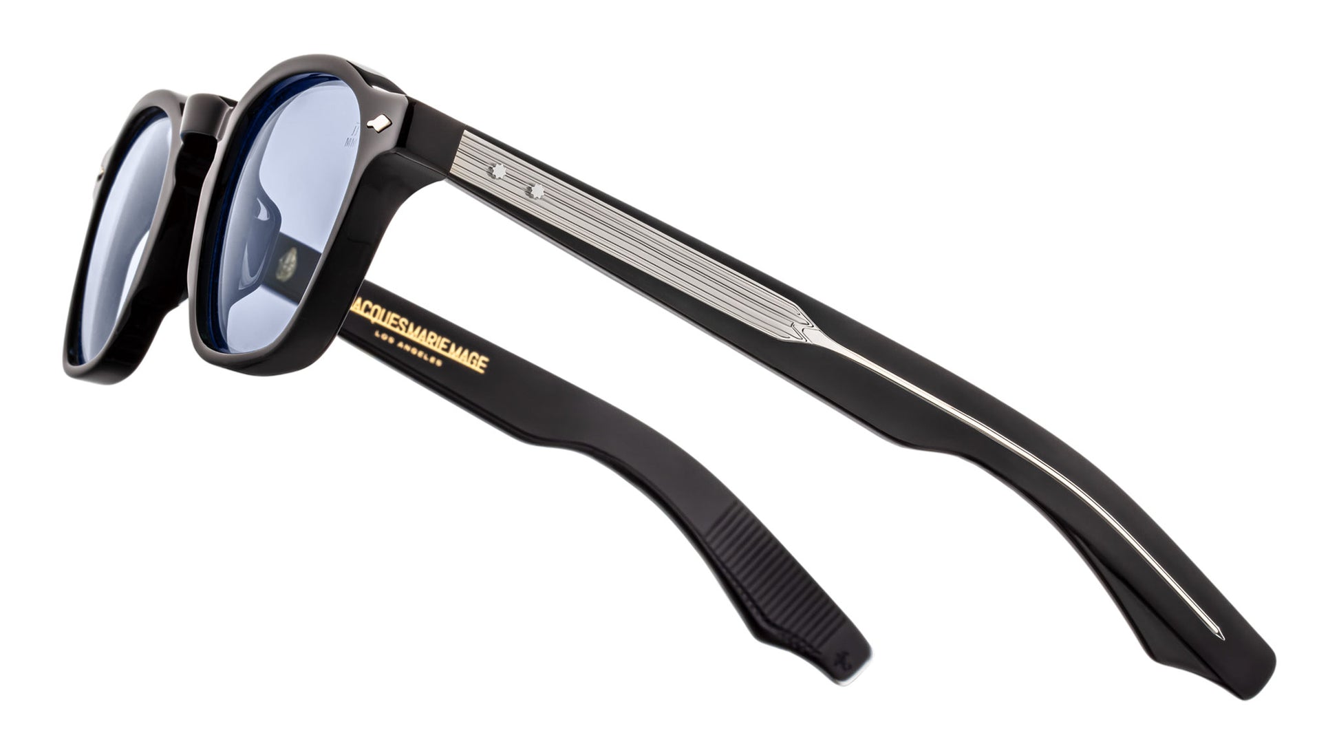 Black 10mm cured cellulose acetate frame with custom double-laminated acetate temples and blue lenses, silver signature arrowhead front pin, silver exposed wirecore, silver tension-secured custom 5-barrel hinge with sterling silver spur-shaped rivets, serene blue CR-39 6-base lenses with backside anti-reflective treatment.