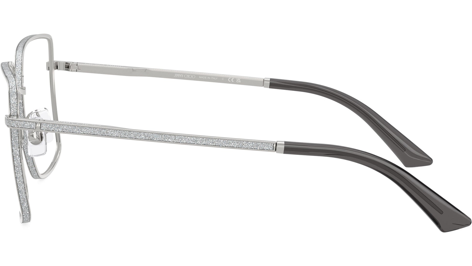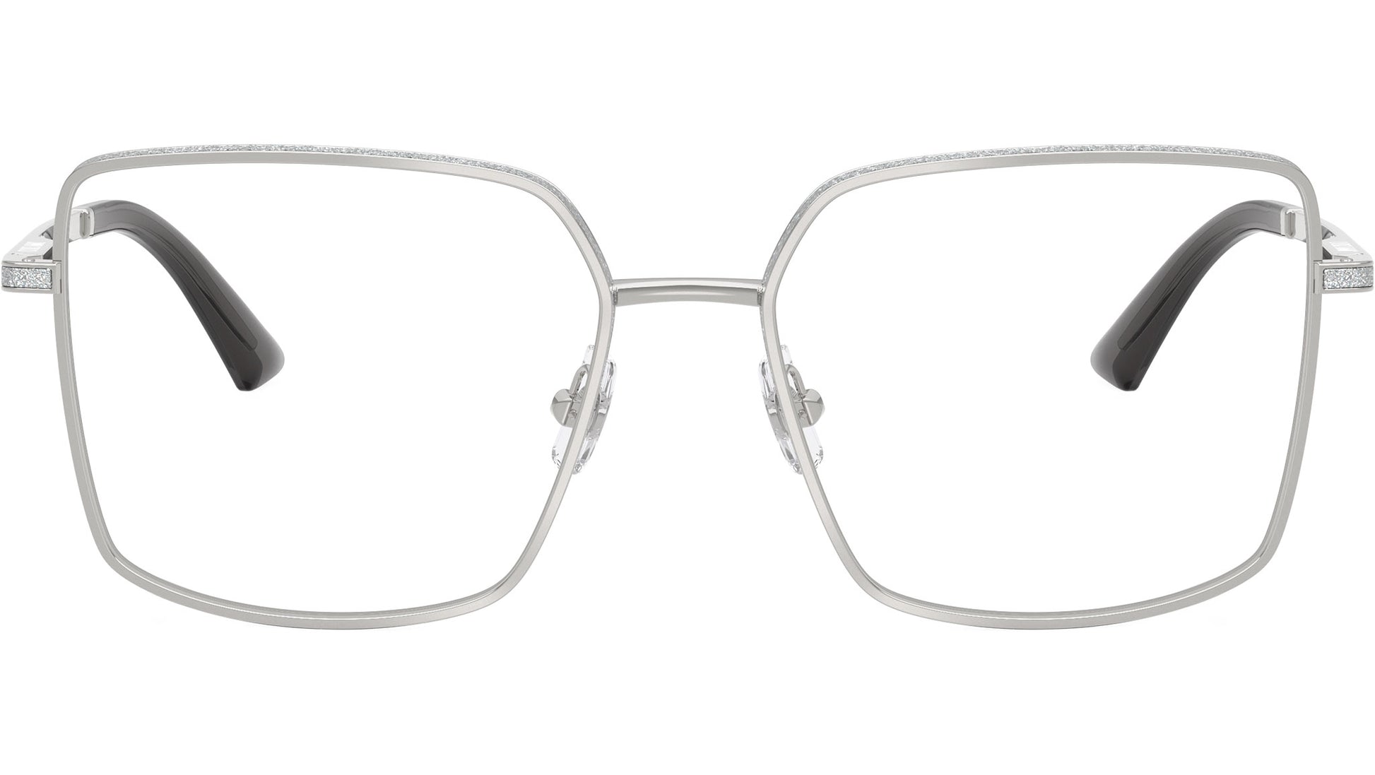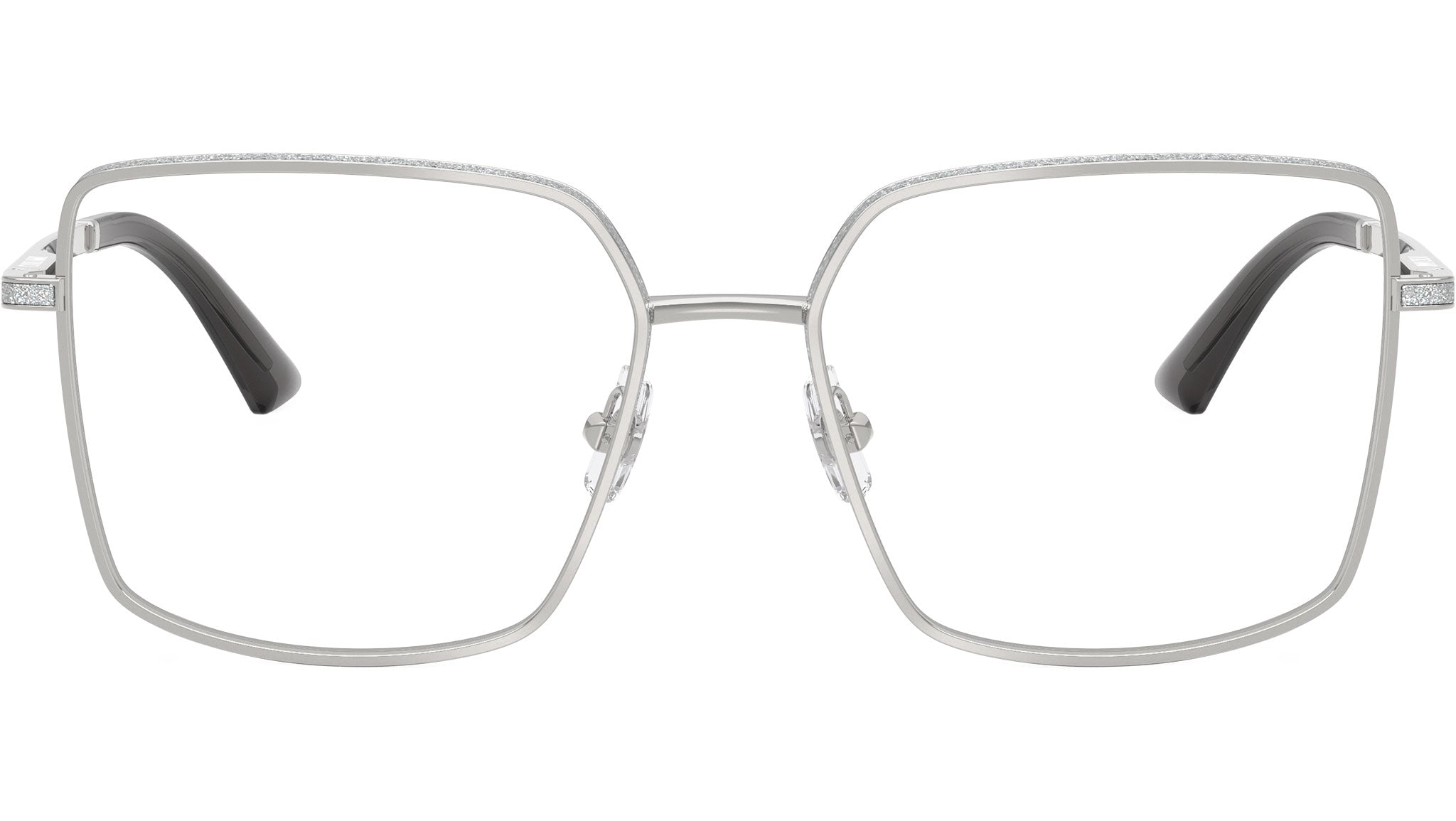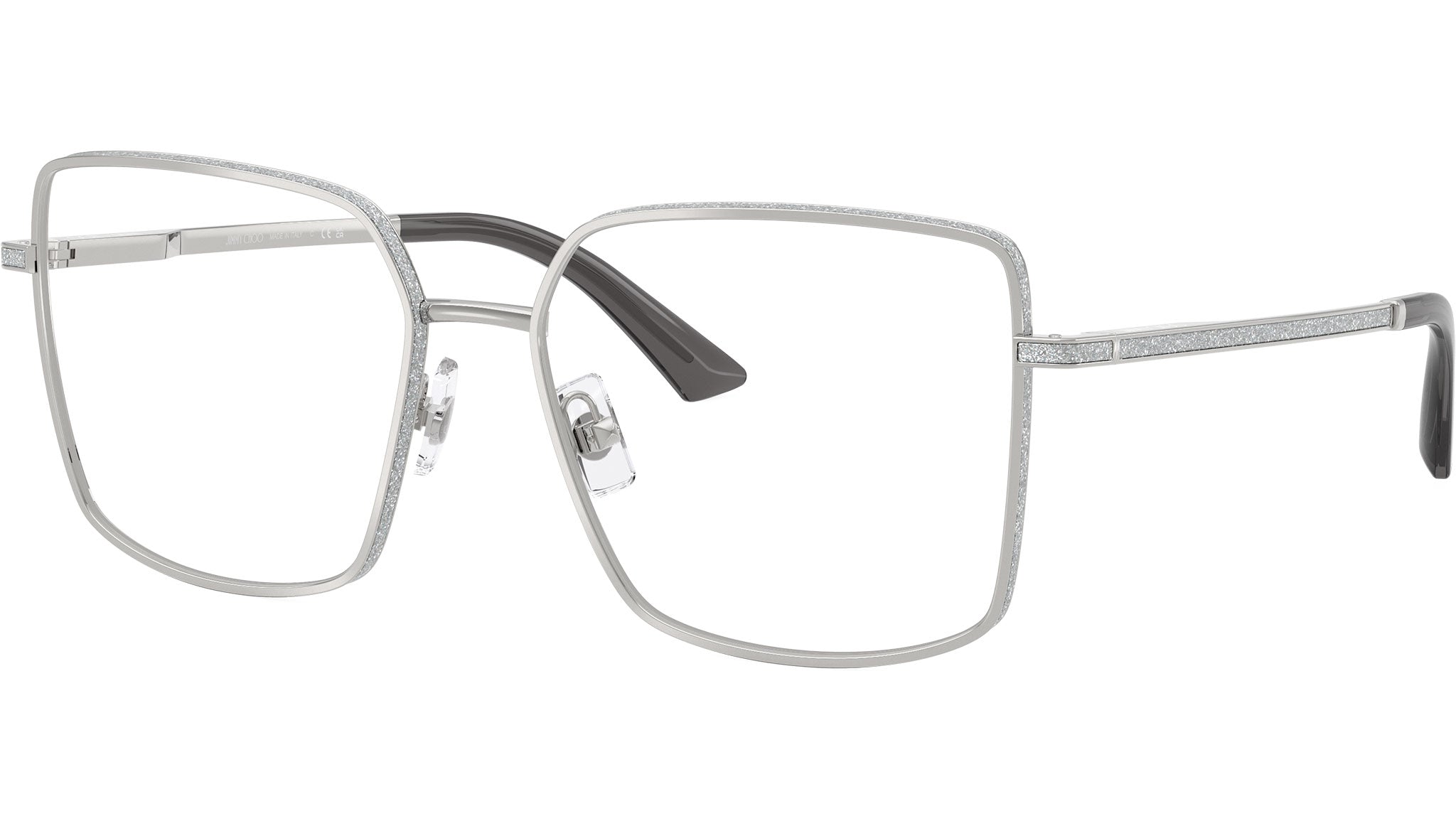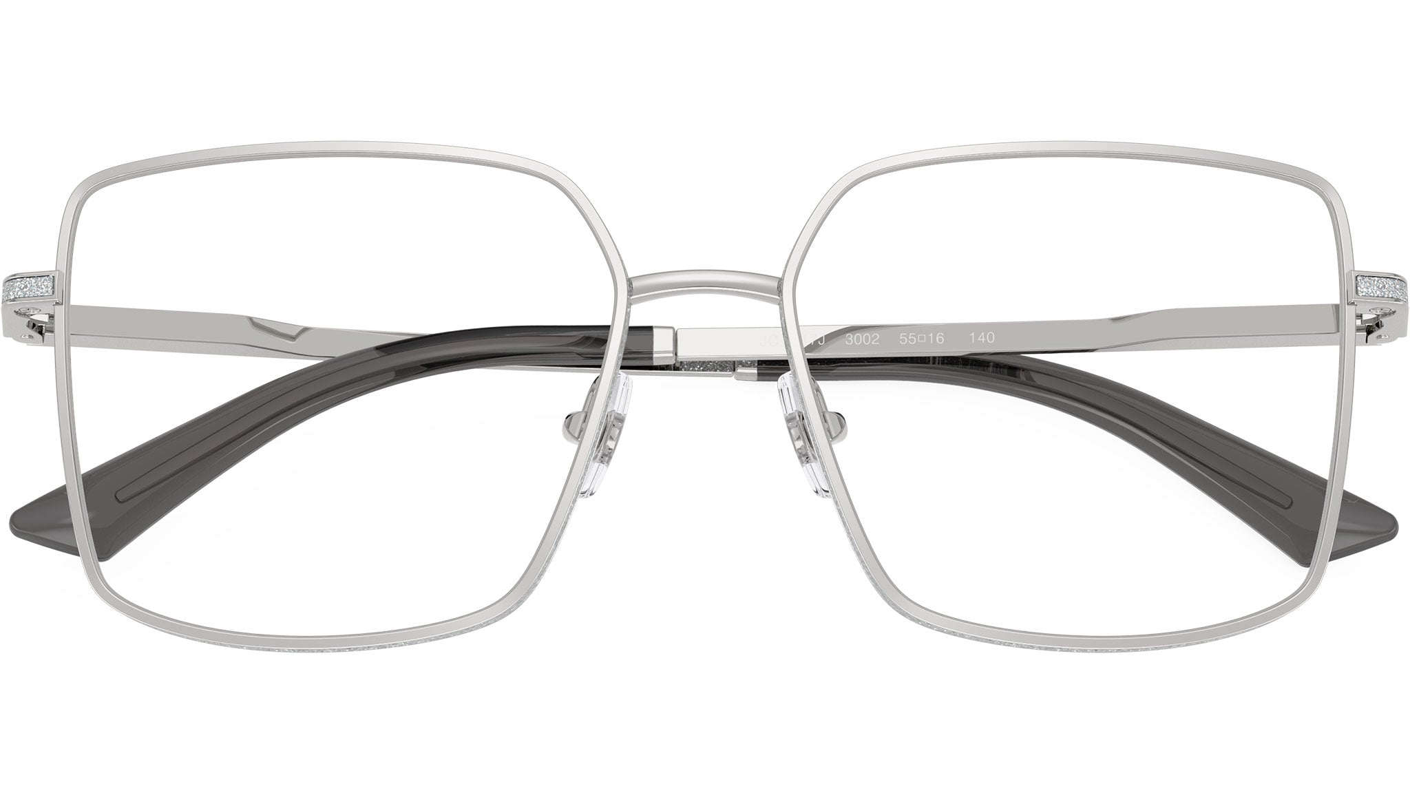 Jimmy Choo JC2017J 3002 glasses for women, featuring silver squared metal frame and demo lenses. Adjustable nosepads. Brand line: Crystal. Style code: 0JC2017J. Color code: 3002. Authorized Jimmy Choo online reseller. Your glasses will include the original case and accessories and are covered by a 12-month global warranty.