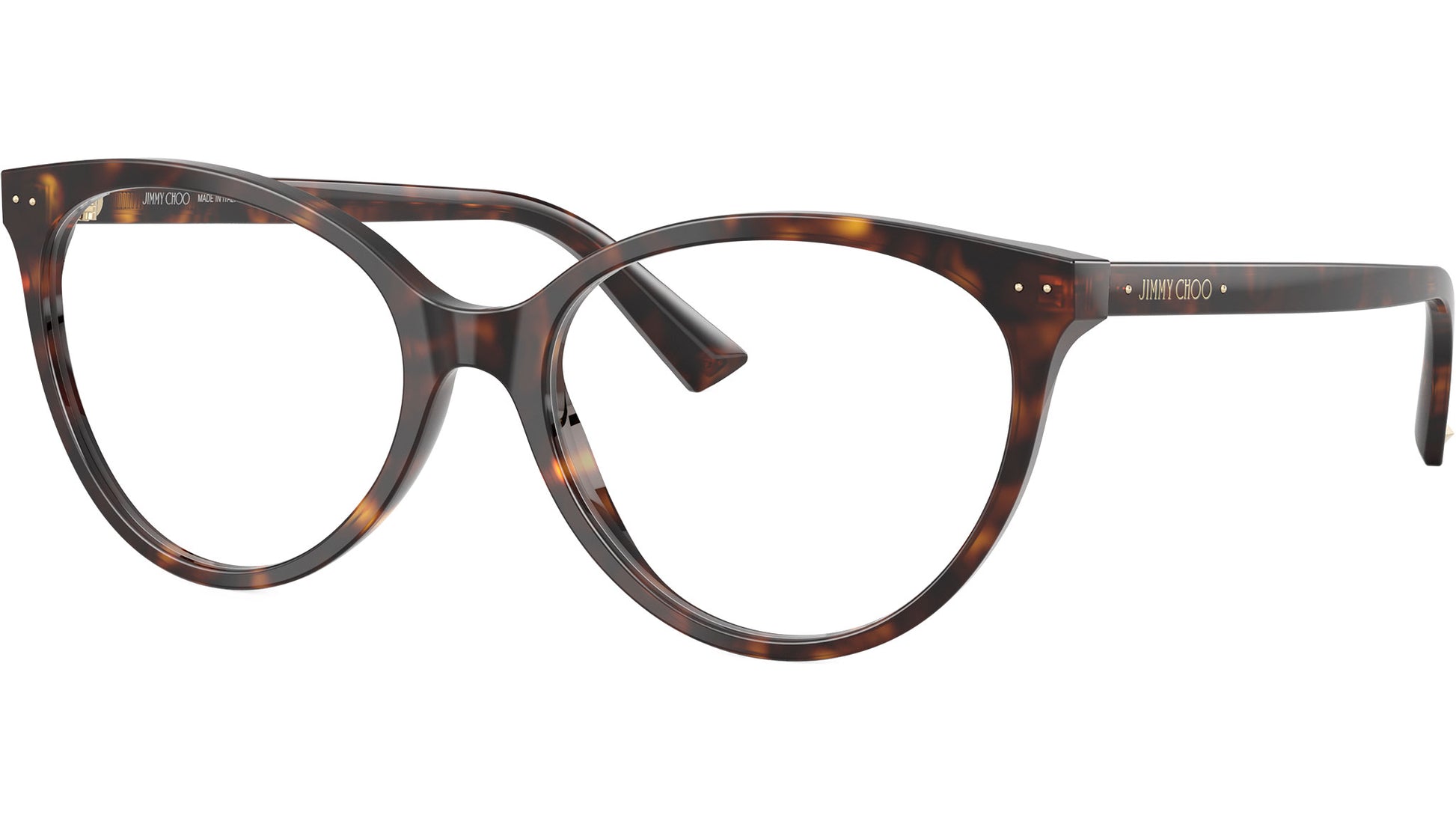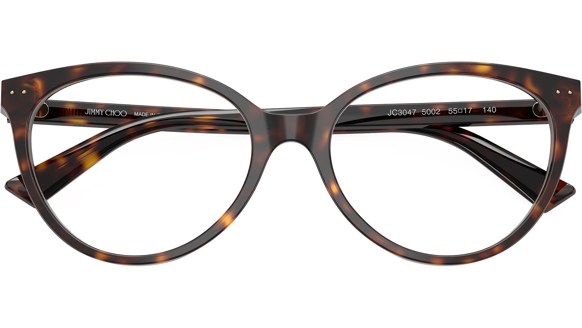 Jimmy Choo JC3047 5002 glasses for women, featuring havana panthos acetate frame and demo lenses. High bridge fit. Brand line: JC Monogram. Style code: 0JC3047. Color code: 5002. Authorized Jimmy Choo online reseller. Your glasses will include the original case and accessories and are covered by a 12-month global warranty.