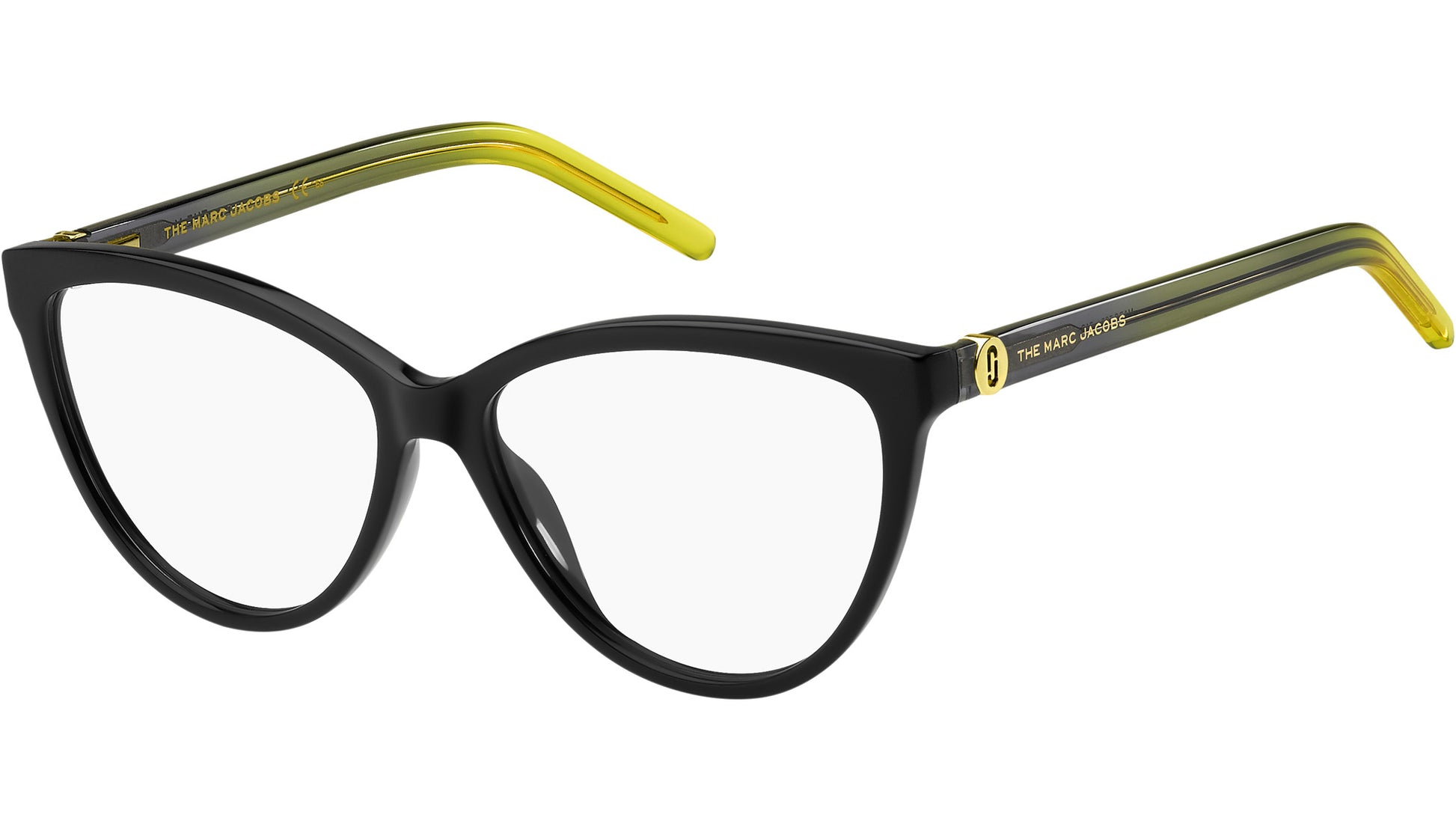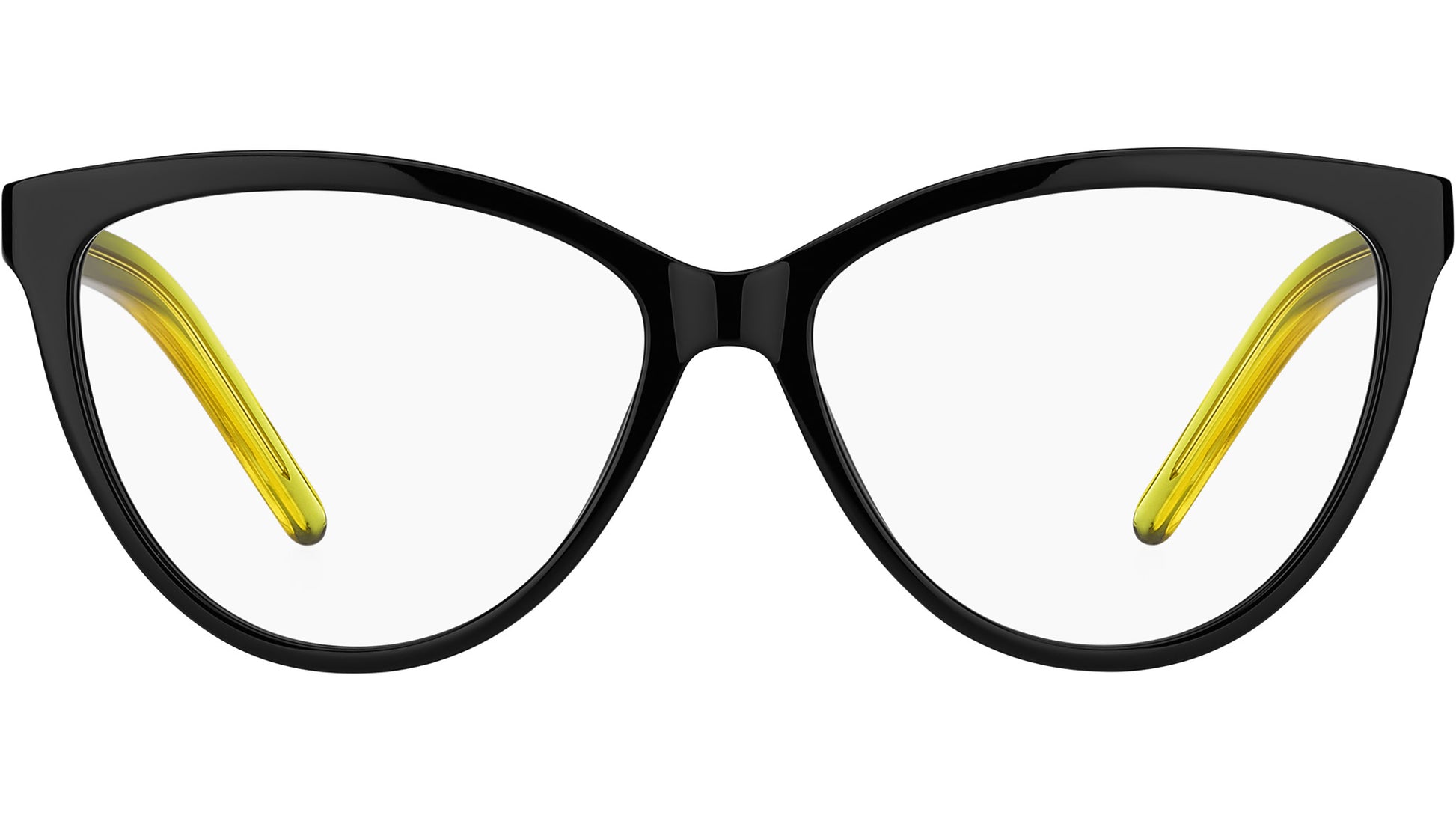 Marc Jacobs MARC 599 71C glasses for women, featuring black yellow cat eye acetate frame and demo lens lenses. Elegant, feminine, and easy to wear, these prescription glasses are sure to inject confidence and personality into any look. The chic cat-eye frames are sculpted from glossy acetate that displays a beautiful ombré effect on the arms. The glistening JJ logo plaques and The Marc Jacobs logo lettering stamped on the temples add instantly recognizable luxurious appeal. A set of interchangeable flex hinges ensure durability and a precise fit. Brand line: Signature. Style code: 105793. Color code: 71C. Authorized Marc Jacobs online reseller. Your glasses will include the original case and accessories and are covered by a 12-month global warranty.