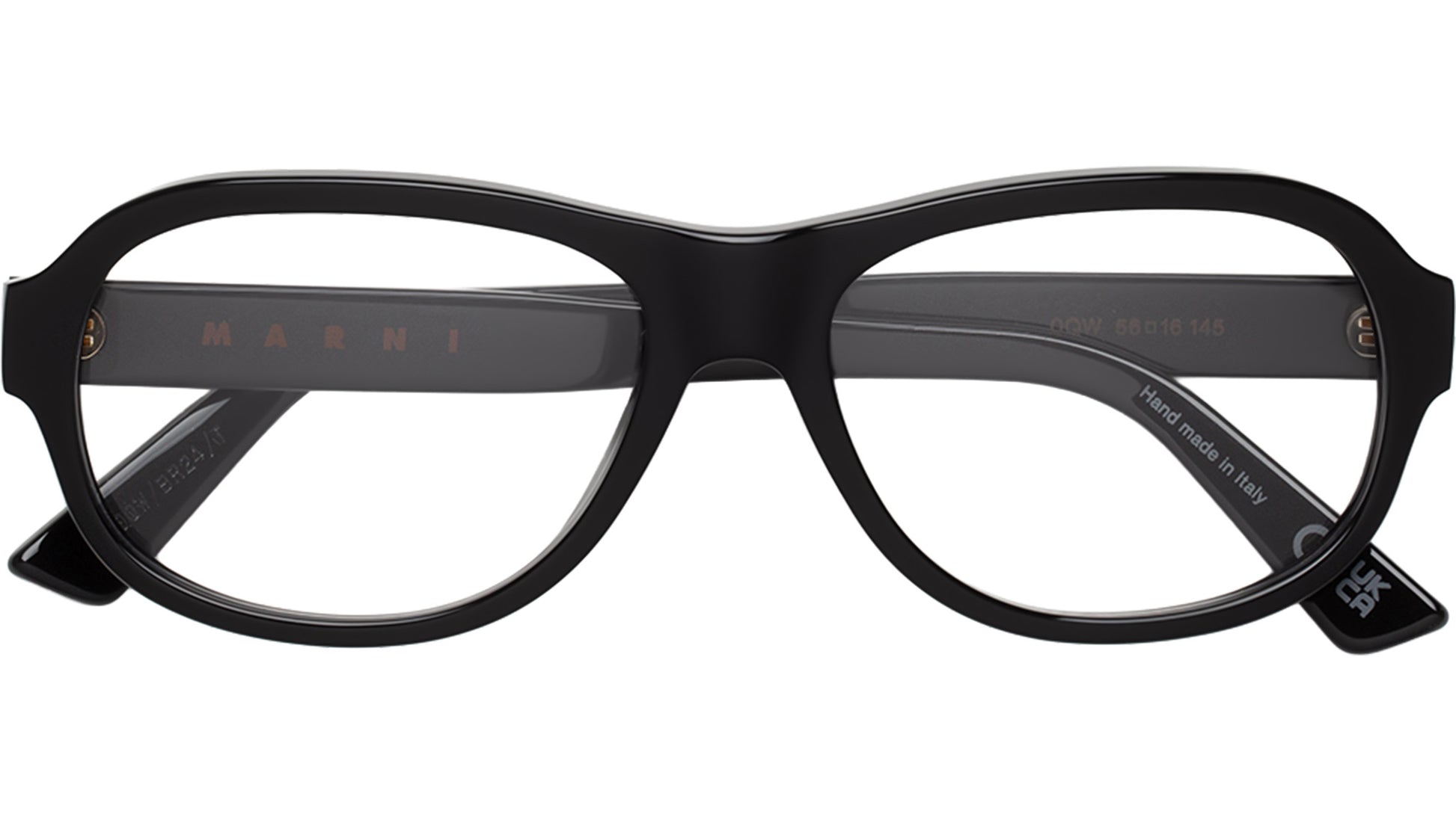 High grade Italian acetate in a timeless shiny black. Mounting clear display lenses in base 4. Prescription lens not included. Premium eyewear handmade in Italy. Sizes: R. Lens Width: 56 mm. Frame Front: . Frame Side: 145 mm. . Product Code Size R: 0QW.