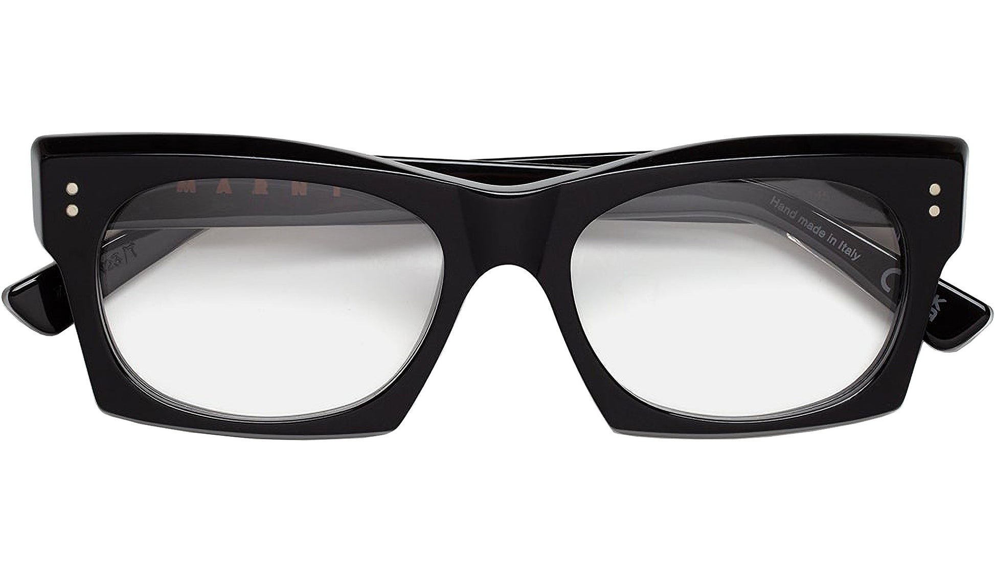 Designed exclusively for Marni, Edku is a sharp and angular silhouette characterised by carefully sculpted rims. The model features geometric temples and a squared lower line, with rounded lenses softening the austere appearance of the silhouette. For this optical edition of the shape, the rims have been carved to ensure lightness and wearability in everyday use. Metal rivets on the front and a visible metal core on the temples add a sophisticated touch to this all-black frame. Sizes: R Lens Width: 54 mm. Frame Front: Frame Side: 145 mm. Product Code Size R: ZFZ