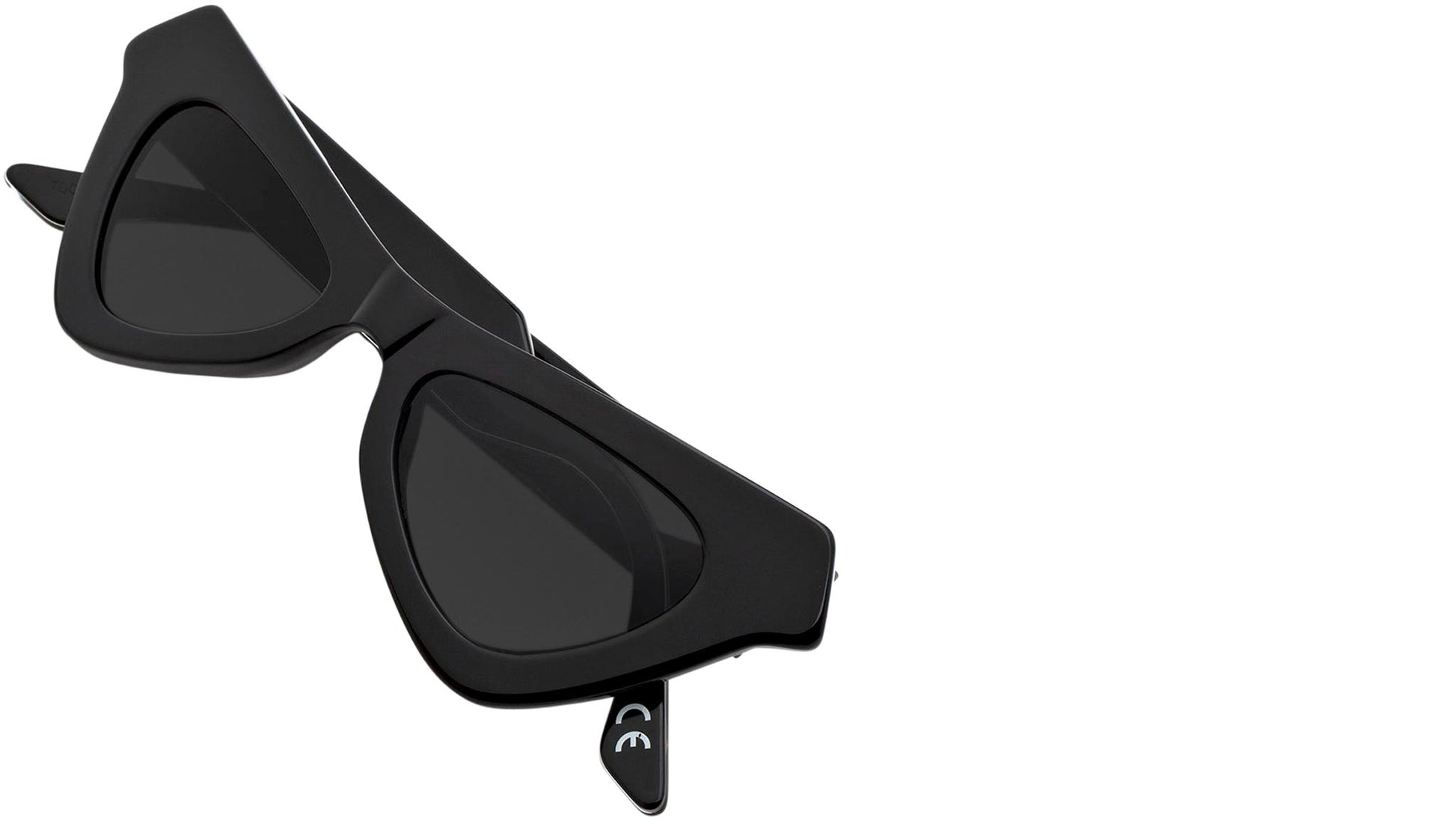 Designed exclusively for Marni, Fairy Pools is an iconic shape created as a bold geometric interpretation of classic cat-eye frames. The model’s recognisable silhouette features sharp, pointed rims encasing triangular lenses. A sturdy nose-bridge and thick temples complete the unique geometry of the piece. This version comes in black acetate with black lenses. Sizes: R Lens Width: 50 mm. Frame Front: Frame Side: 145 mm. Product Code Size R: TQQ