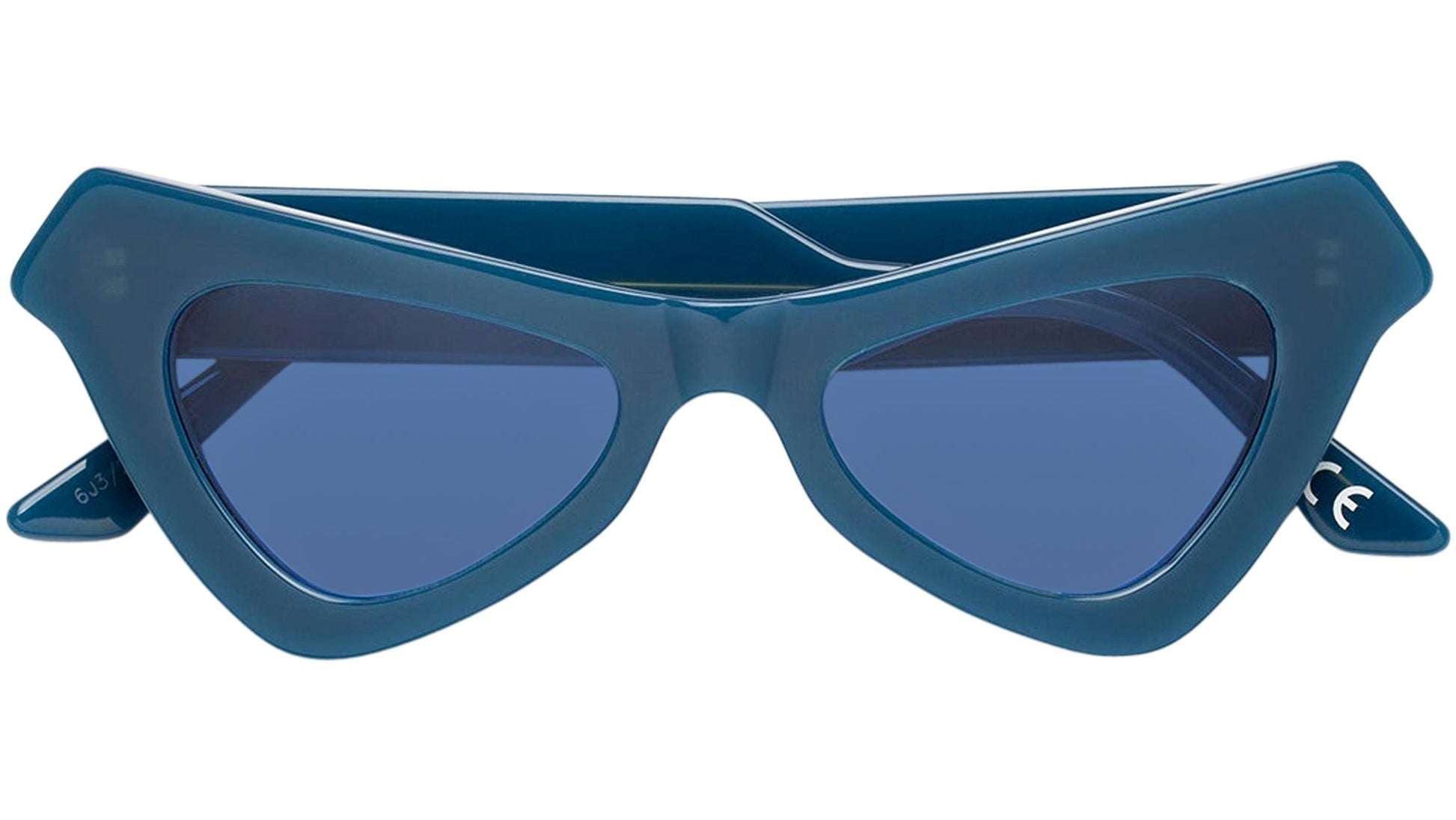 Designed exclusively for Marni, Uyuni Desert is an iconic shape created as a bold geometric interpretation of classic cat-eye frames. The model’s recognisable silhouette features sharp, pointed rims encasing triangular lenses. A sturdy nose-bridge and thick temples complete the unique geometry of the piece. This version comes in a bright blue acetate with matching lenses. Sizes: R Lens Width: 50 mm. Frame Front: Frame Side: 145 mm. Product Code Size R: 6J3