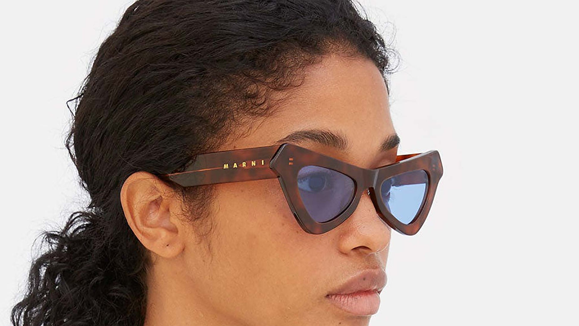 Designed exclusively for Marni, Fairy Pools is an eclectic interpretation of classic cat-eye frames. The iconic shape highlights Marni’s approach to design that emphasises unexpected geometries and deconstructed forms. The model’s recognisable silhouette features sharp, pointed rims encasing triangular lenses. A sturdy nose-bridge and thick temples complete the unique geometry of the piece. This version comes in a warm Havana acetate with blue tinted lenses. Sizes: R / R Lens Width: 50 mm. Frame Front: Frame Side: 145 mm. Product Code Size R: 9S9 Product Code Size R: 6F7