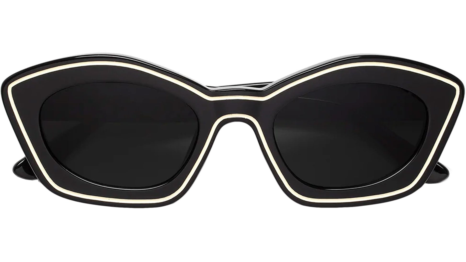 Kea Island is a genderless interpretation of classic cat-eye silhouettes. In line with Marni’s approach to design, characterized by unique geometries, deconstruction, and graphic detailing, these sunglasses are a hybrid piece that matches high-end construction with experimental style. The model features an angular design with a markedly curved rim on the top. The front has been laser engraved and filled with color to further evidence this iconic shape. This version comes with black acetate and contrasting white detailing.