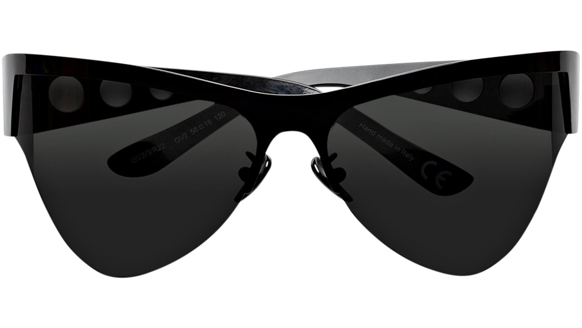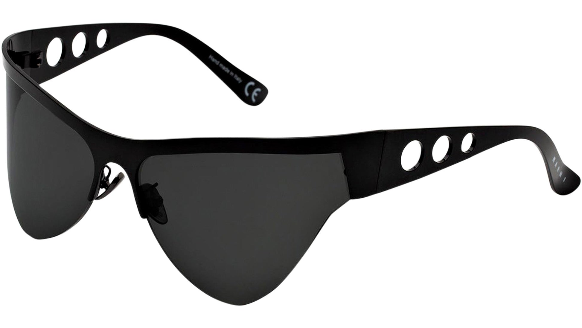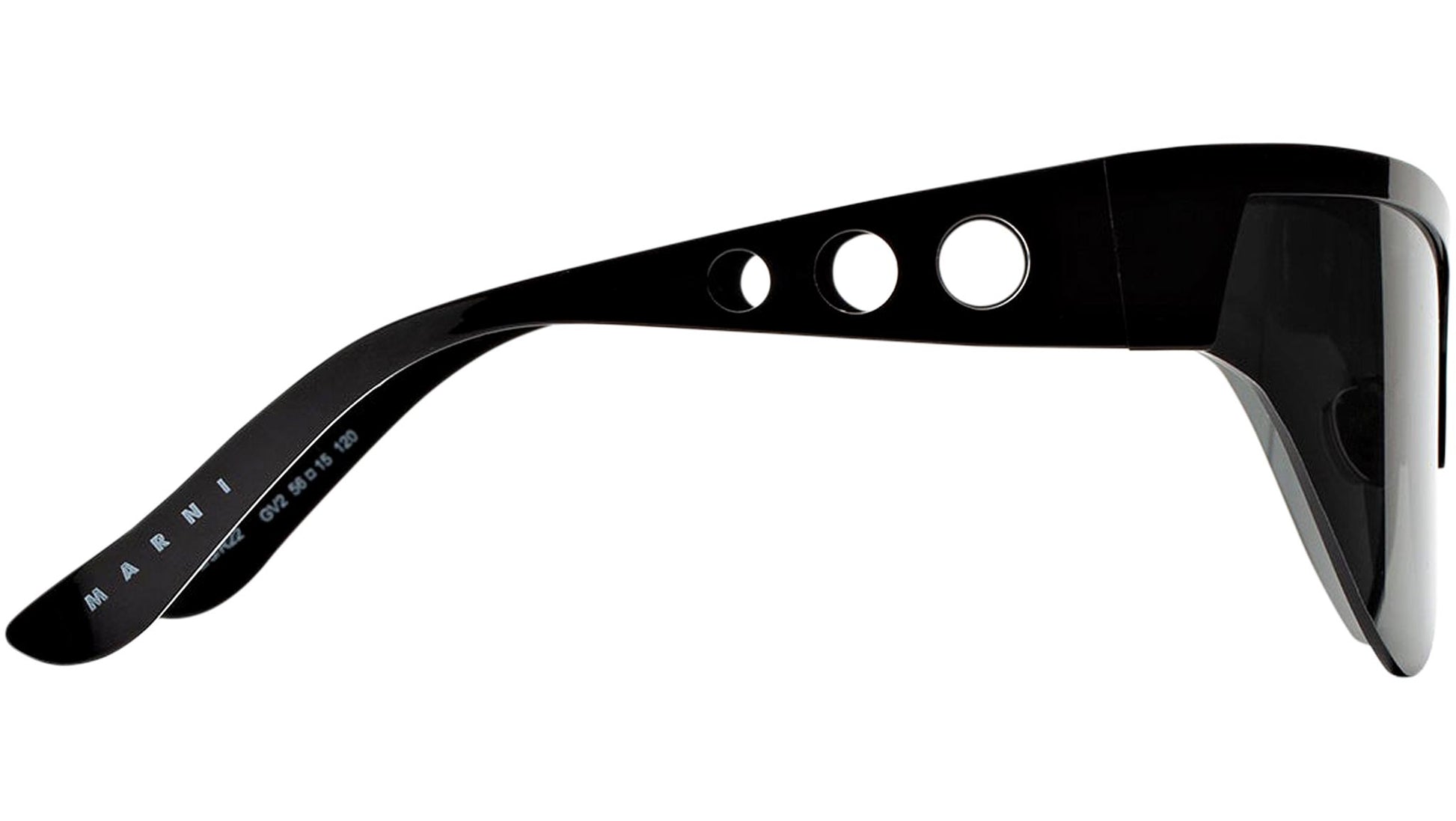 Designed exclusively for Marni, Mauna Loa is a forward-looking contemporary silhouette created for those looking for a more experimental style. Futuristic in outlook, the model was inspired by iconic sci-fi visions, with its carved metal structure and triangular lenses. The silhouette is characterized by a distinctive V-shaped profile, with streamlined temples and nose-pads. This version comes in a shiny black metal finish with smoky grey lenses. Sizes: R Lens Width: 66 mm. Frame Front: Frame Side: 120 mm. Product Code Size R: GV2