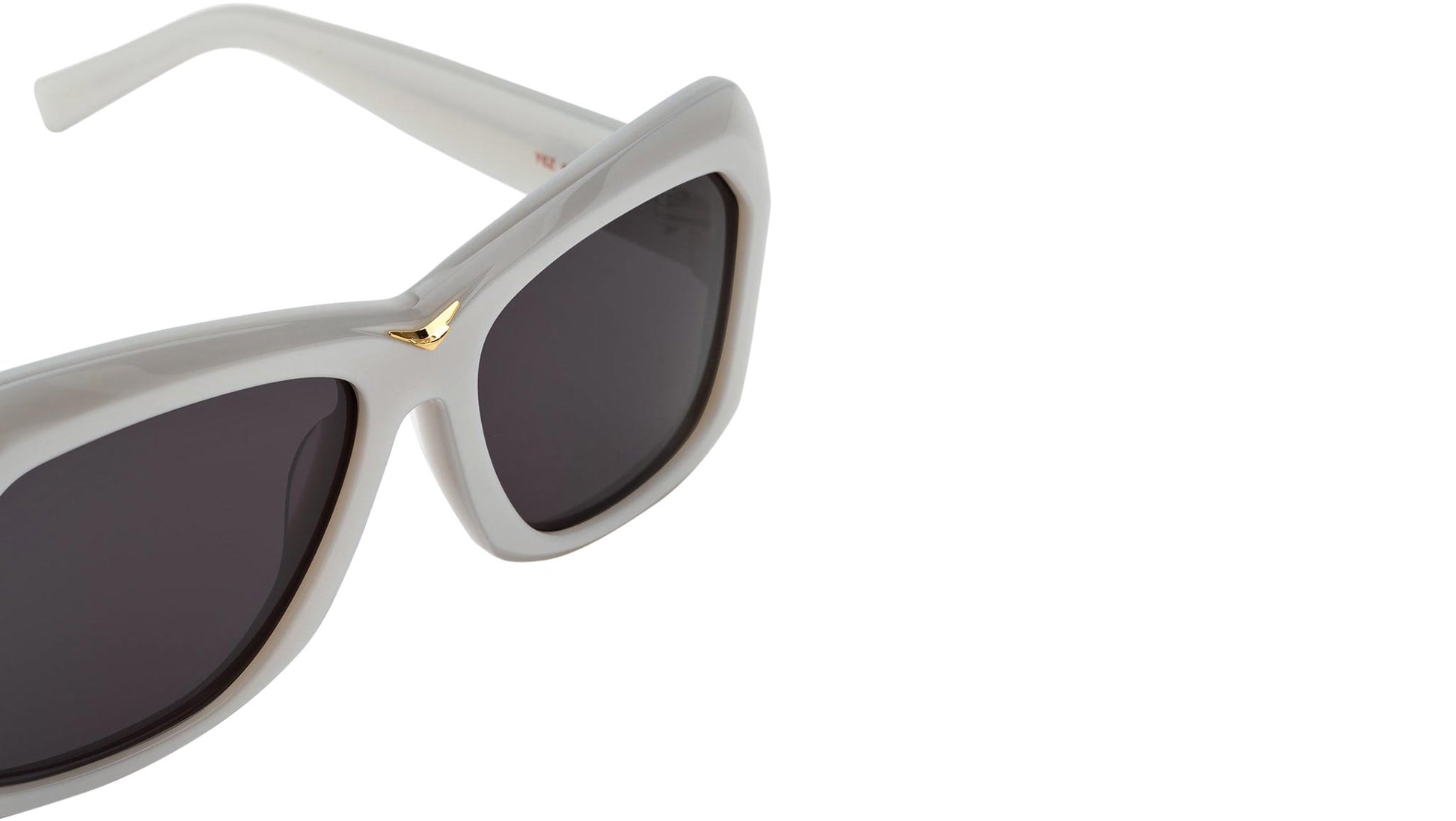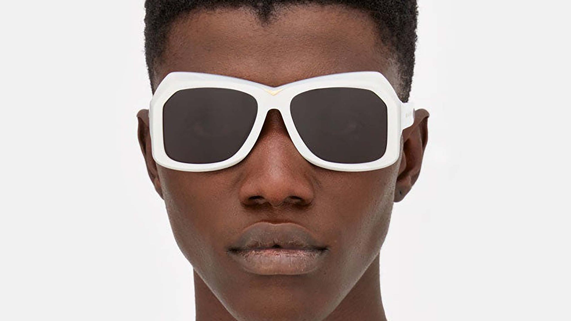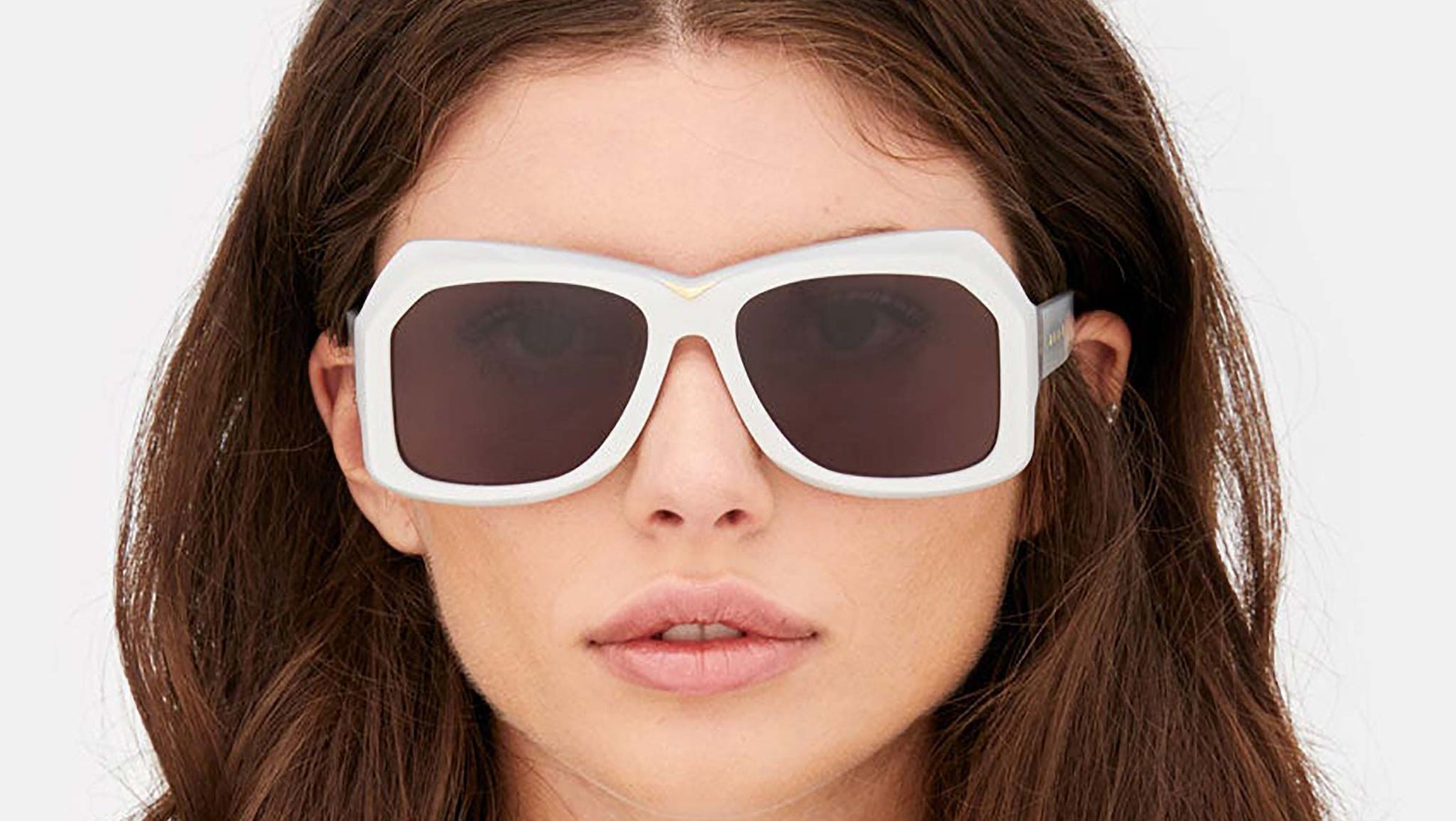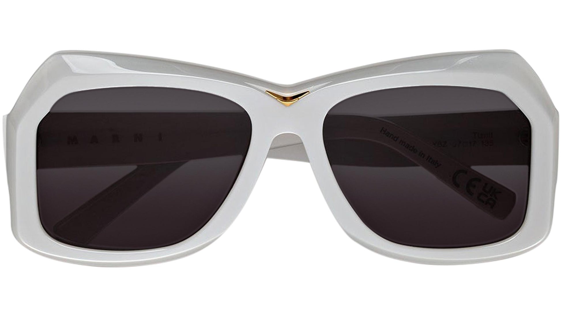 Designed exclusively for Marni, Tiznit is a statement silhouette characterized by its unique oversized design and lenses, with its sturdy acetate construction. The model can be seen as a crossover between different eras with distinctive traits and touches travelling from the 50s to the 80s, resulting in an eclectic genderless piece for tomorrow. Its unique layered geometry features chiselled rims and offbeat lenses. This model comes in a shiny metallic silver acetate with smokey lenses. Sizes: R / R Lens Width: 57 mm. Frame Front: Frame Side: 135 mm. Product Code Size R: Y6Z Product Code Size R: 03I