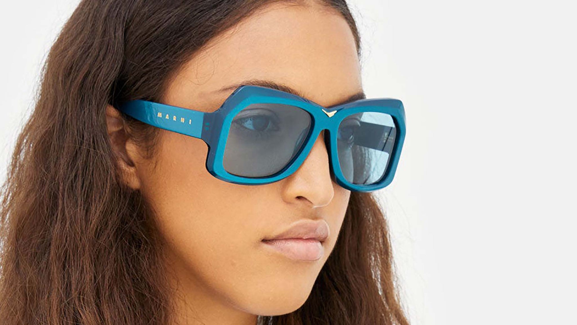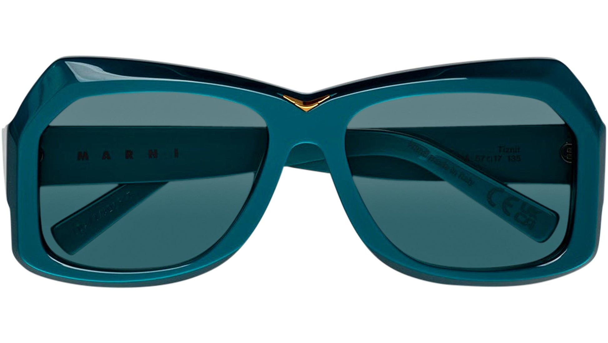 Designed exclusively for Marni, Tiznit is a statement silhouette characterized by its unique oversized design and lenses, with its sturdy acetate construction. The model can be seen as a crossover between different eras with distinctive traits and touches travelling from the 50s to the 80s, resulting in an eclectic genderless piece for tomorrow. Its unique layered geometry features chiselled rims and offbeat lenses. This model comes in a shiny metallic teal acetate with matching turquoise lenses. Sizes: R Lens Width: 57 mm. Frame Front: Frame Side: 135 mm. Product Code Size R: LDA