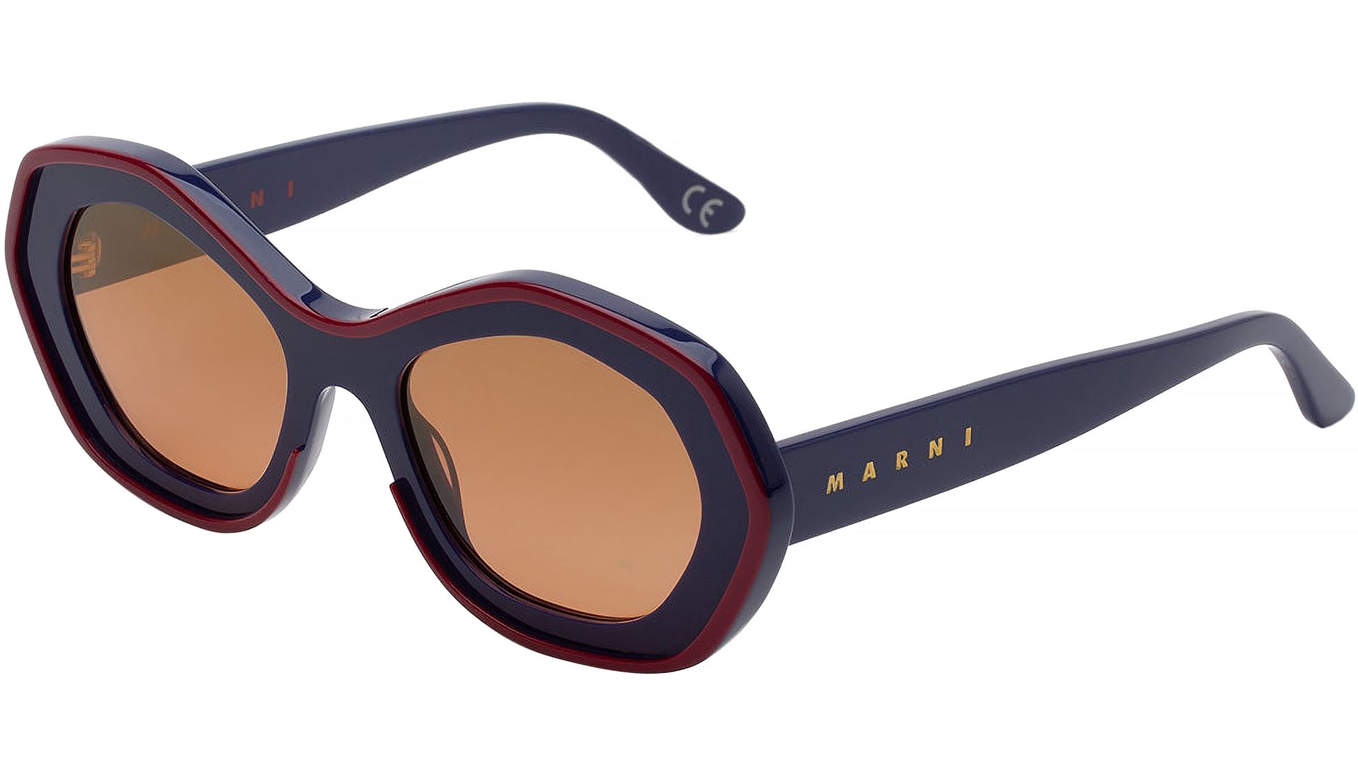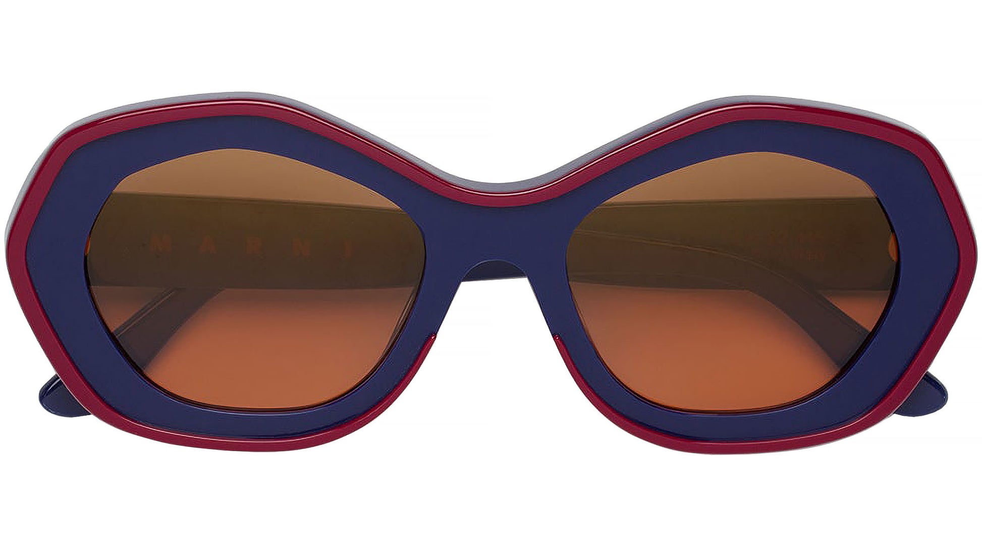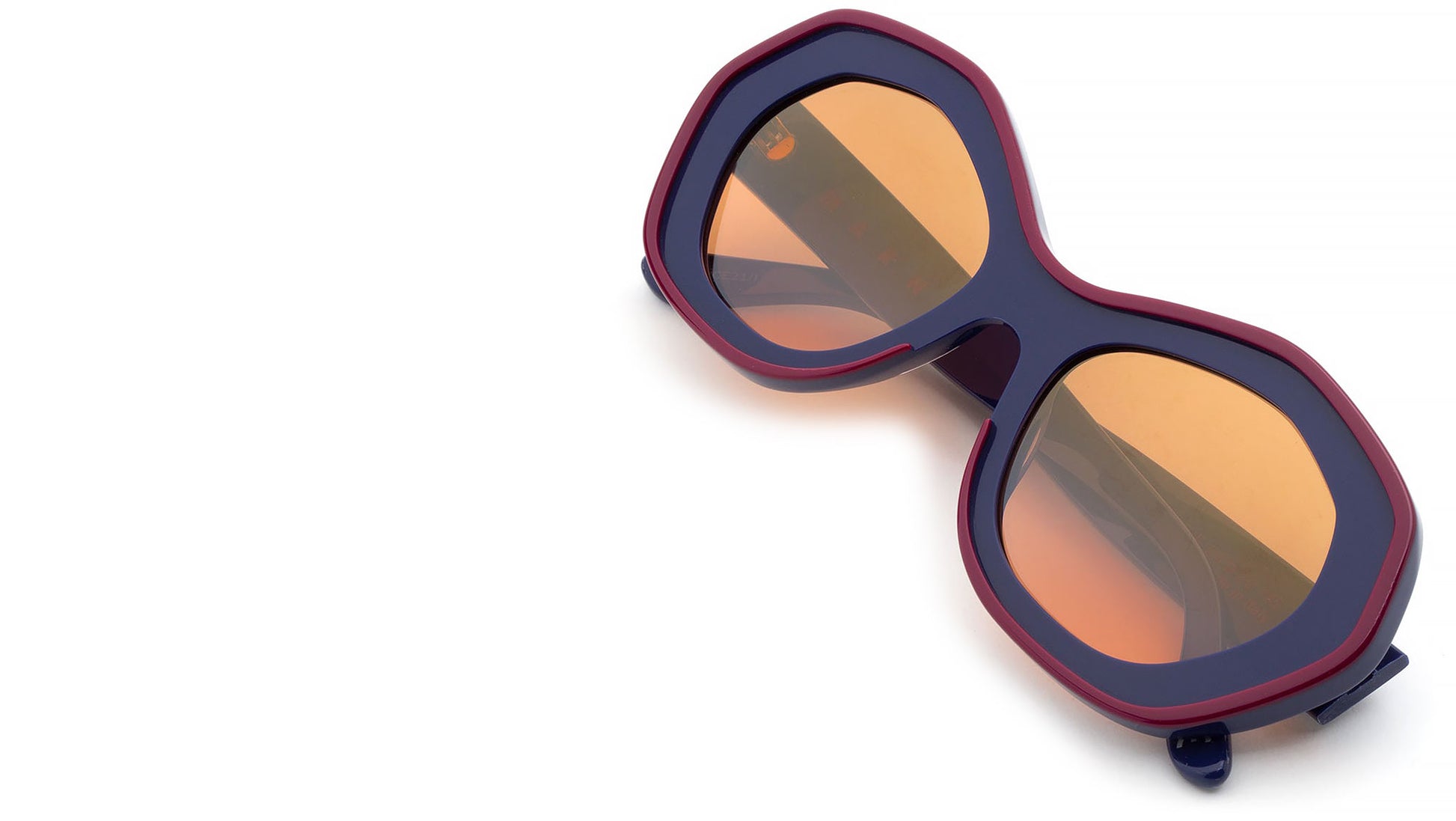Designed exclusively for Marni, Ulawun Vulcano is a quirky silhouette that matches the vintage aesthetics of oversized grandma shapes with bold grunge references. This oversized model features wide lenses encased within chunky rims that are rounded on the inside, with chiselled geometric lines on the outside of the frame. A lowered nose-bridge and sleek arms complete this model designed for those open to experimenting with style. This model comes in a rich combination of electric blue and burgundy acetates framing its bold orange tinted lenses. Sizes: R Lens Width: 54 mm. Frame Front: Frame Side: 145 mm. Product Code Size R: EIF