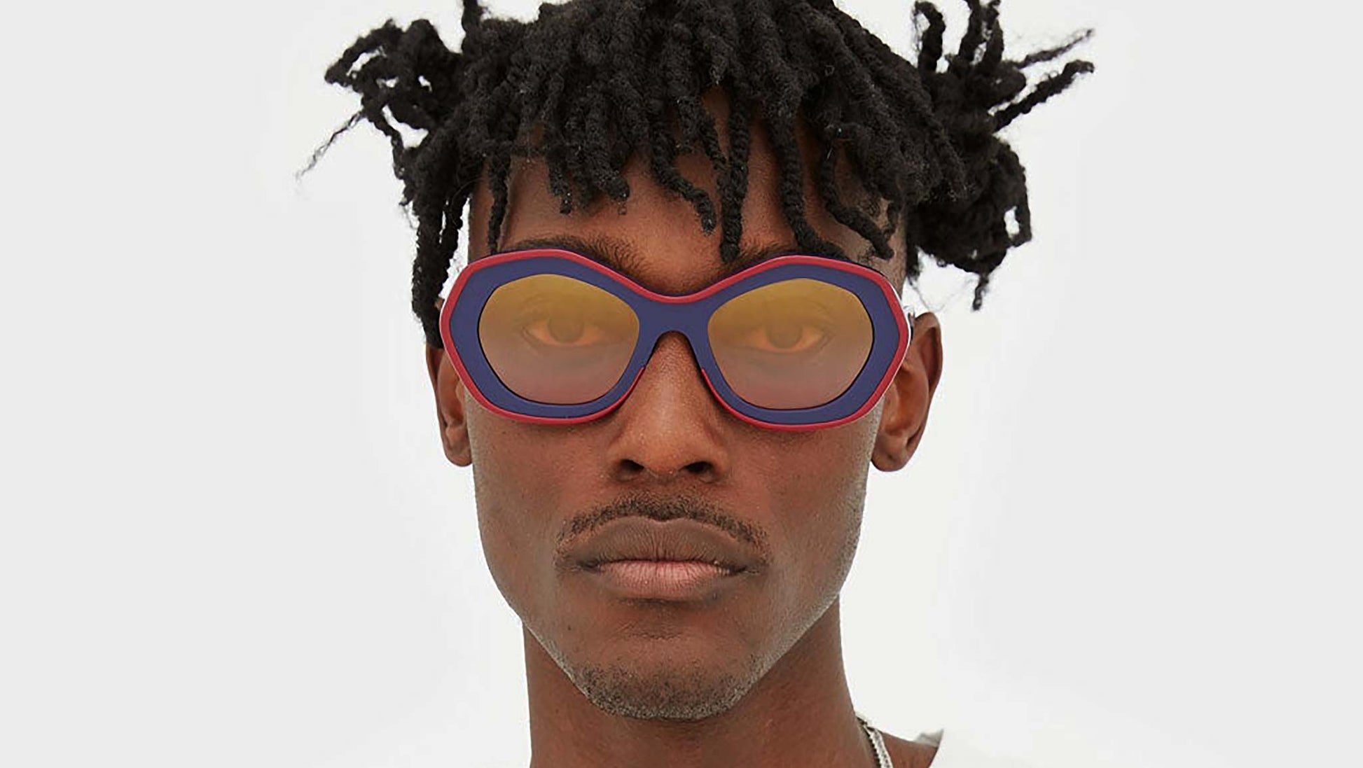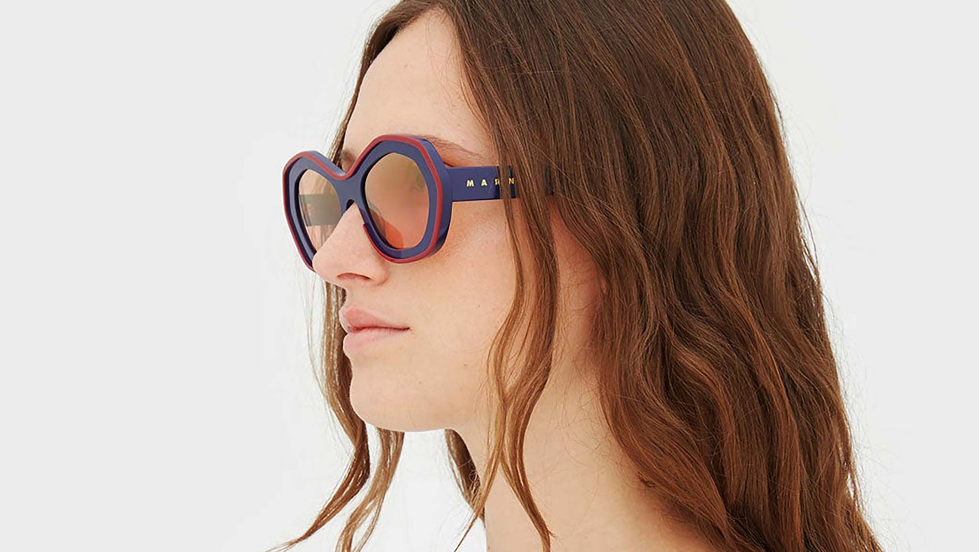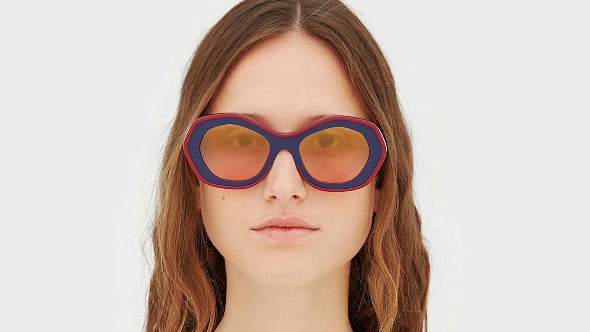 Designed exclusively for Marni, Ulawun Vulcano is a quirky silhouette that matches the vintage aesthetics of oversized grandma shapes with bold grunge references. This oversized model features wide lenses encased within chunky rims that are rounded on the inside, with chiselled geometric lines on the outside of the frame. A lowered nose-bridge and sleek arms complete this model designed for those open to experimenting with style. This model comes in a rich combination of electric blue and burgundy acetates framing its bold orange tinted lenses. Sizes: R Lens Width: 54 mm. Frame Front: Frame Side: 145 mm. Product Code Size R: EIF