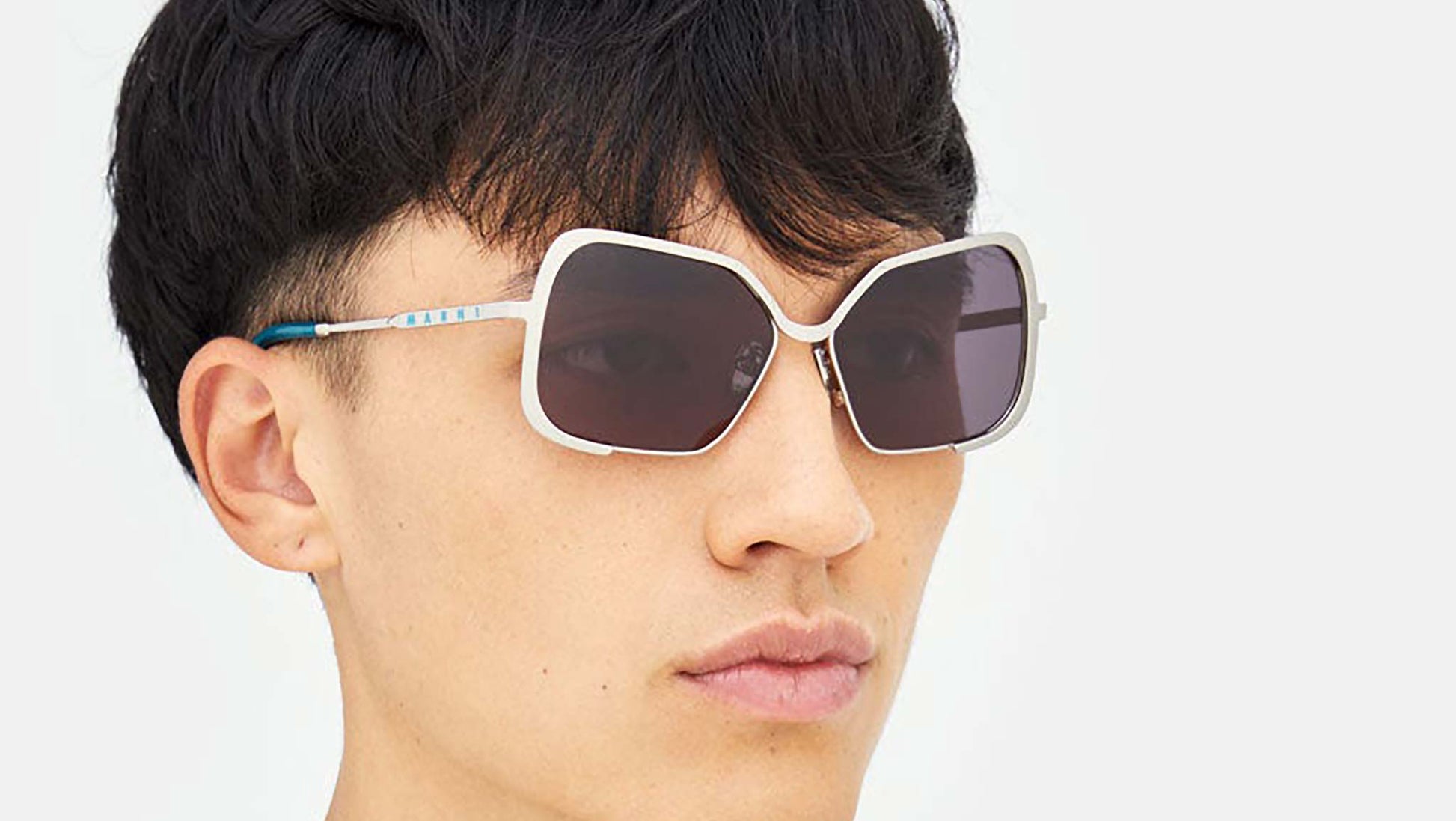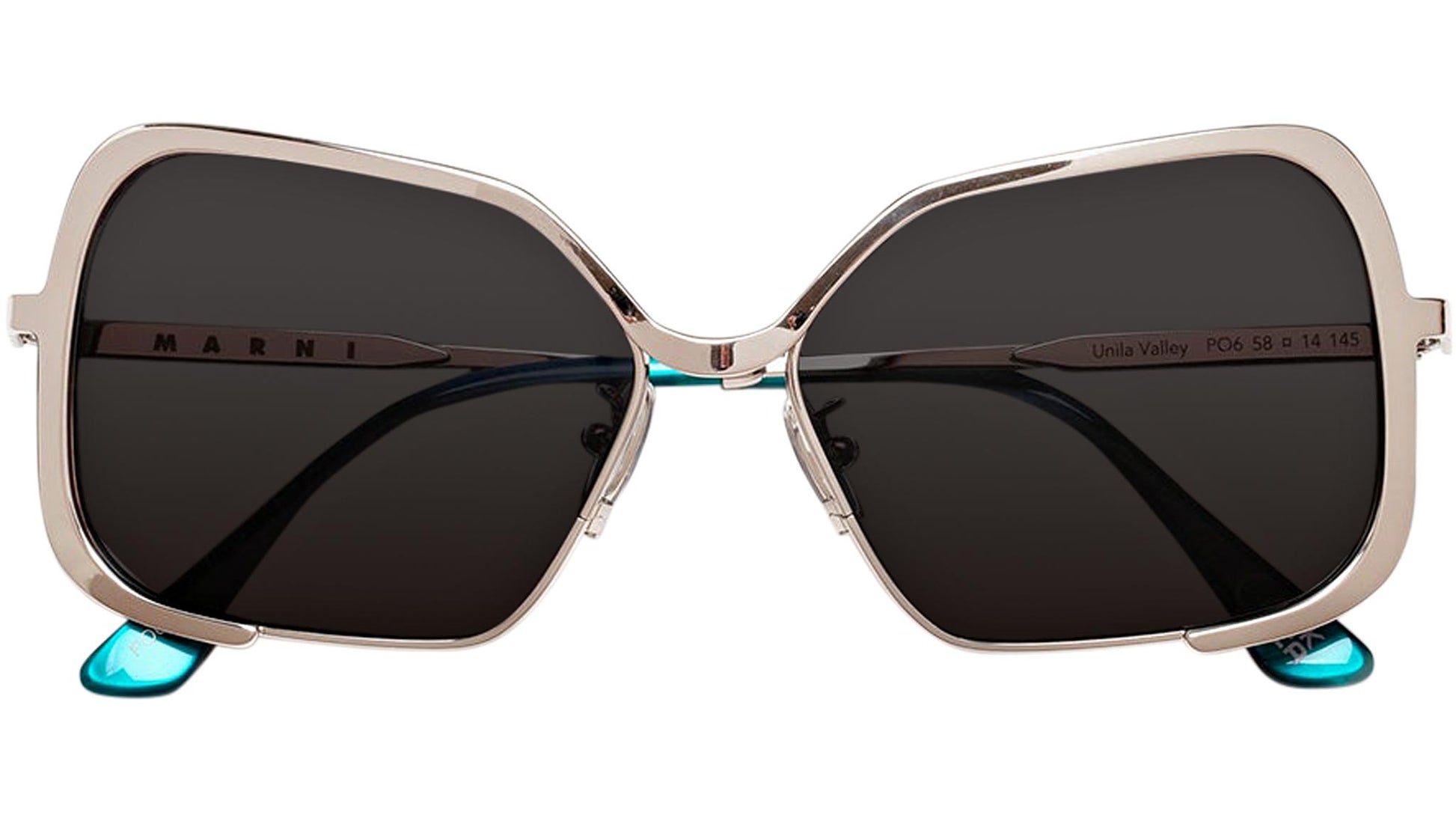 Designed exclusively for Marni, Unila is a unique oversized full-metal silhouette characterized by a single custom-moulded metal rod which carefully embraces the wide geometric lenses. The sturdy metal piece extends over the tow lenses and forms a soft U shaped nose bridge. With flexible metal temples, this is a sophisticated yet bold piece of design. This version of Unila features a silver metal finish, black lenses and is topped off with playful teal acetate temple tips. Sizes: R Lens Width: 58 mm. Frame Front: Frame Side: 135 mm. Product Code Size R: PO6