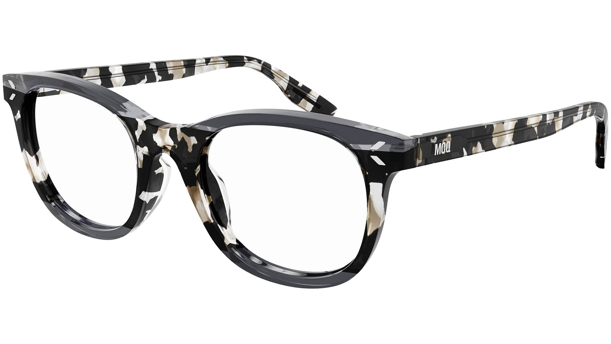 McQ Collection 0 optical model MQ0328O 004 featuring shiny transparent grey / havana / transparent grey frame and havana temple. McQ design is a play on everyday styles. The innovative cut lenses are applied into edgy shapes for a unique look. This style is the preferred choice for making a statement.