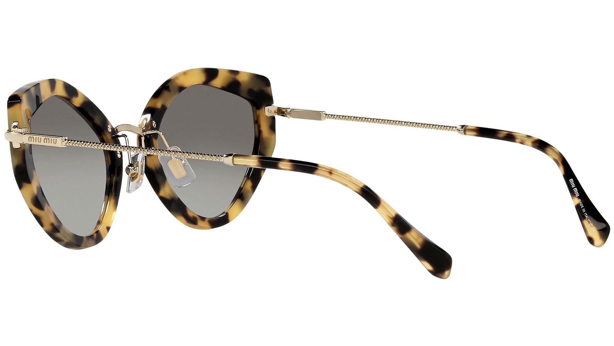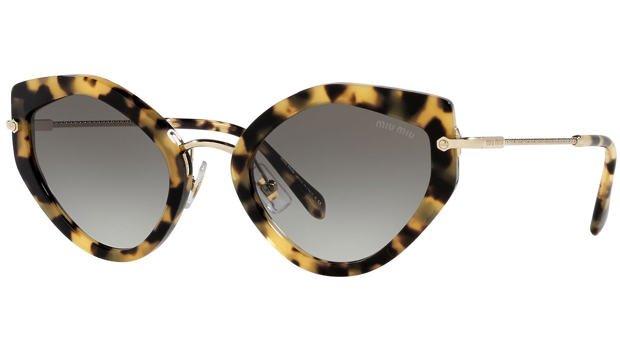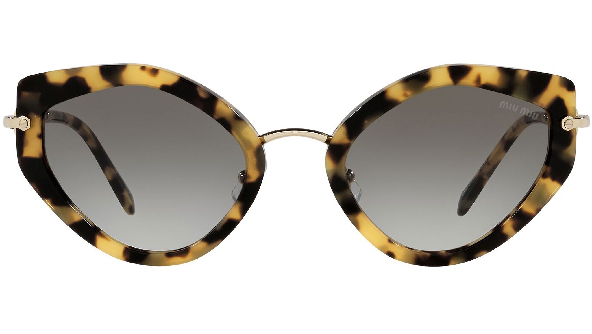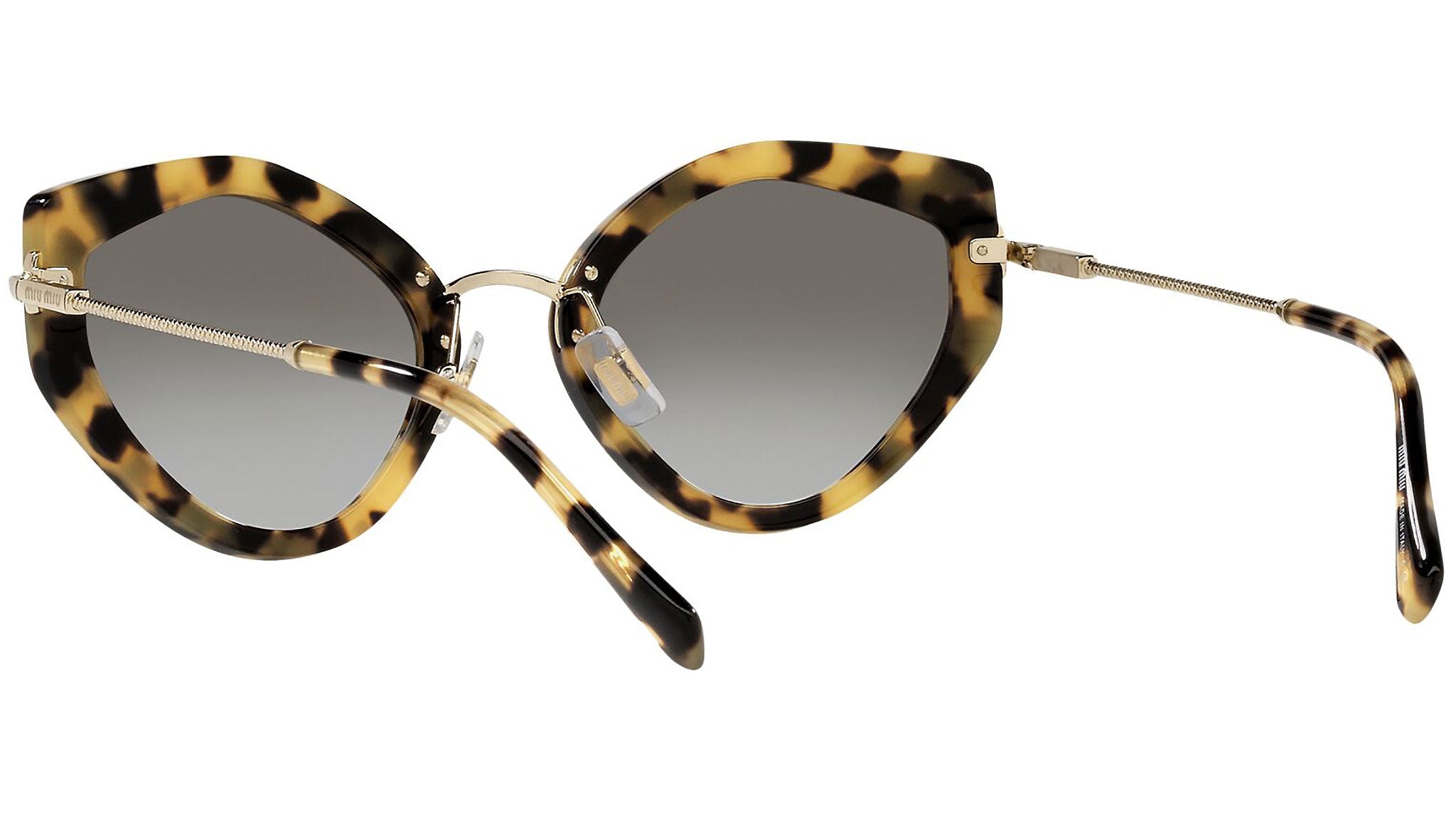 Miu Miu sunglasses model MU 08XS light havana frame variant, color code 7S00A7 with grey gradient lens. The sunglasses from Miu Miu eyewear collection are unique creations, the result of the constant stylistic research and skillful craftsmanship of the brand. A unique blend of playful experimentation and rich detailing that perfectly embodies the stylistic codes that have always characterized the House, confirming once again Miu Miu’s undisputed talent in combining unconventional designs with retro-inspired romanticism.
