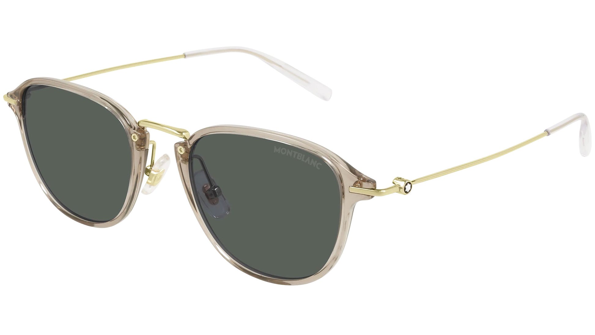 Montblanc Established MB0155S 003 sunglasses with shiny transparent light sand and shiny light gold frame and solid grey lens. Montblanc revolutionized the culture of writing with breakthrough innovations. Today, the Maison continues to push boundaries and evolve the expression of fine craftsmanship across each of its product categories: the pinnacle of luxury writing instruments, timepieces, leather goods, accessories, fragrances and eyewear.