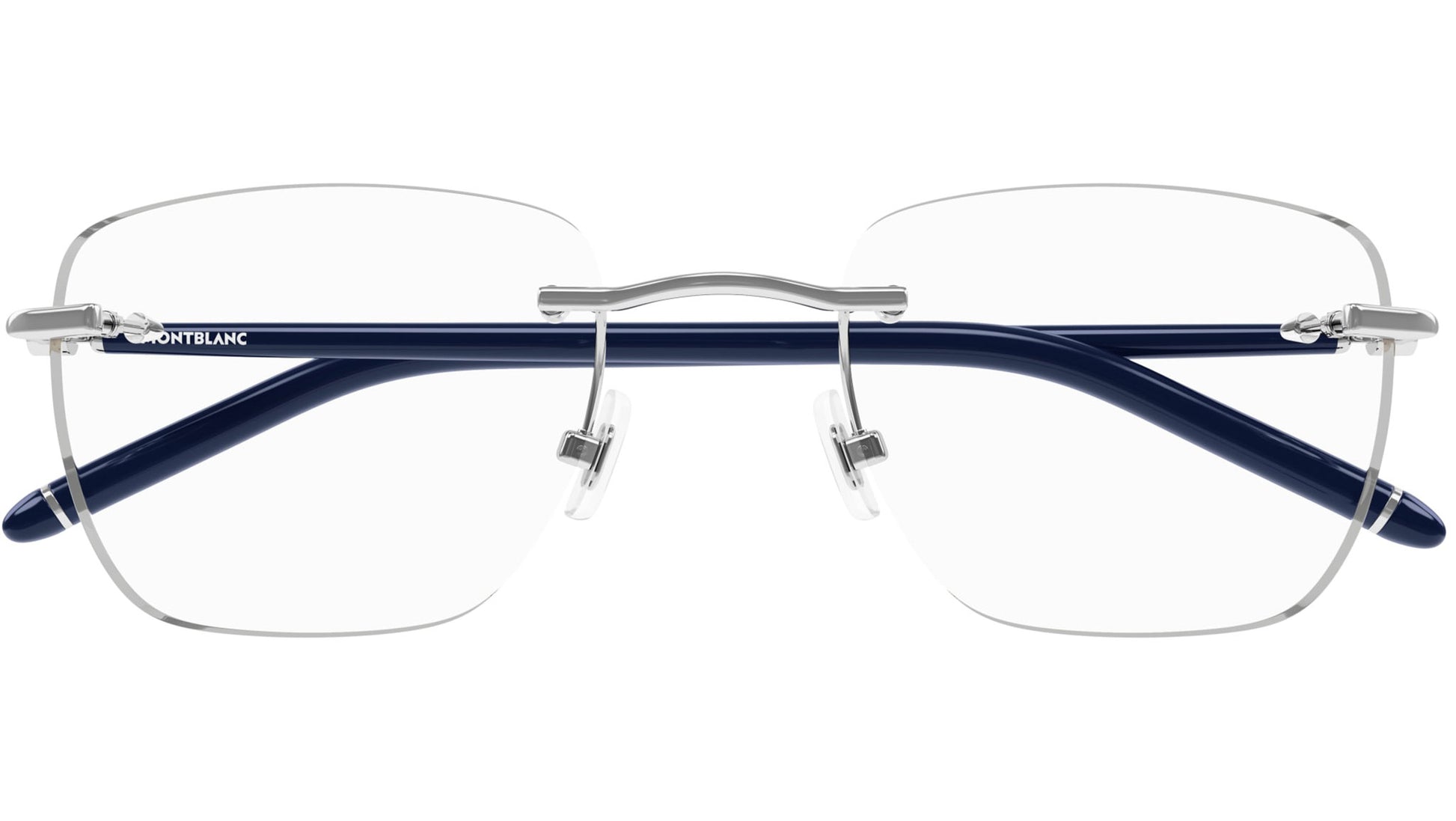 Montblanc Established optical collection model MB0274O color code 003 featuring shiny silver frame and blue temple.