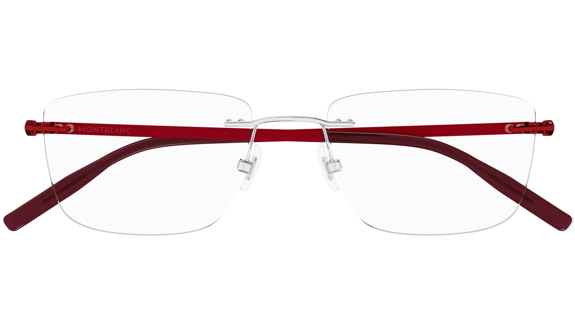 Montblanc Established optical collection model MB0281O featuring shiny silver frame and red temple.
