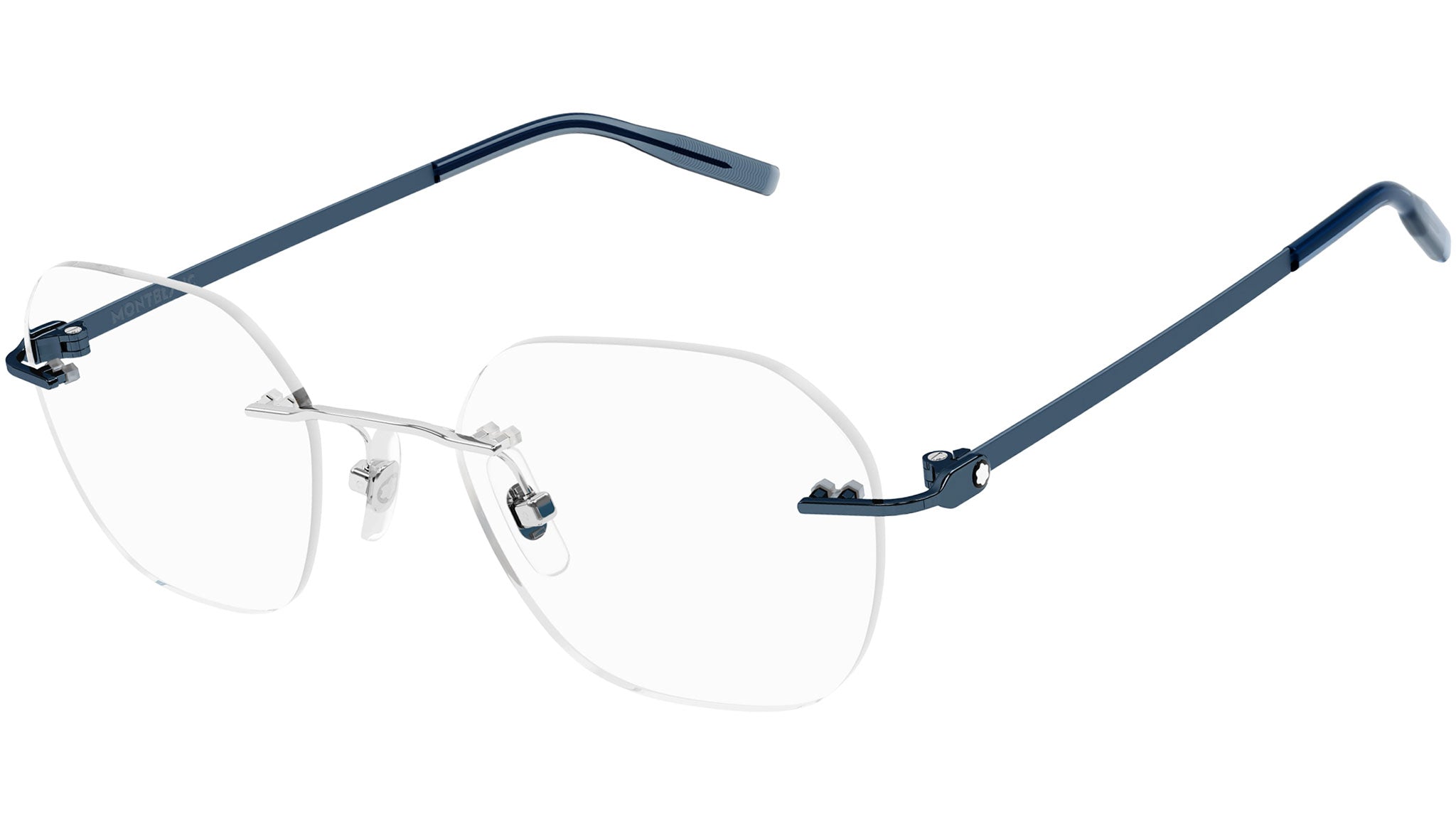 Montblanc Established optical collection model MB0282O color code 007 featuring shiny silver frame and blue temple.