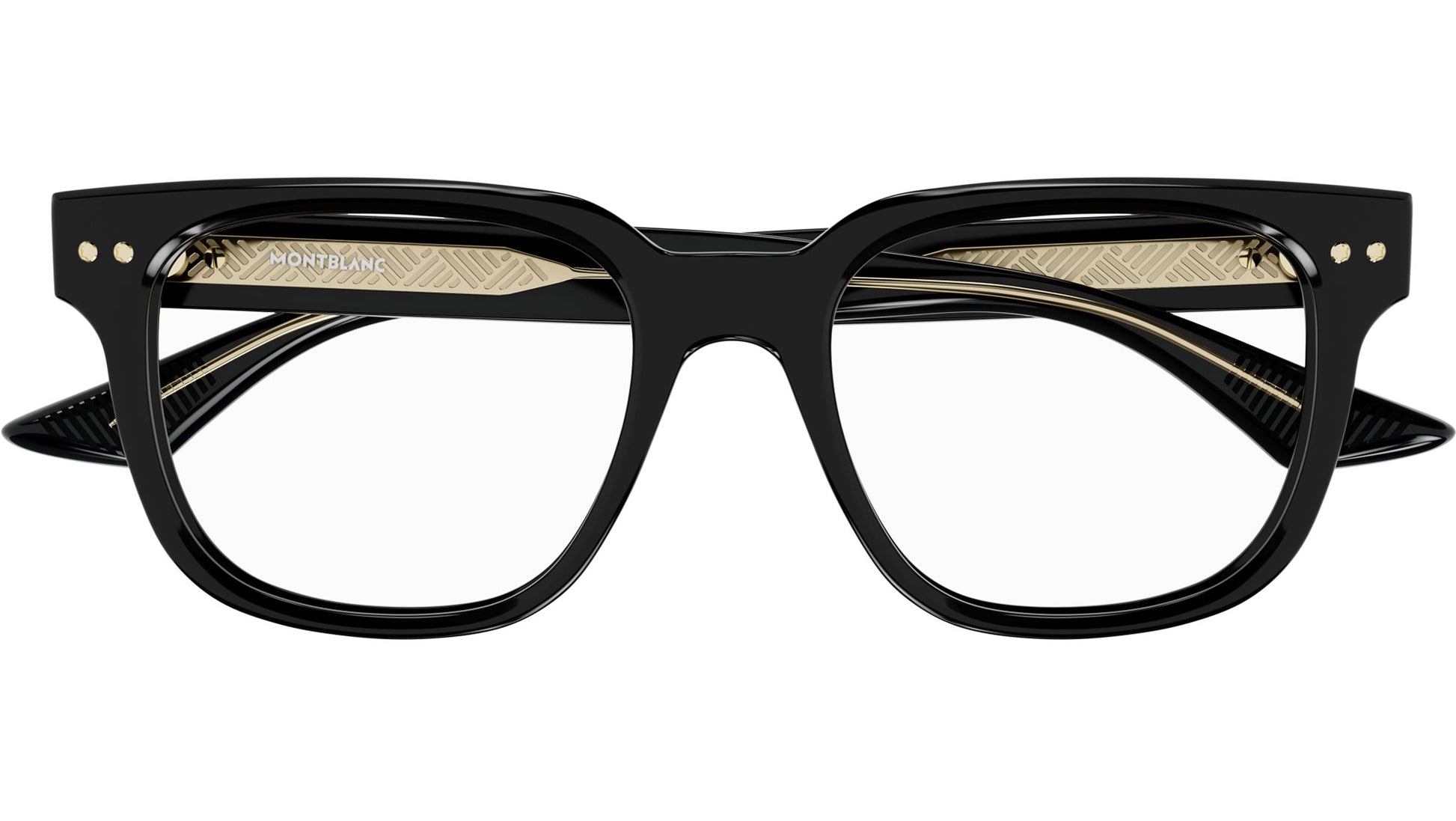 Montblanc eyewear model MB0321O Snowcap line rectangle recycled acetate glasses, color code 001 shiny solid black with black temple and demo lens.