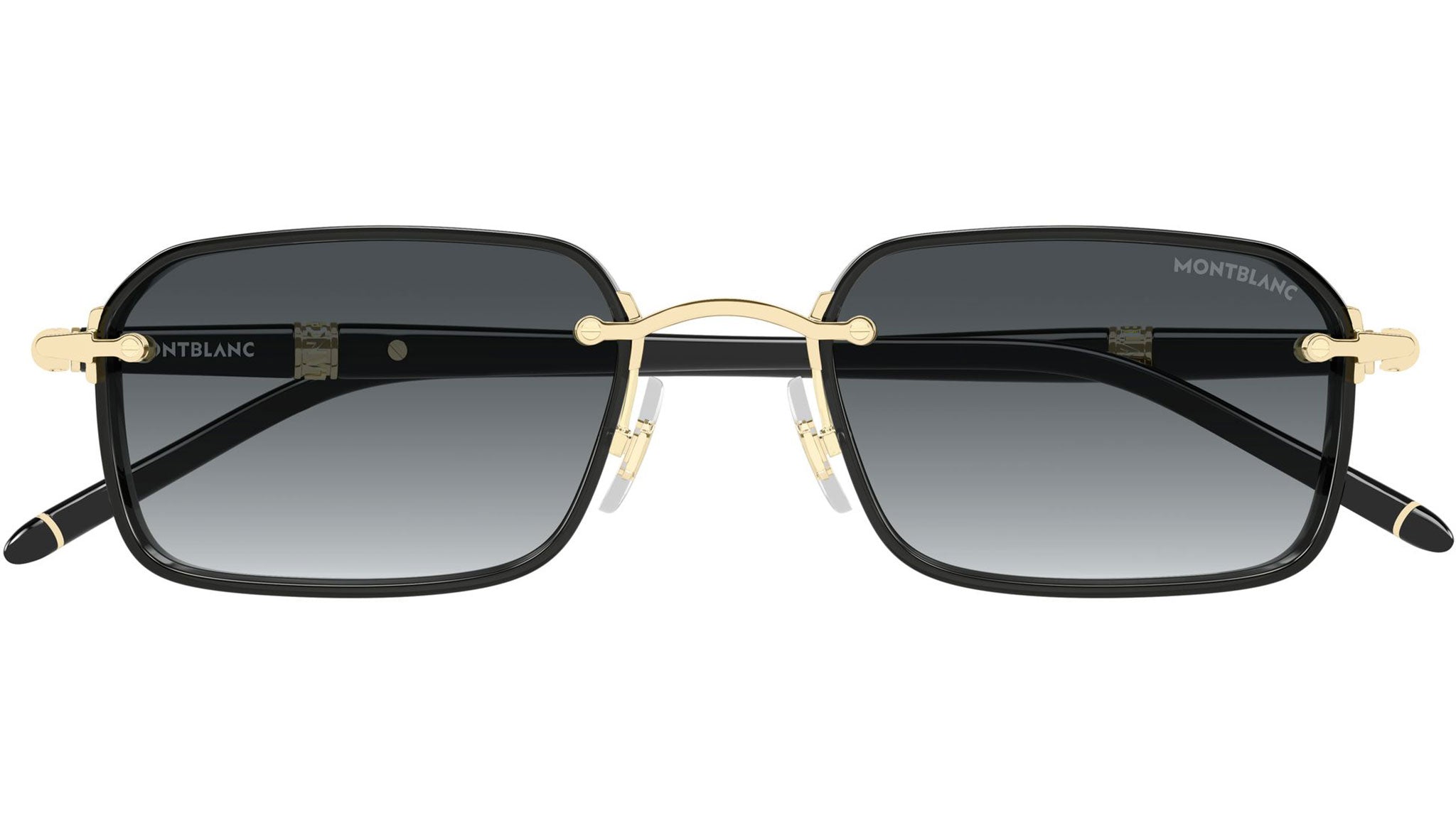 Montblanc MB0483S 001 sunglasses for men, featuring shiny light gold / shiny black eyerim rectangular metal frame and gradient grey bio nylon lenses. Brand line: Meisterstück. Style code: MB0483S. Color code: 001. Made in Japan. Authorized Montblanc online reseller. Your glasses will include the original case and accessories and are covered by a 12-month global warranty.