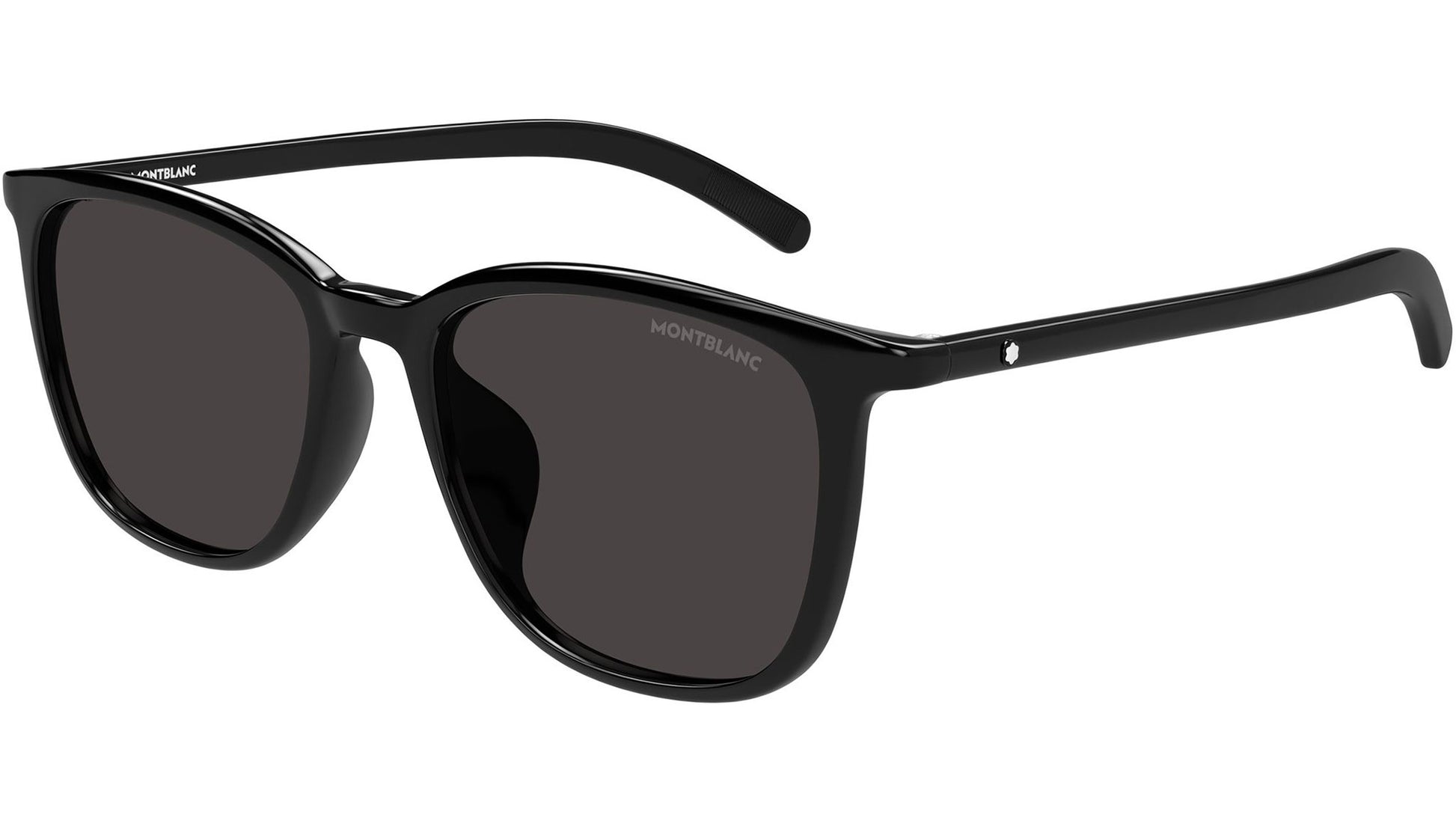 Montblanc MB0487SA 001 sunglasses for men, featuring shiny black rectangular recycled injected acetate frame and solid grey bio nylon lenses. Brand line: CN Capsule. Style code: MB0487SA. Color code: 001. Made in Italy. Authorized Montblanc online reseller. Your glasses will include the original case and accessories and are covered by a 12-month global warranty.