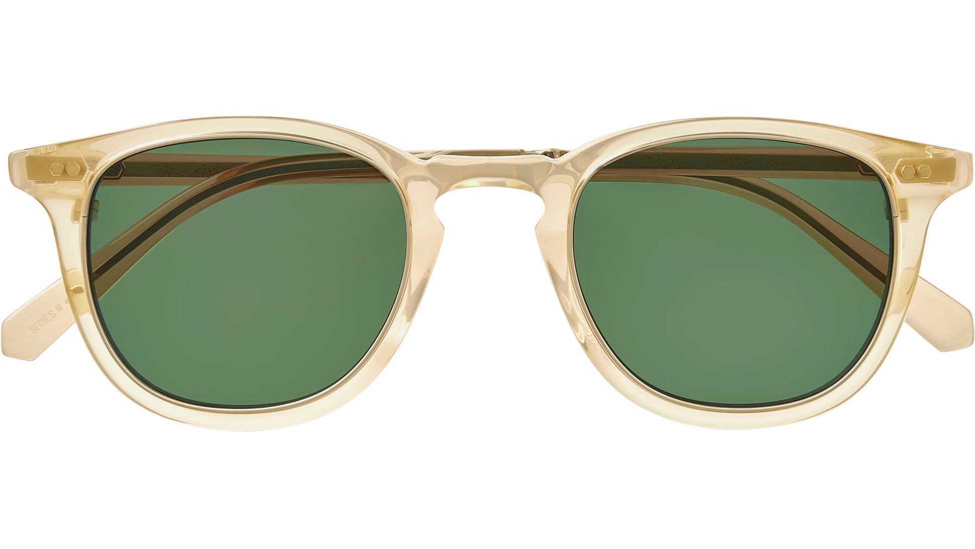 Mr. Leight Coopers S sunglasses featuring summit / white gold squared acetate-metal frame and forest lenses. Introducing a collection of refined sunglasses featuring a classic square shape, meticulously handcrafted in Japan using premium acetates and precious metals. These sunglasses are equipped with optical quality Polar CR-39 lenses that provide superior clarity and 100% UV protection. The custom titanium woven engraved metal core wire enhances durability, while the 4 base lens includes a backside anti-reflective coating for added comfort during wear. A distinctive keyhole bridge and a custom engraved 3-barrel hinge with an enamel-filled logo cap further enhance the design, offering a unisex aesthetic suitable for all. Style code: ML2011. Color code: SMT-WG/F. Authorized Mr. Leight online reseller. Your glasses will include the original case and accessories and are covered by a 12-month global warranty.