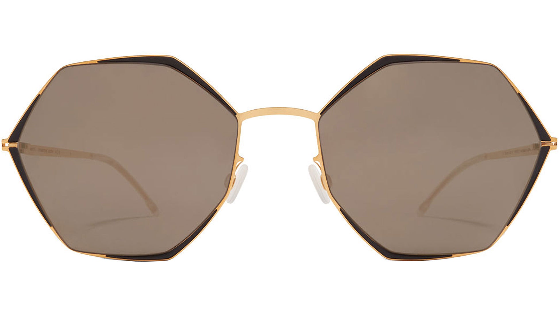 Made of lightweight stainless steel, ALESSIA in Gold/Jet Black with Brilliant Grey Solid lenses is a square shaped sunglass frame from the MYKITA DECADES collection with a geometric rim design. Handcrafted in Berlin.