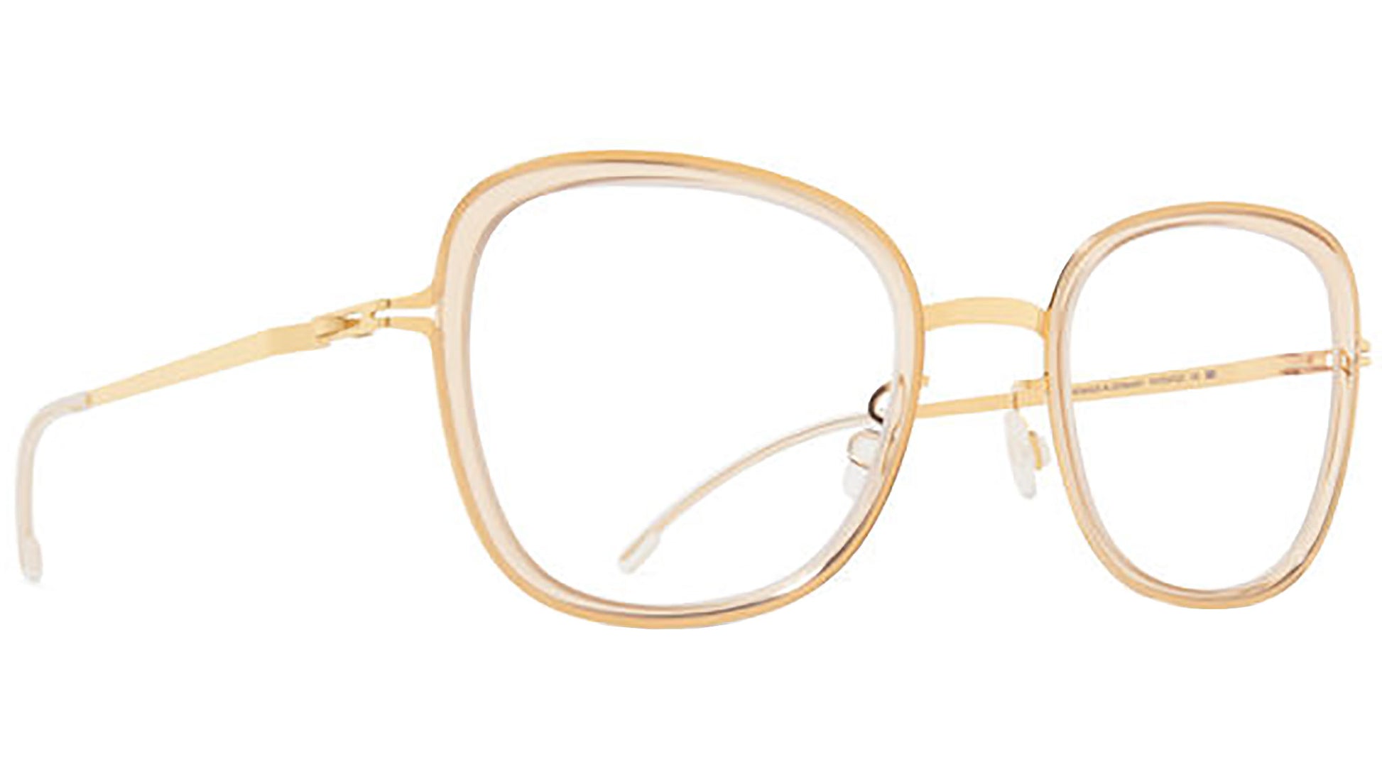 Mykita ALIN A98 glasses for women, featuring glossy gold / desert haze butterfly stainless steel frame and demo lenses. Responsibly designed and meticulously handcrafted in Berlin, this optical frame from the LITE collection exemplifies minimalist elegance and exceptional comfort. Constructed from circular stainless steel with acetate rings seamlessly fitted inside the steel rims, the frame reflects a refined approach to sustainable craftsmanship. The patented spiral hinge enhances flexibility and durability, while acetate temple ends ensure a tailored fit with individually adjustable components. Each frame is presented with a branded eyewear case and cleaning cloth. Brand line: LITE. Style code: 10089063. Color code: A98. Made in Germany. Authorized Mykita online reseller. Your glasses will include the original case and accessories and are covered by a 12-month global warranty.