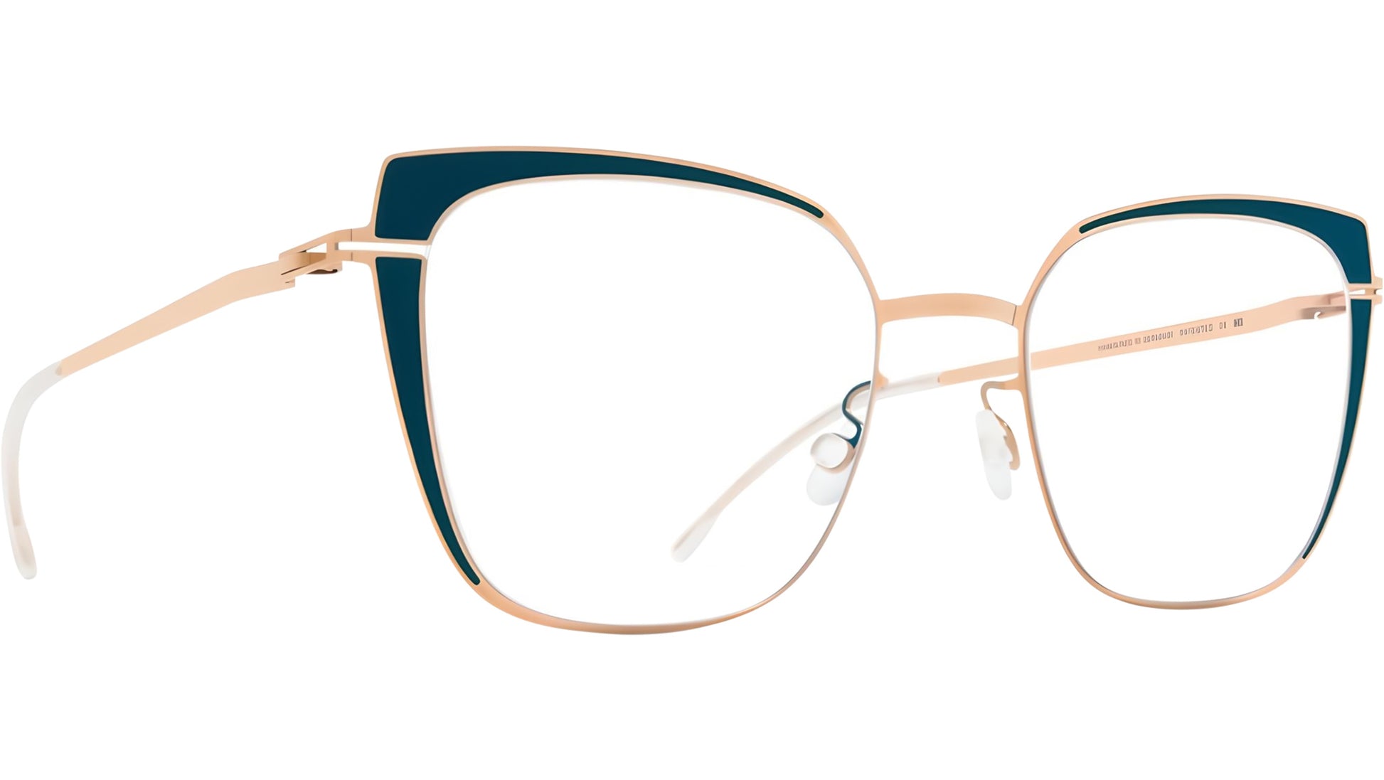 Mykita VIOLA 600 glasses for women, featuring champagne gold / lagoon green butterfly metal frame and demo lenses. The DECADES collection is inspired by the iconic eyewear styles of the thirties, sixties and the bold oversized shapes of the seventies and eighties, reinterpreted for today. The collection's unmistakable aesthetic comes from the fusion of timeless forms with modern MYKITA construction.. Brand line: DECADES. Style code: 10077289. Color code: 600. Made in Germany. Authorized Mykita online reseller. Your glasses will include the original case and accessories and are covered by a 12-month global warranty.