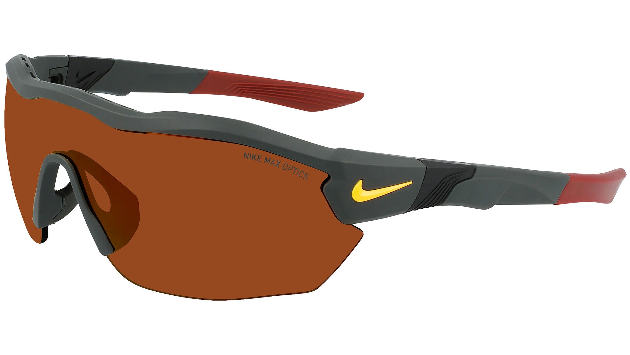 Nike Show X3 Elite M line sunglasses model DJ2027-355 featuring matte solid sequoia frame and grey fade orange lens.