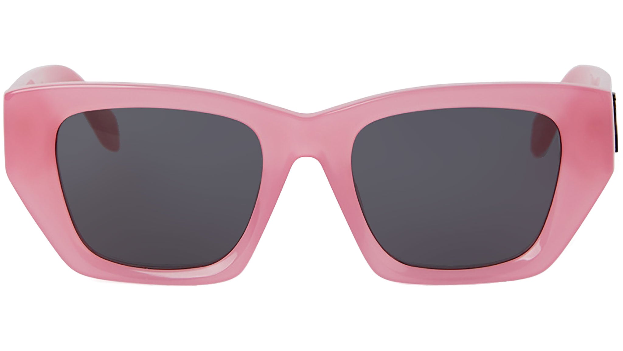 Palm Angels reimagines a timeless frame with the Hinkley sunglasses, featuring an oversized geometric silhouette with a rectangular shape and slightly extended sides. Crafted from classically treated acetate, the Hinkley exudes an enduring charm. Its thick temples are highlighted with the embedded Palm logo, adding an iconic touch. The color palette offers traditional black and havana shades, complemented by a striking white and a fresh introduction, the begonia pink.