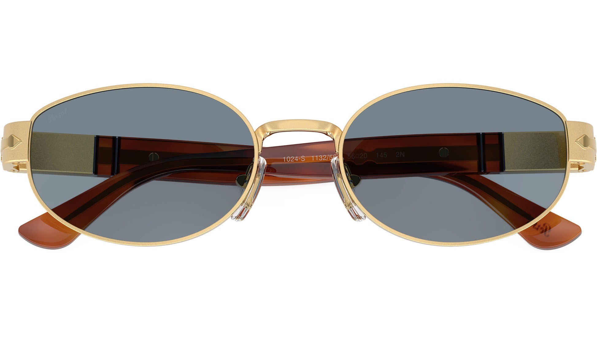 Persol sunglasses for men and woman model PO1024S 113256 featuring gold metal frame and light blue base 4.25 glass lenses. Adjustable nosepads. Frame line: Persol Lab. Brand code: 0PO1024S. Color code: 113256. Authorised Persol Eyewear Online Reseller. Your glasses will come including the original case and accessories and will be covered by 12 month global warranty.