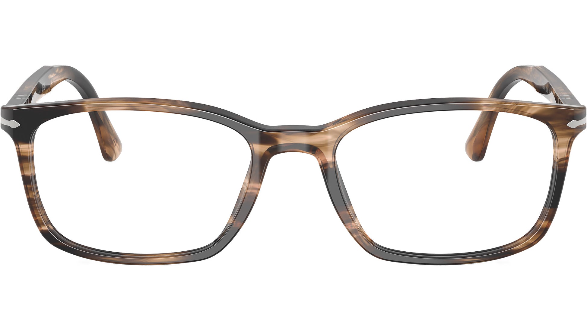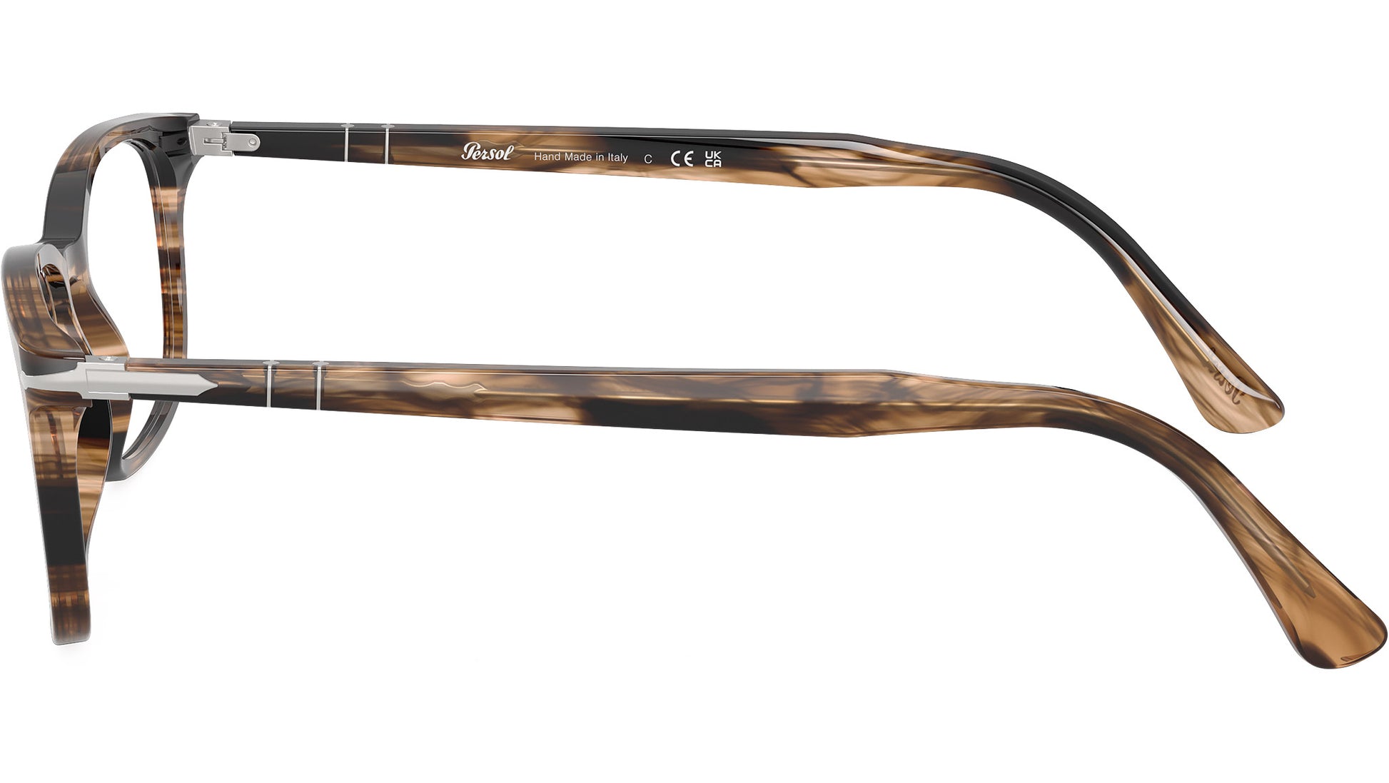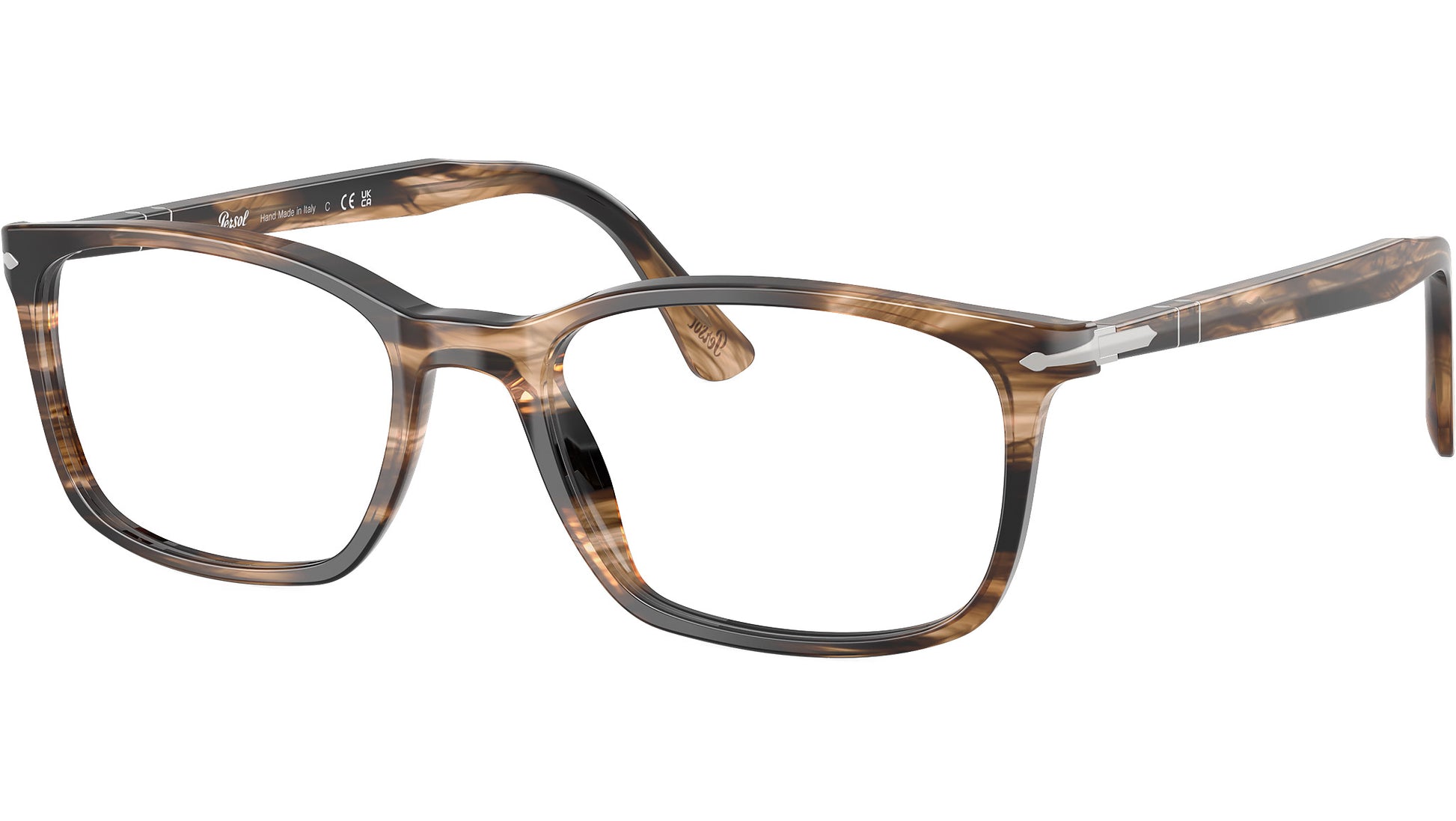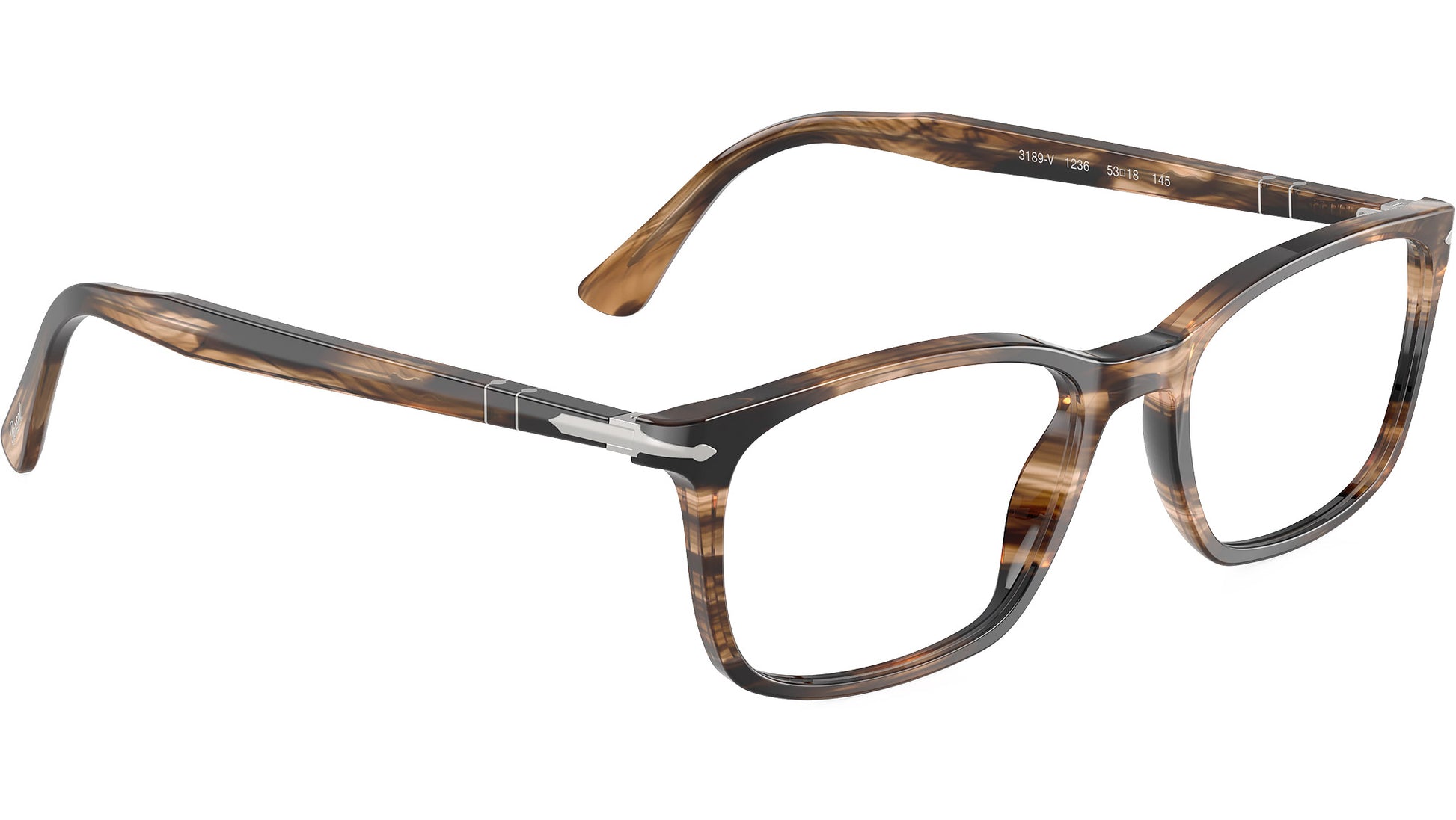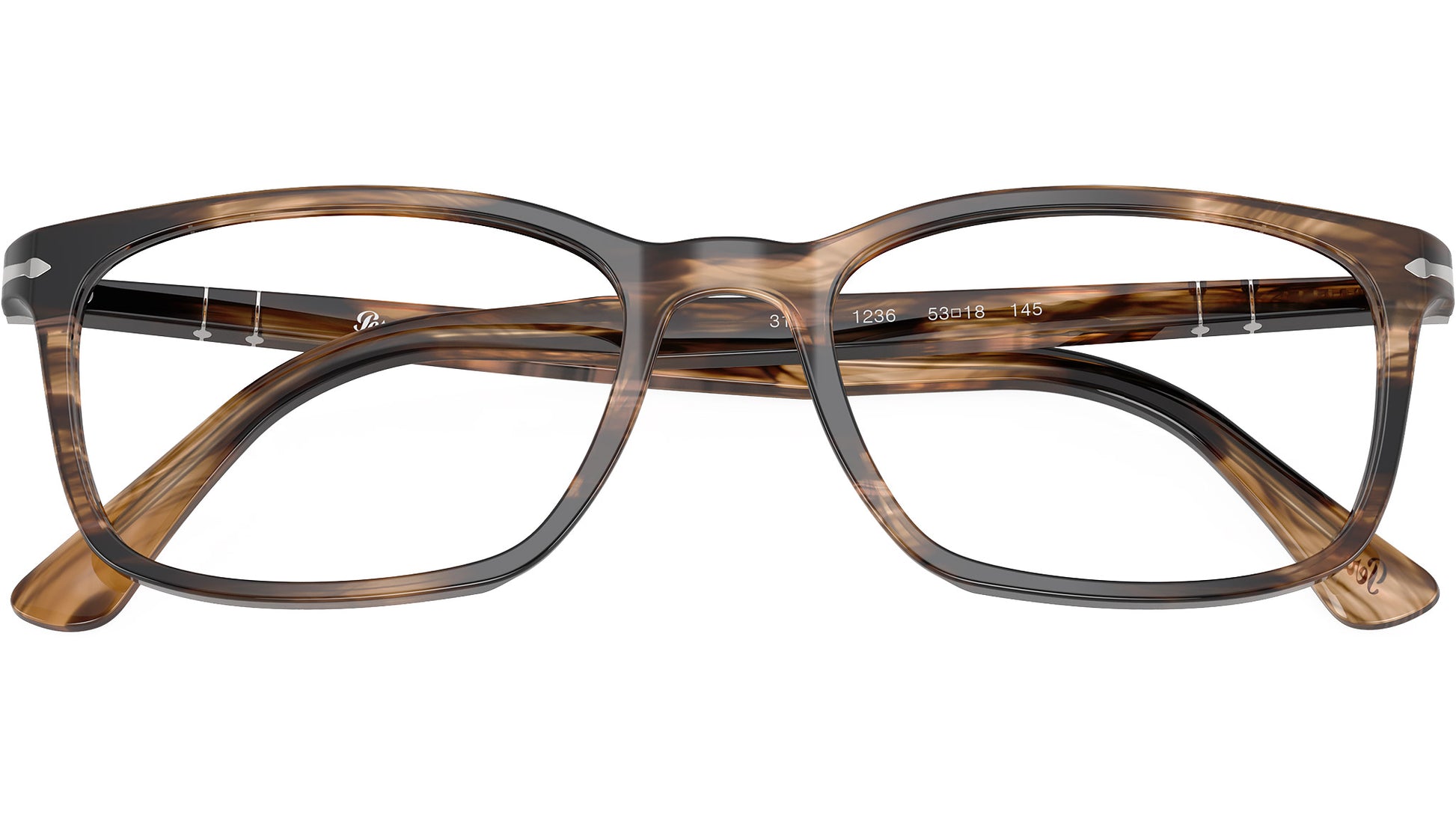 Persol glasses for men model PO3189V 1236 featuring striped black & greish brown acetate frame and demo lenses. High bridge fit. Frame line: Officina. Brand code: 0PO3189V. Color code: 1236. Authorised Persol Eyewear Online Reseller. Your glasses will come including the original case and accessories and will be covered by 12 month global warranty.