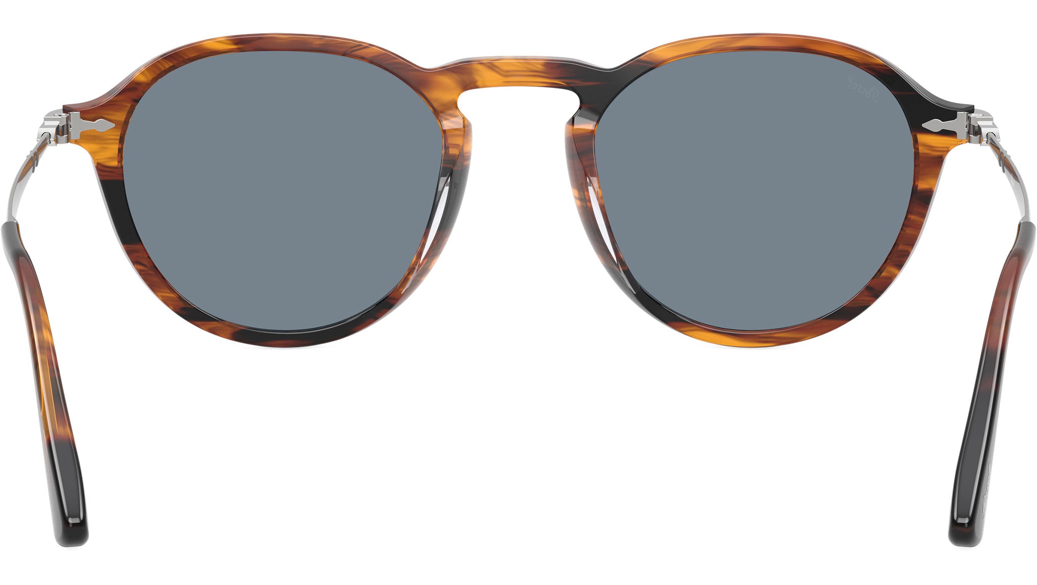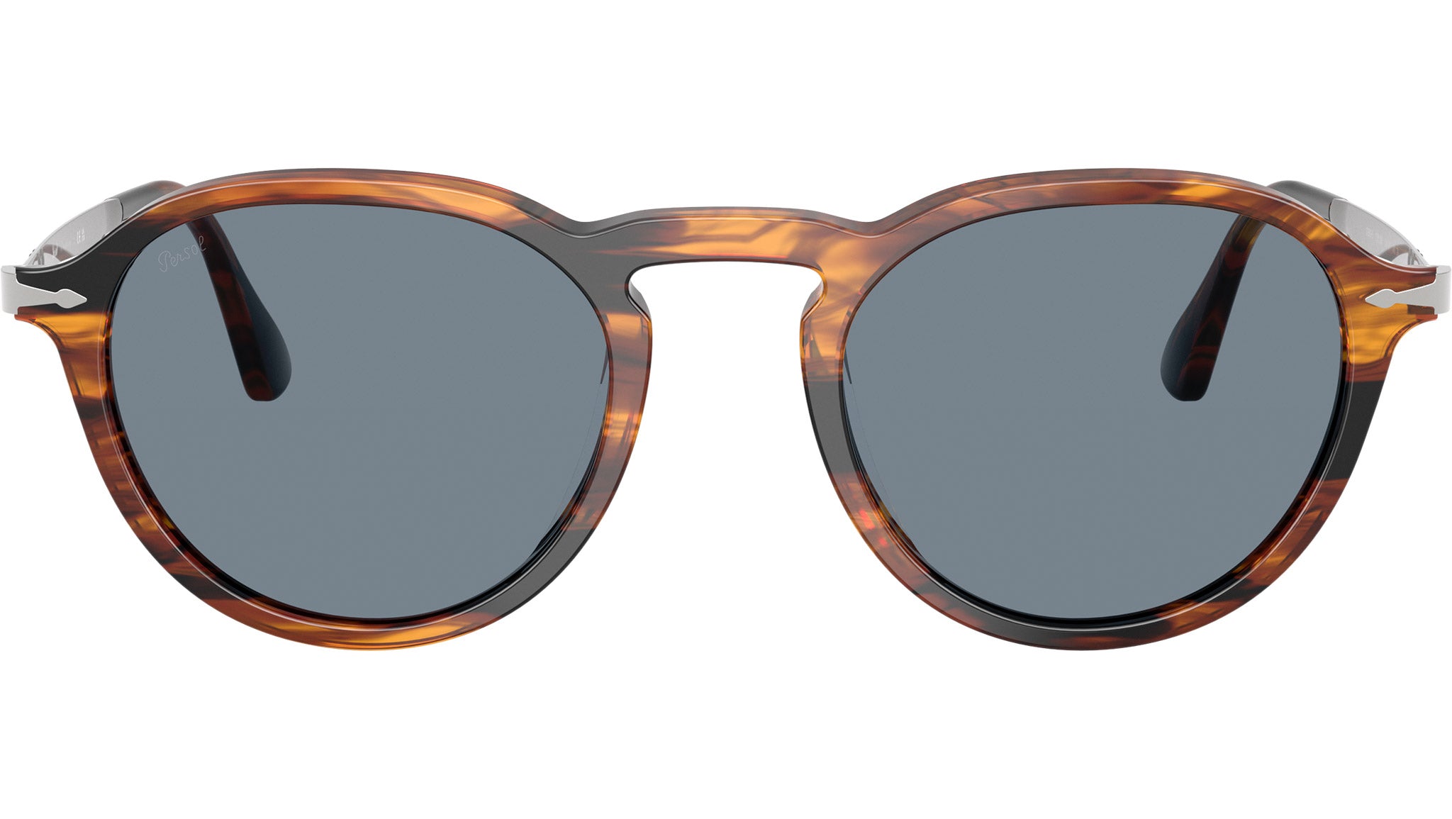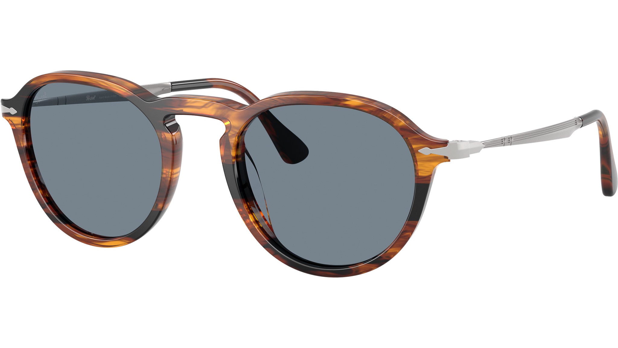 Persol sunglasses for men and woman model PO3383S 123556 featuring striped black & brown acetate frame and light blue base 4.25 glass lenses. High bridge fit. Frame line: Galleria. Brand code: 0PO3383S. Color code: 123556. Authorised Persol Eyewear Online Reseller. Your glasses will come including the original case and accessories and will be covered by 12 month global warranty.