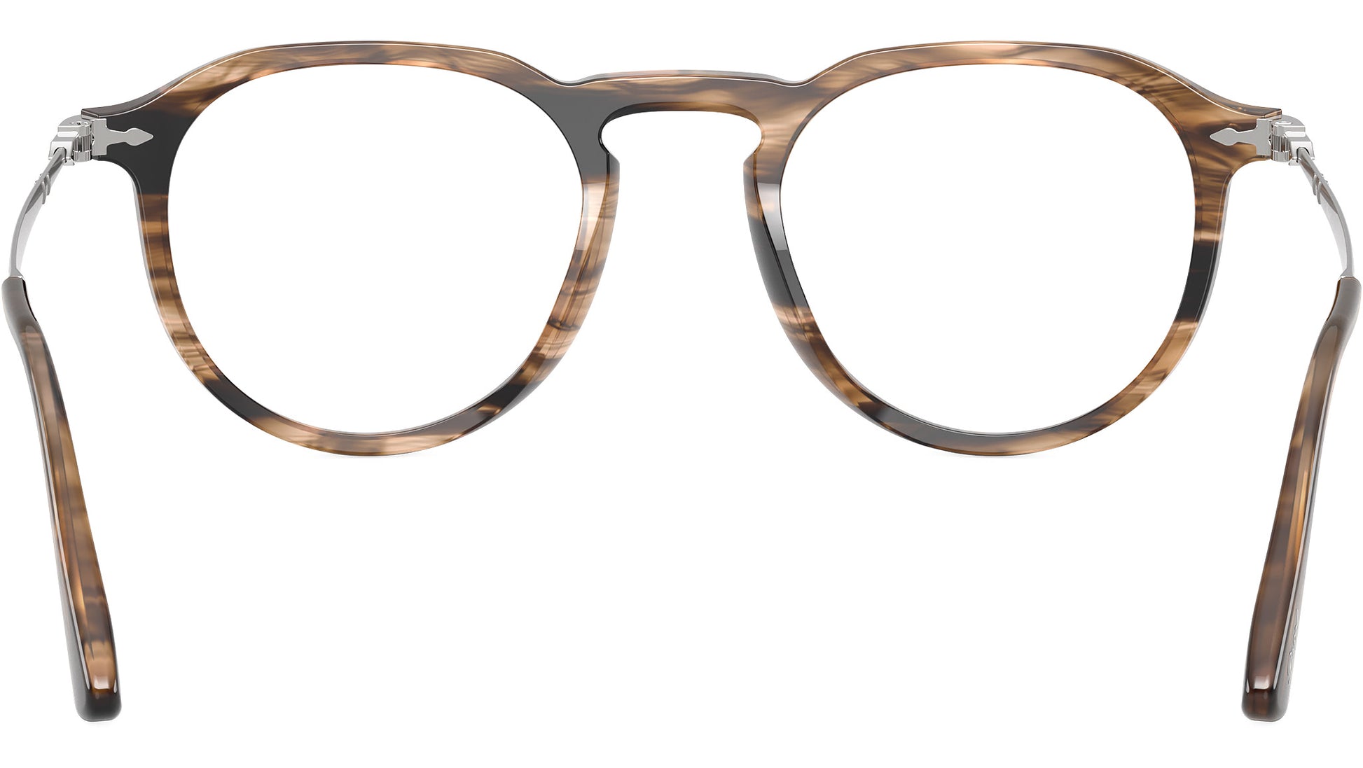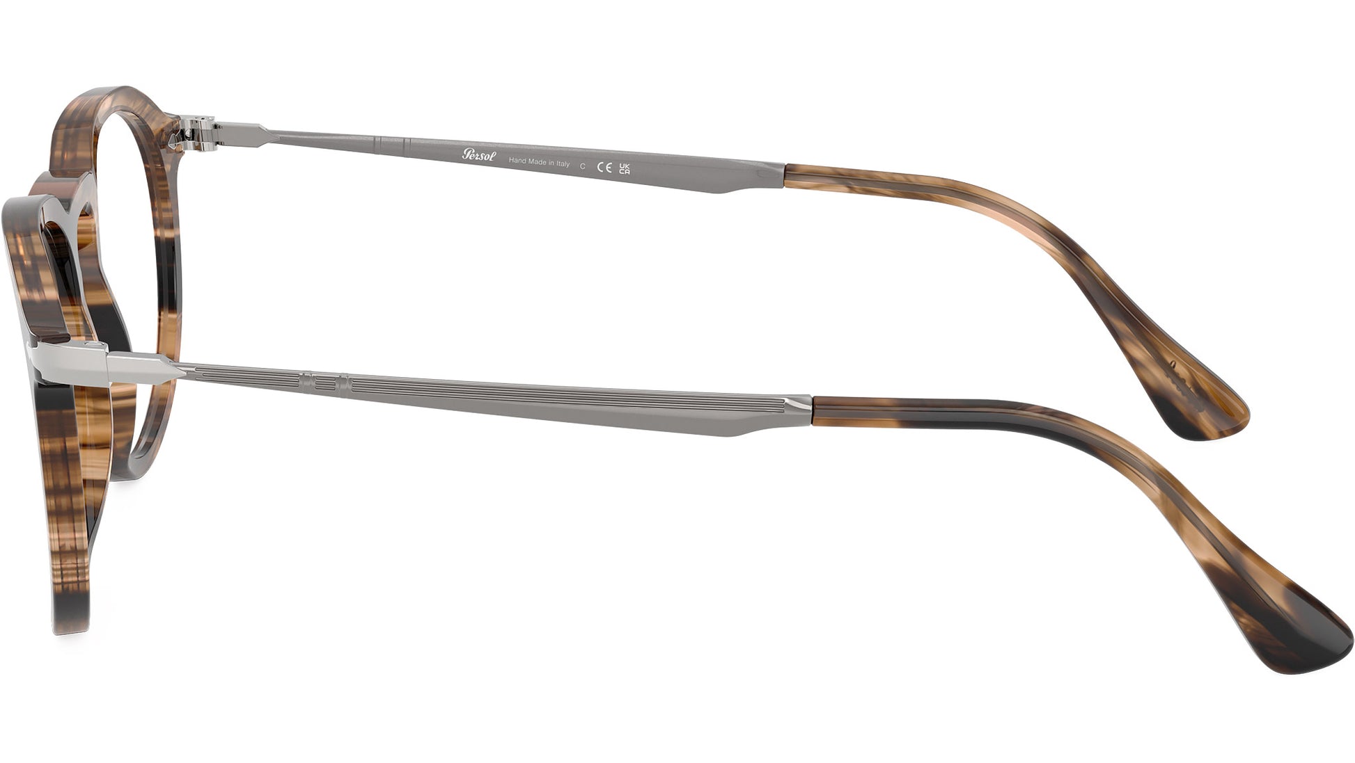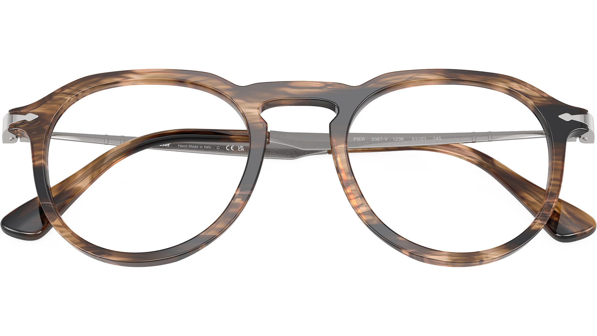 Persol glasses for men and woman model PO3387V 1236 featuring striped black & greish brown acetate frame and demo lenses. High bridge fit. Frame line: Icona Galleria. Brand code: 0PO3387V. Color code: 1236. Authorised Persol Eyewear Online Reseller. Your glasses will come including the original case and accessories and will be covered by 12 month global warranty.
