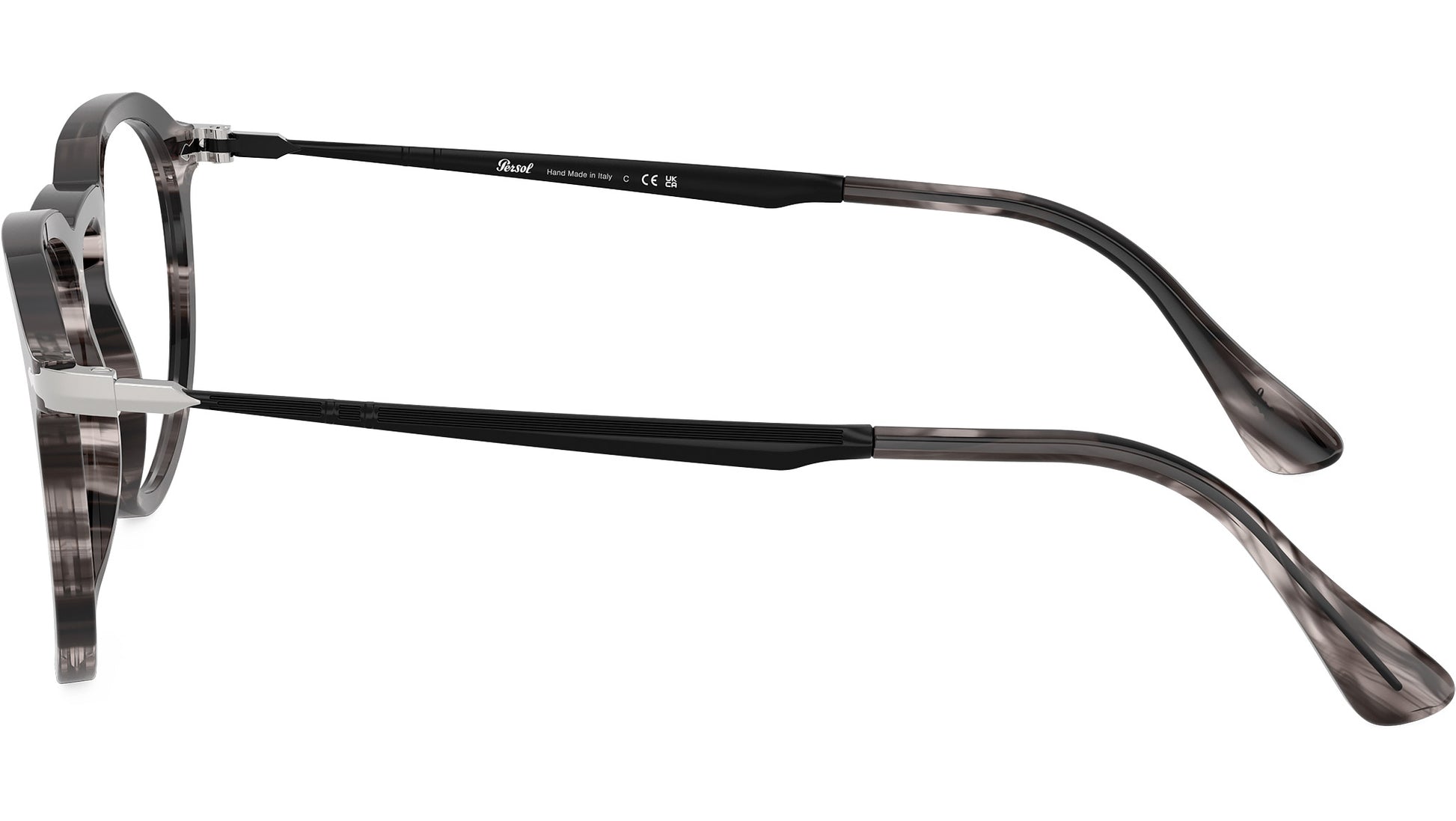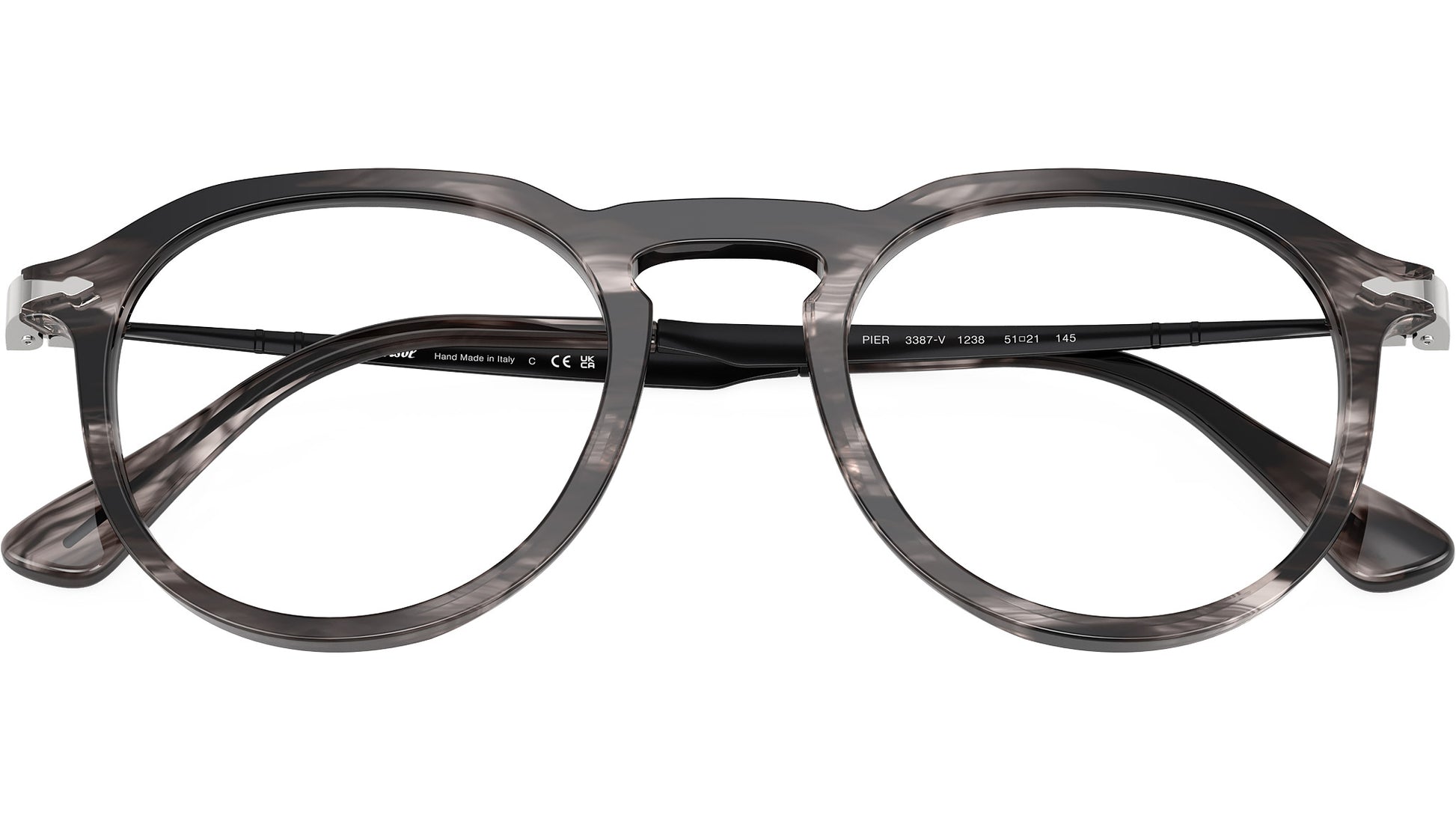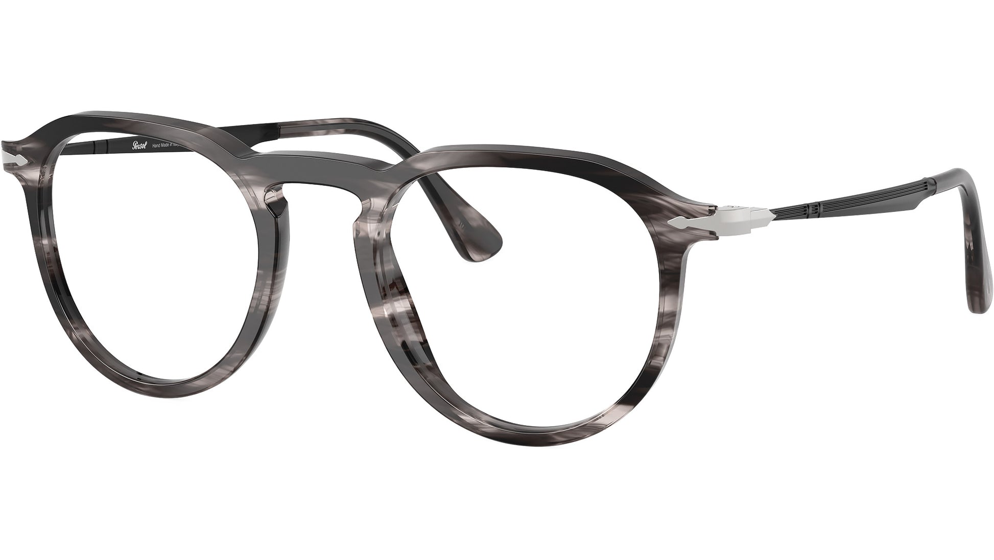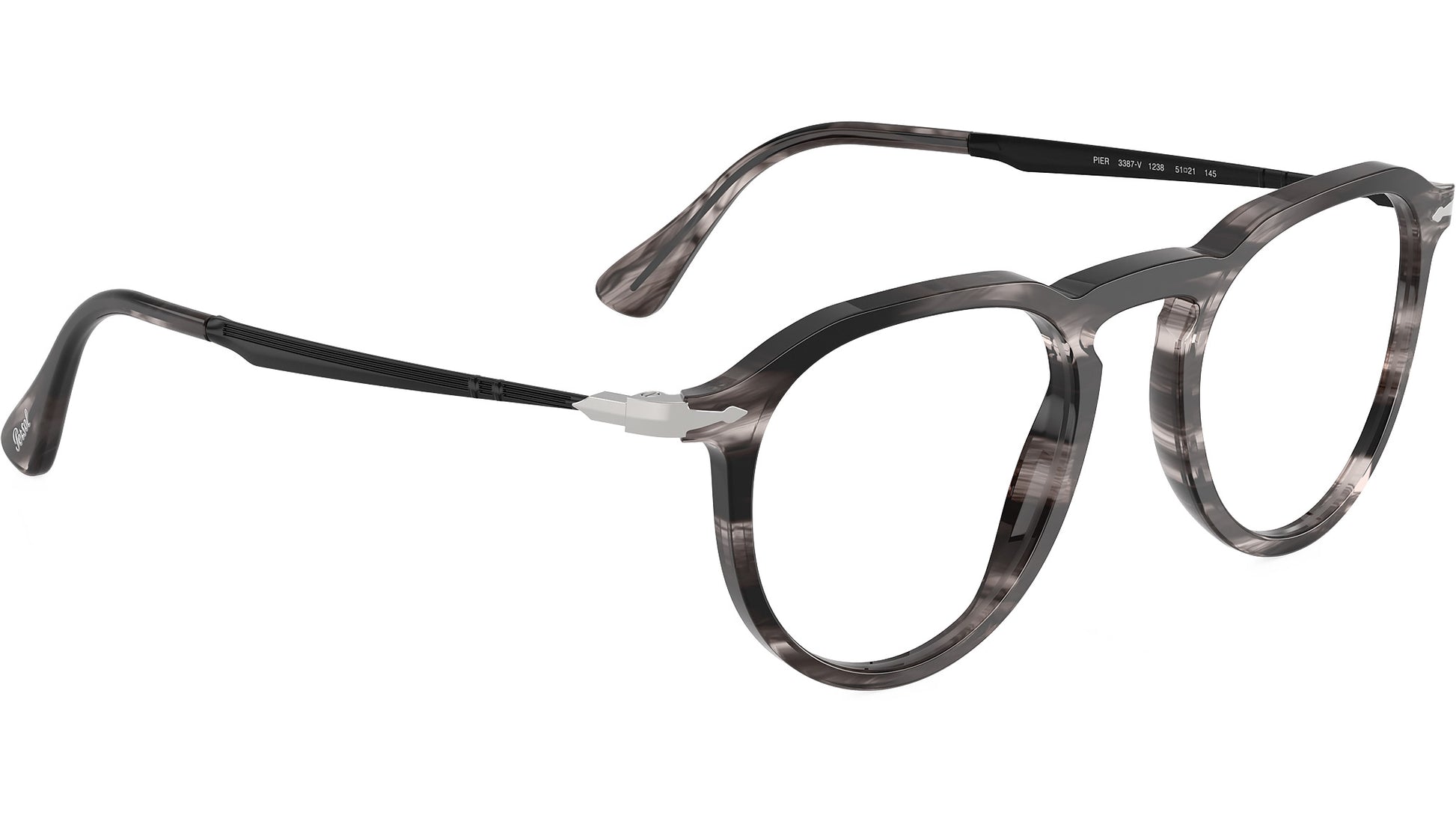 Persol glasses for men and woman model PO3387V 1238 featuring striped black & grey acetate frame and demo lenses. High bridge fit. Frame line: Icona Galleria. Brand code: 0PO3387V. Color code: 1238. Authorised Persol Eyewear Online Reseller. Your glasses will come including the original case and accessories and will be covered by 12 month global warranty.