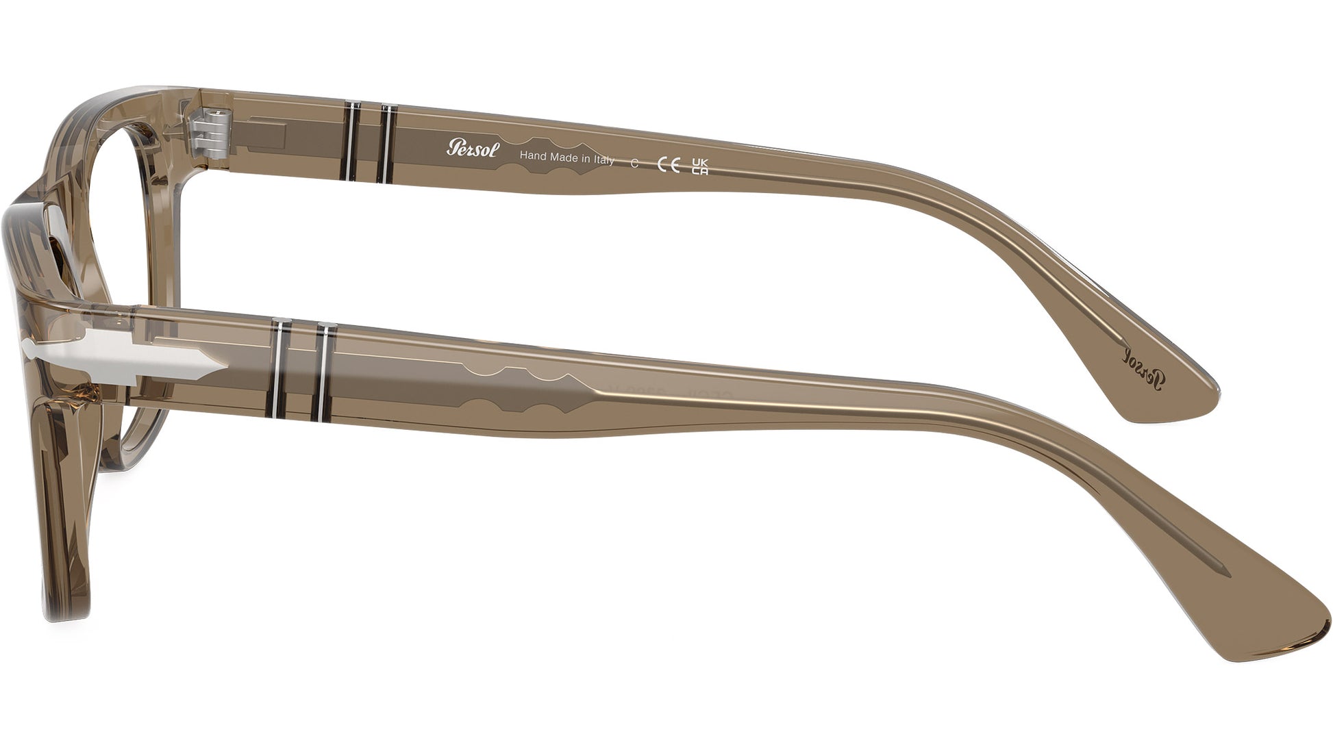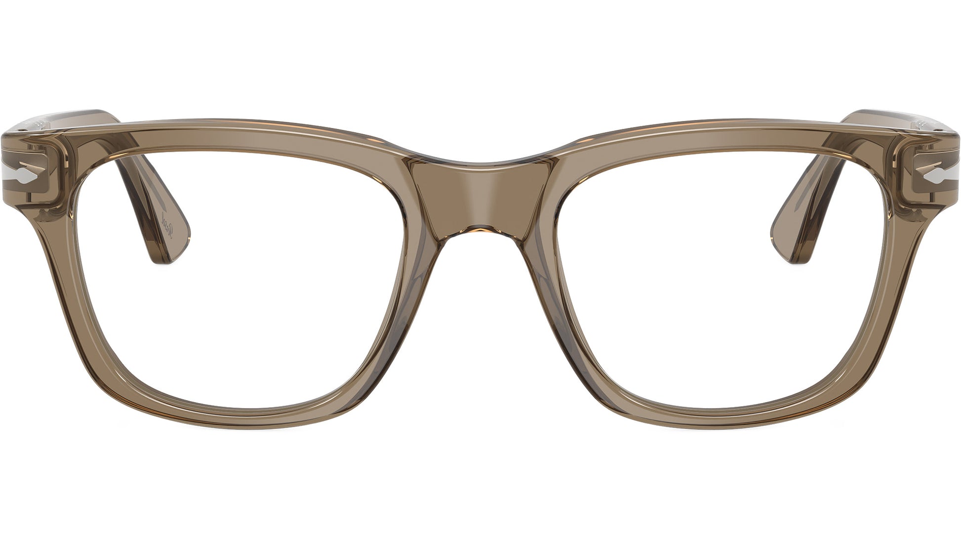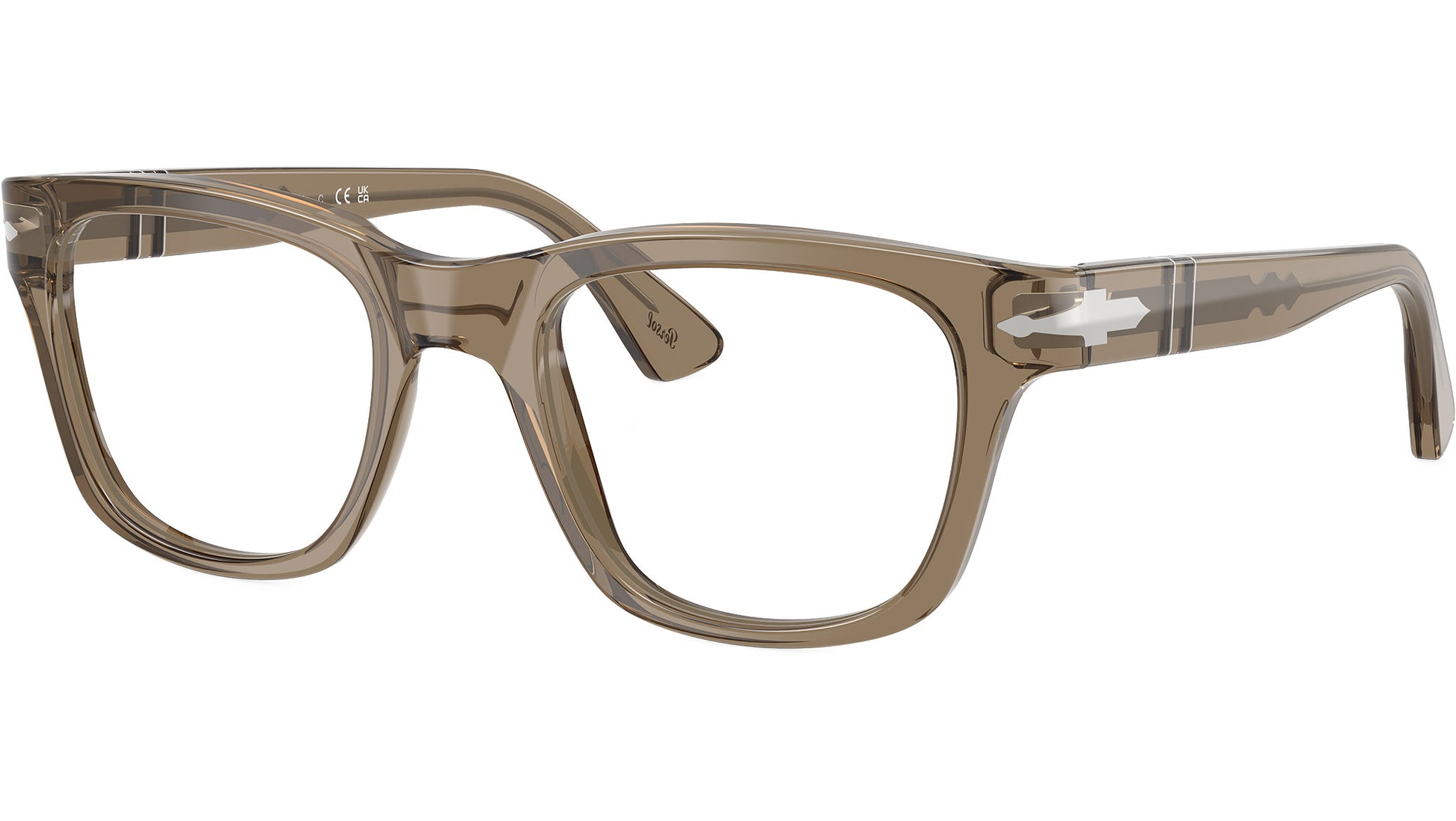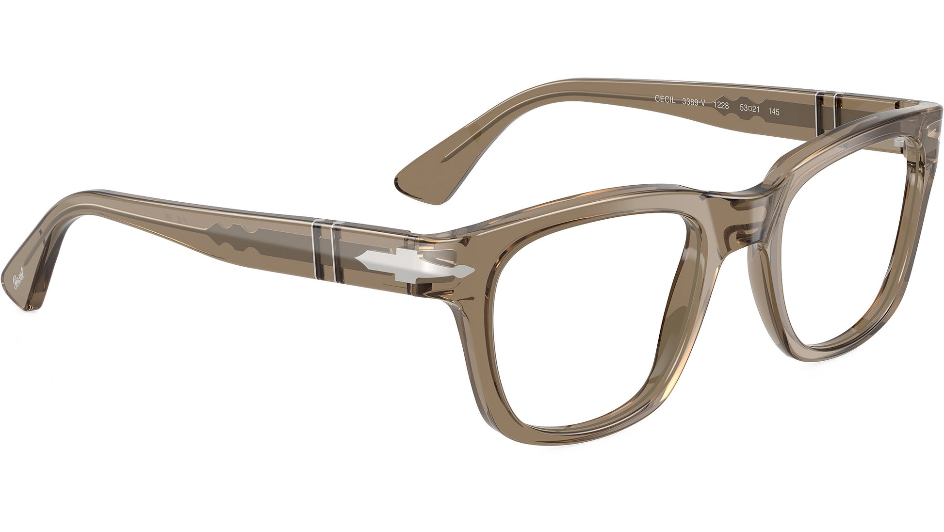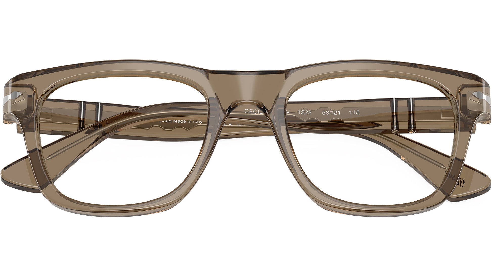 Persol glasses for men and woman model PO3389V 1228 featuring transparent brown acetate frame and demo lenses. High bridge fit. Frame line: Icona Officina. Brand code: 0PO3389V. Color code: 1228. Authorised Persol Eyewear Online Reseller. Your glasses will come including the original case and accessories and will be covered by 12 month global warranty.