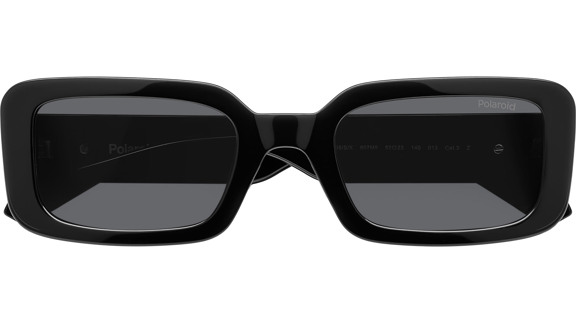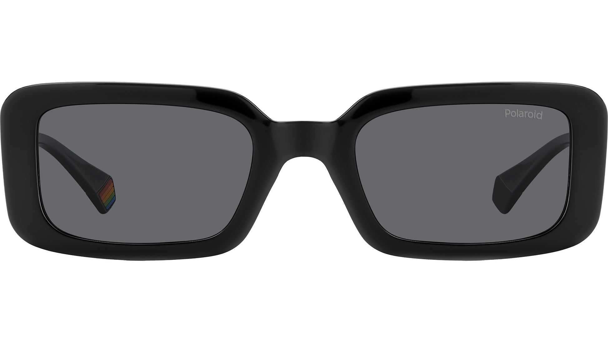 Polaroid PLD 6208/S/X 807 M9 sunglasses for women, featuring black rectangular polycarbonate frame and grey polarized lenses. These women's sunglasses by Polaroid are perfectly on-trend. Their stylish rectangular shape is created by bold proportions and maxi temples with a metal insert at the hinges. The Polaroid logo on the temples and the rainbow detail on the inside of the end tips add the finishing touches to a look that’s made for trend-setters. This style can be fitted with prescription lenses. Brand line: Cool. Style code: 206331. Color code: 807 M9. Authorized Polaroid online reseller. Your glasses will include the original case and accessories and are covered by a 12-month global warranty.
