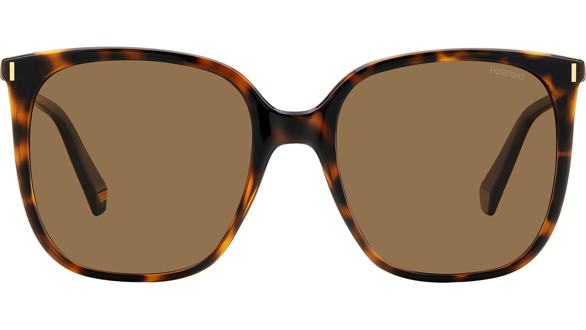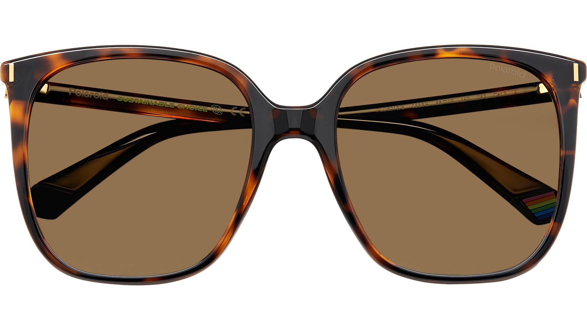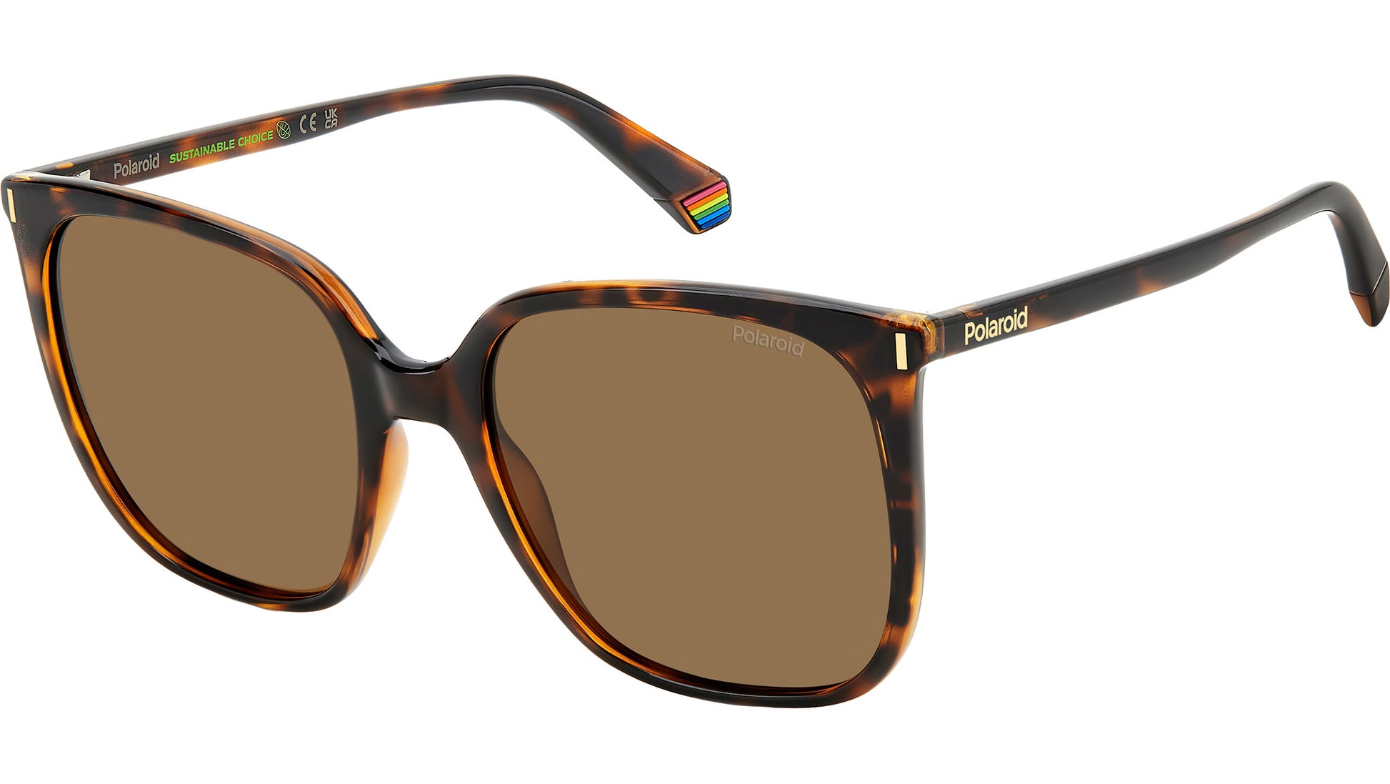 Polaroid PLD 6218/S 086 SP sunglasses for women, featuring havana squared polycarbonate frame and bronze polarized lenses. Slender shapes, playful details, and sustainable materials: a perfect trio in these Polaroid sunglasses for women. Fans of glamorous looks will love the butterfly shape of the lenses, which are polarized and trimmed by the Polaroid logo. Slender outlines create a lightweight frame, yet one that is sure to get noticed thanks to the 3D printed detail on the front. Polaroid's commitment to green fashion continues through the structure in eco-polycarbonate, offered in the season’s on-trend colours. Brand line: Cool. Style code: 206720. Color code: 086 SP. Authorized Polaroid online reseller. Your glasses will include the original case and accessories and are covered by a 12-month global warranty.