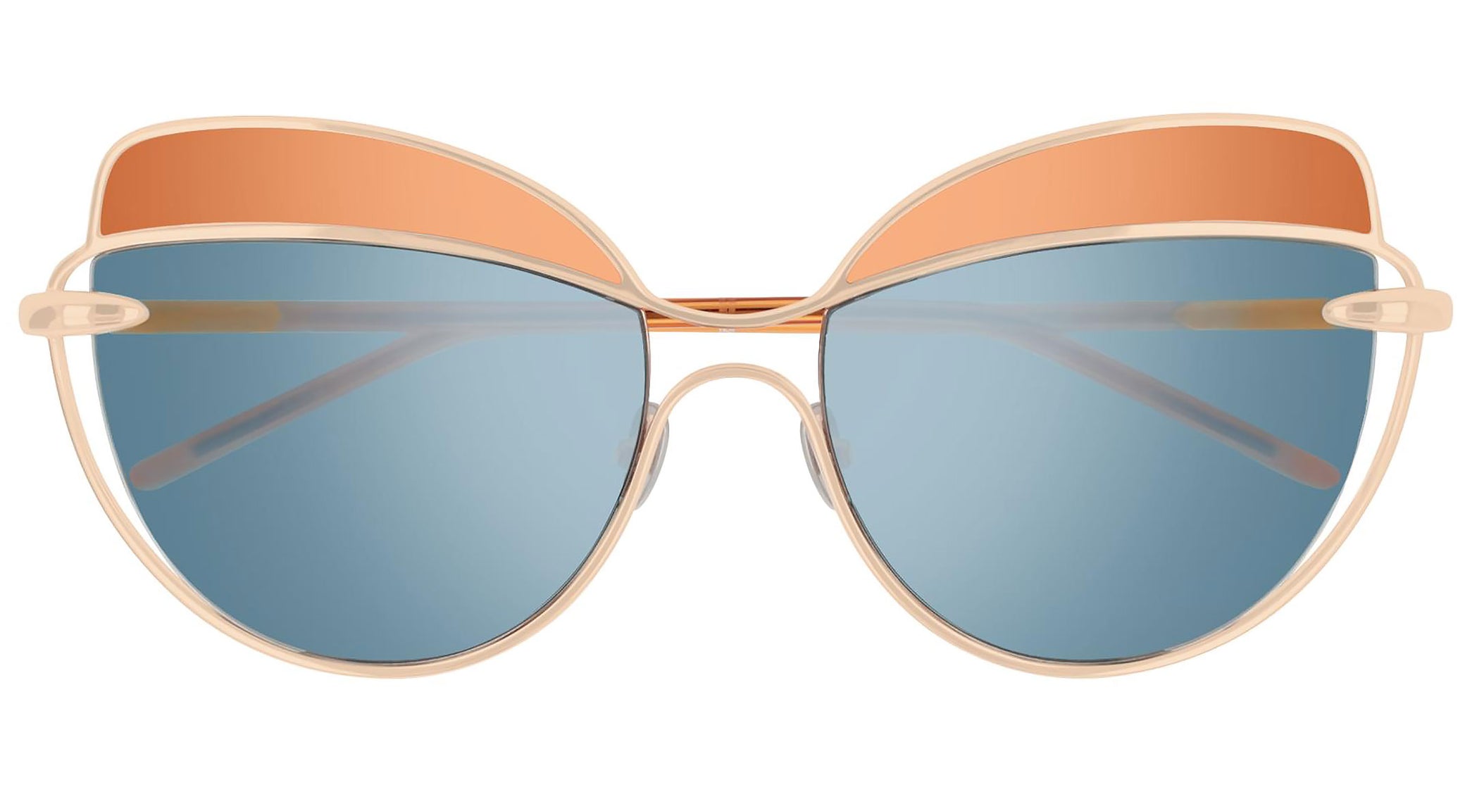 Pomellato sunglasses collection model PM0056S 003 featuring shiny pink gold/turquoise frame and light blue lens. The eyewear collection reflects the iconic, colorful and unconventional aesthetic of Pomellato, reinterpreting its voluptuous shapes and precious features in a covetable selection poised on the flawless balance between artisanal precision and timeless elegance.