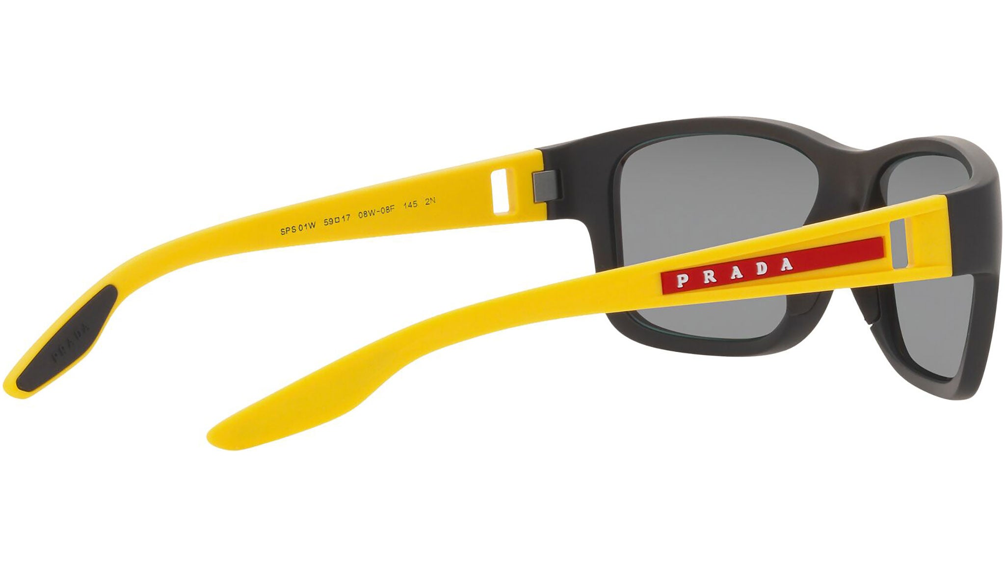 Prada Linea Rossa sunglasses model PS 01WS black rubber frame variant, color code 08W08F with dark grey mirror blue / red hydr lens. Prada Linea Rossa Sun Collection conveys an everyday casual style with all the quality and craftsmanship of the Prada brand.