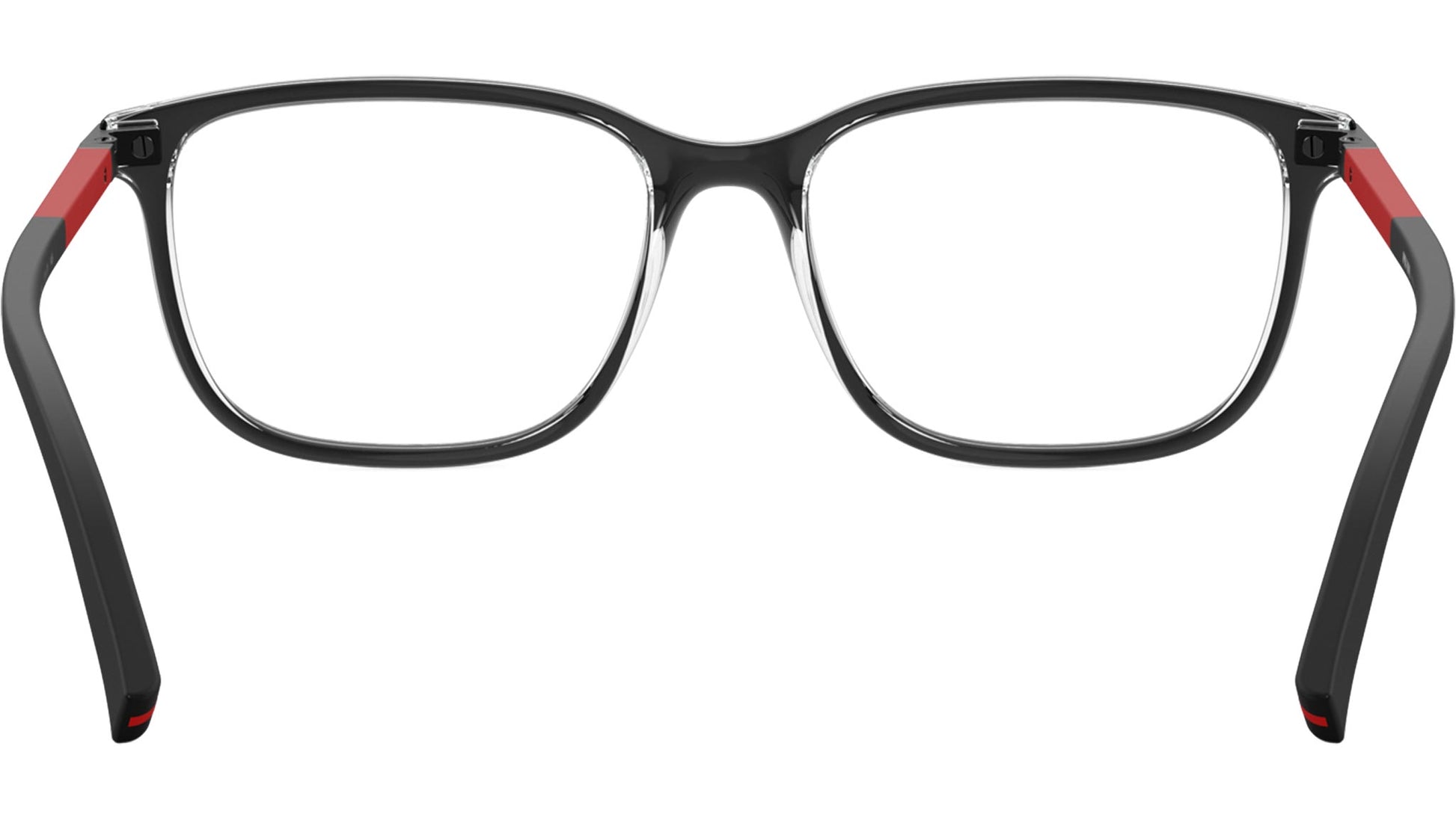 Prada Linea Rossa PS 02RV 03I1O1 glasses for men, featuring top matte black on crystal d-frame injection frame and demo lenses. High bridge fit. Brand line: Lifestyle. Style code: PS02RV. Color code: 03I1O1. Made in Italy. Authorized Prada Sport online reseller. Your glasses will include the original case and accessories and are covered by a 12-month global warranty.
