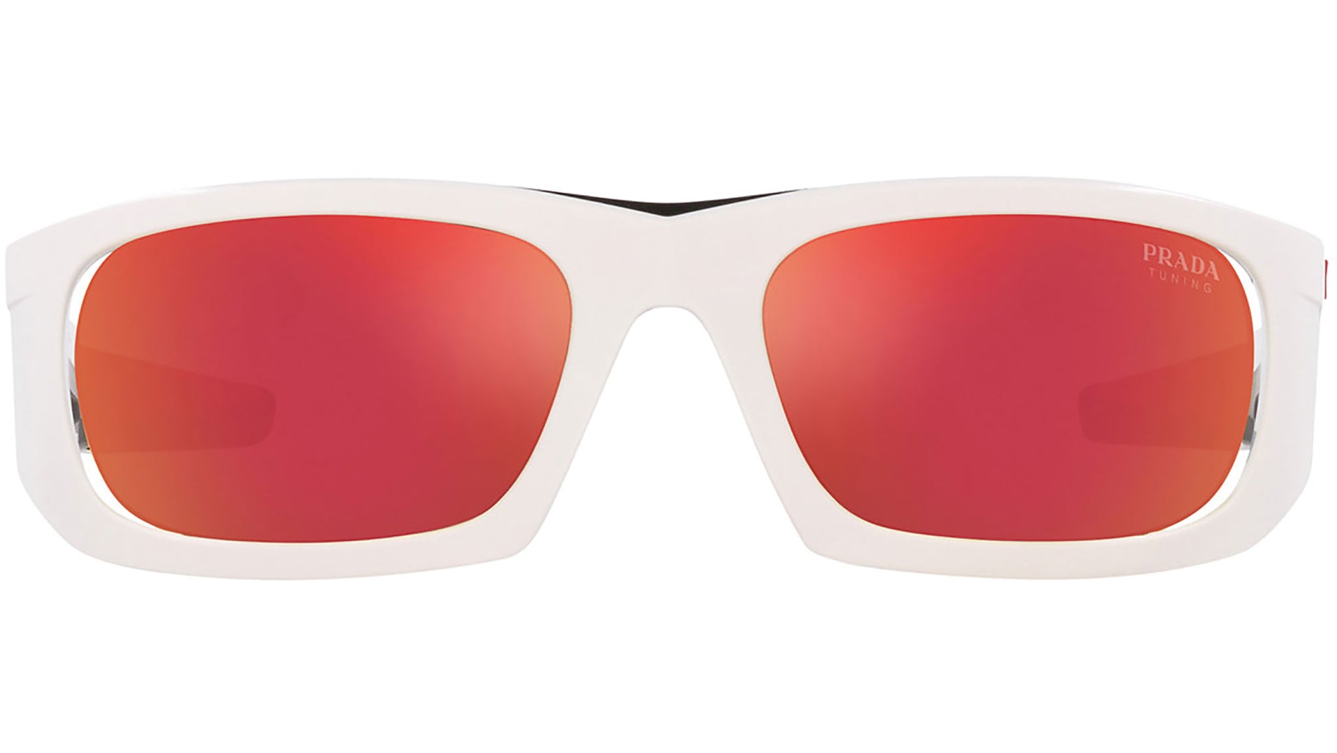 Prada Linea Rossa sunglasses model PS03QS matte white / black frame variant, color code AAI04U with orange multilayer tuning lens. Prada Linea Rossa Sun Collection conveys an everyday casual style with all the quality and craftsmanship of the Prada brand.