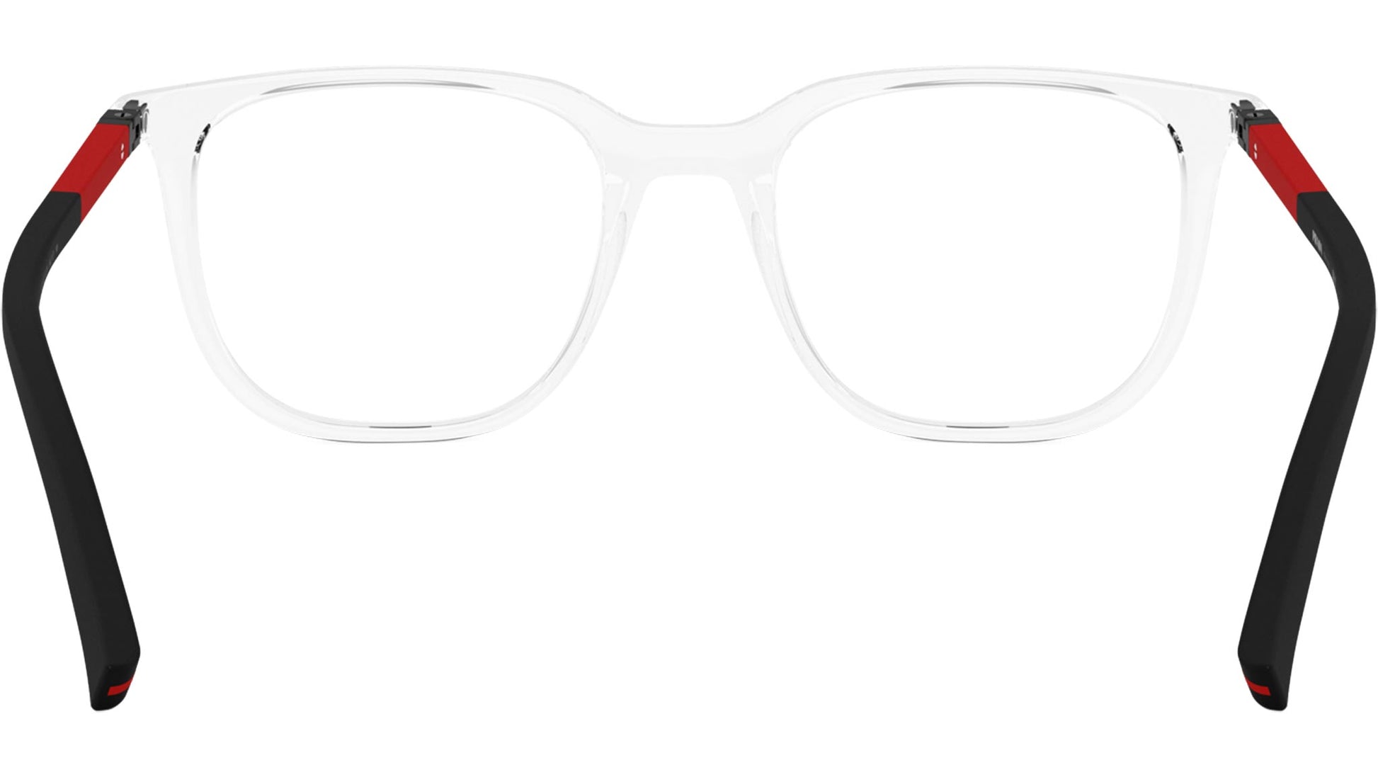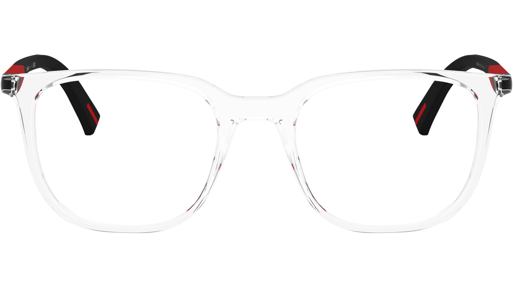 Prada Linea Rossa PS 04RV 2AZ1O1 glasses for men, featuring transparent d-frame injection frame and demo lenses. High bridge fit. Brand line: Lifestyle. Style code: PS04RV. Color code: 2AZ1O1. Made in Italy. Authorized Prada Sport online reseller. Your glasses will include the original case and accessories and are covered by a 12-month global warranty.