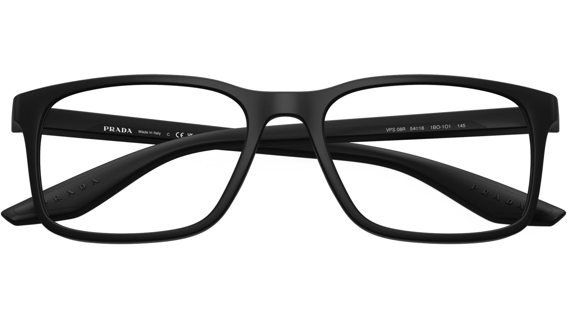 Prada Linea Rossa PS 08RV 1BO1O1 glasses for men, featuring matte black d-frame injection frame and demo lenses. High bridge fit. Brand line: Lifestyle. Style code: PS08RV. Color code: 1BO1O1. Made in Italy. Authorized Prada Sport online reseller. Your glasses will include the original case and accessories and are covered by a 12-month global warranty.